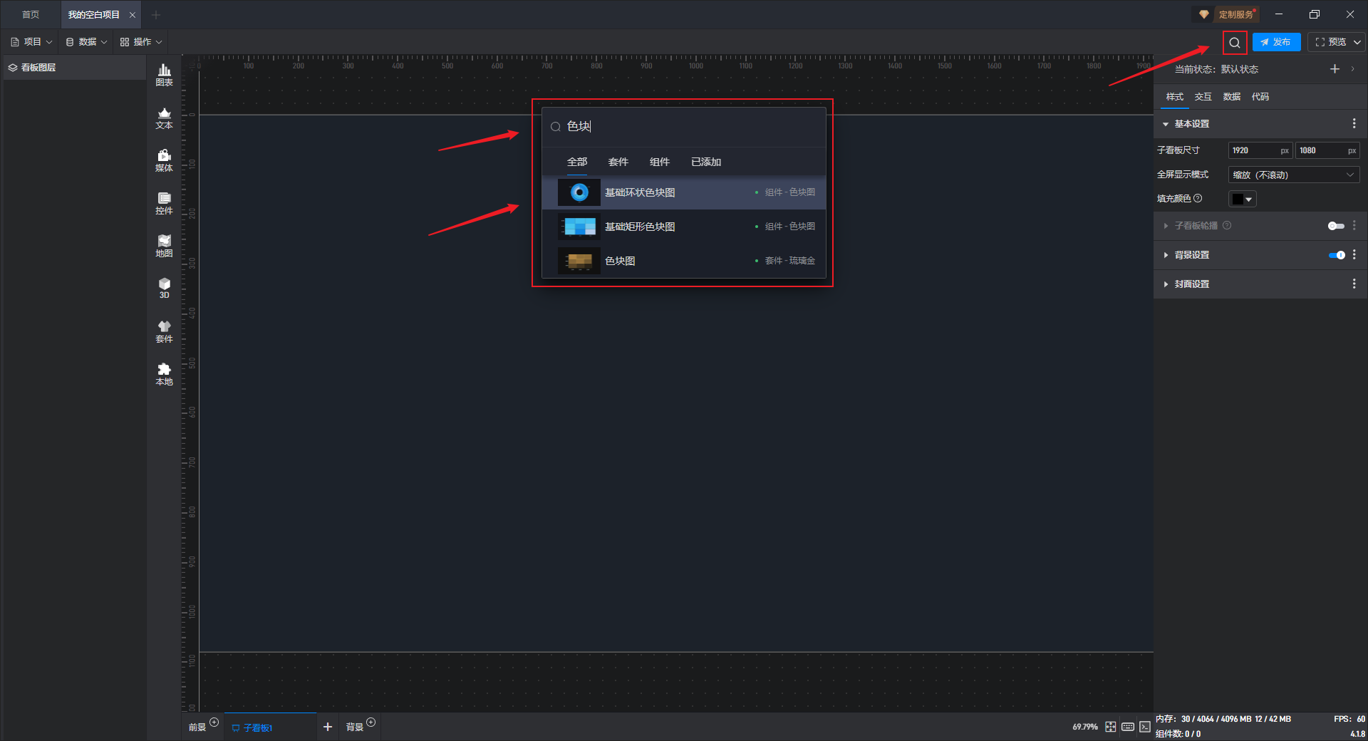 点击搜索按钮或按键盘“Ctrl+F”键打开搜索框,输入组件名称进行搜索,然后点击对应的组件进行添加。