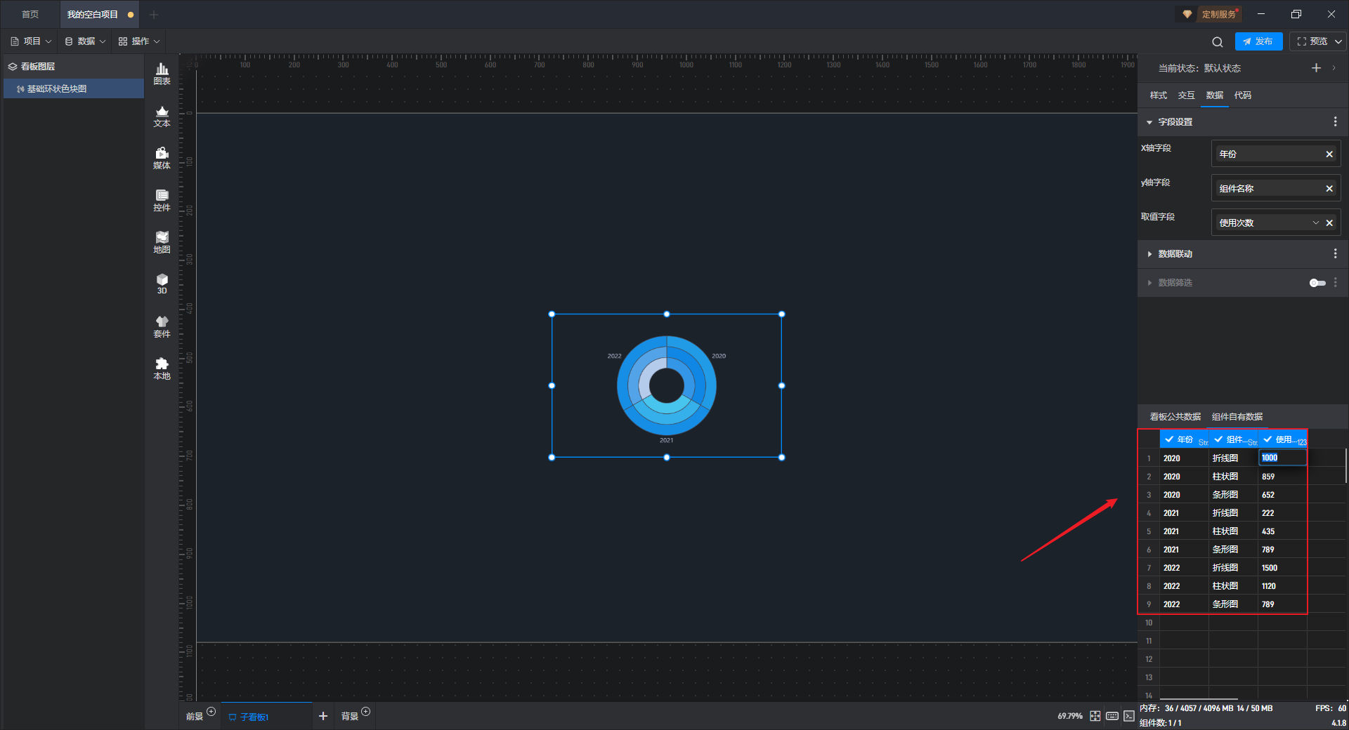 在“数据”设置界面下方可以直接修改数据,组件中的数据也会实时更新。