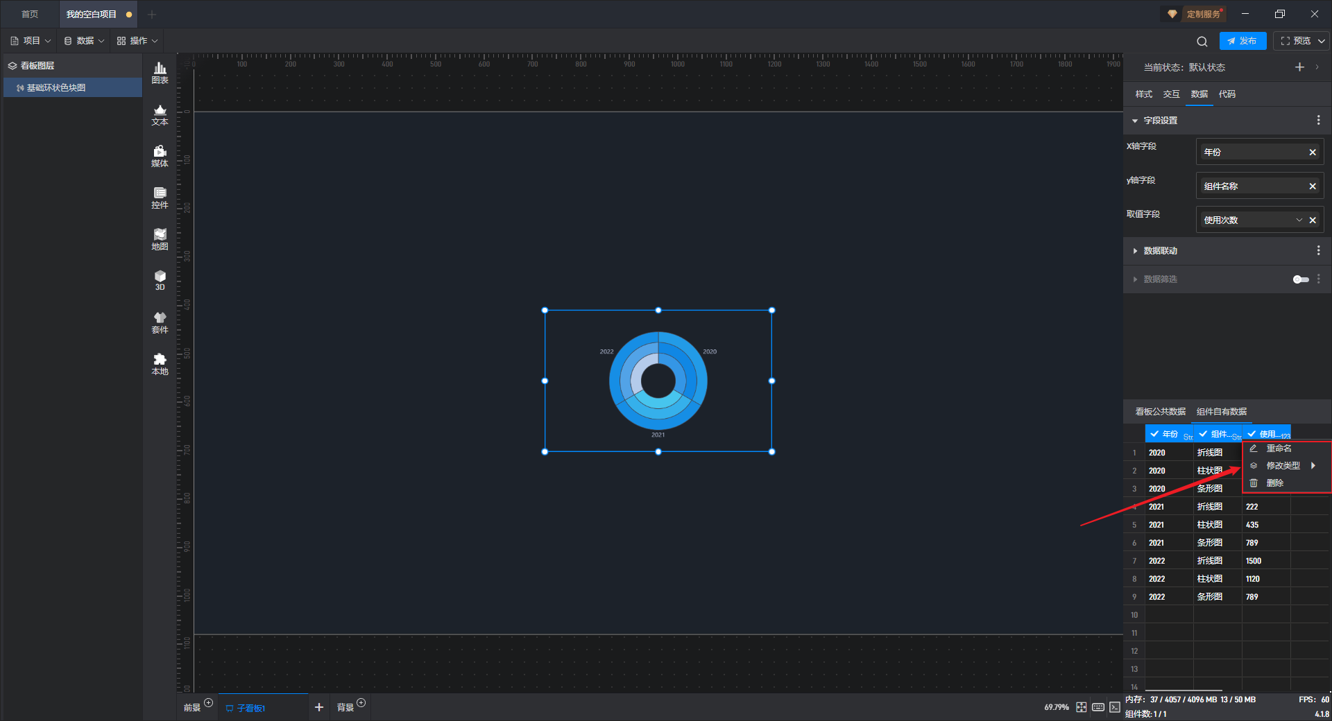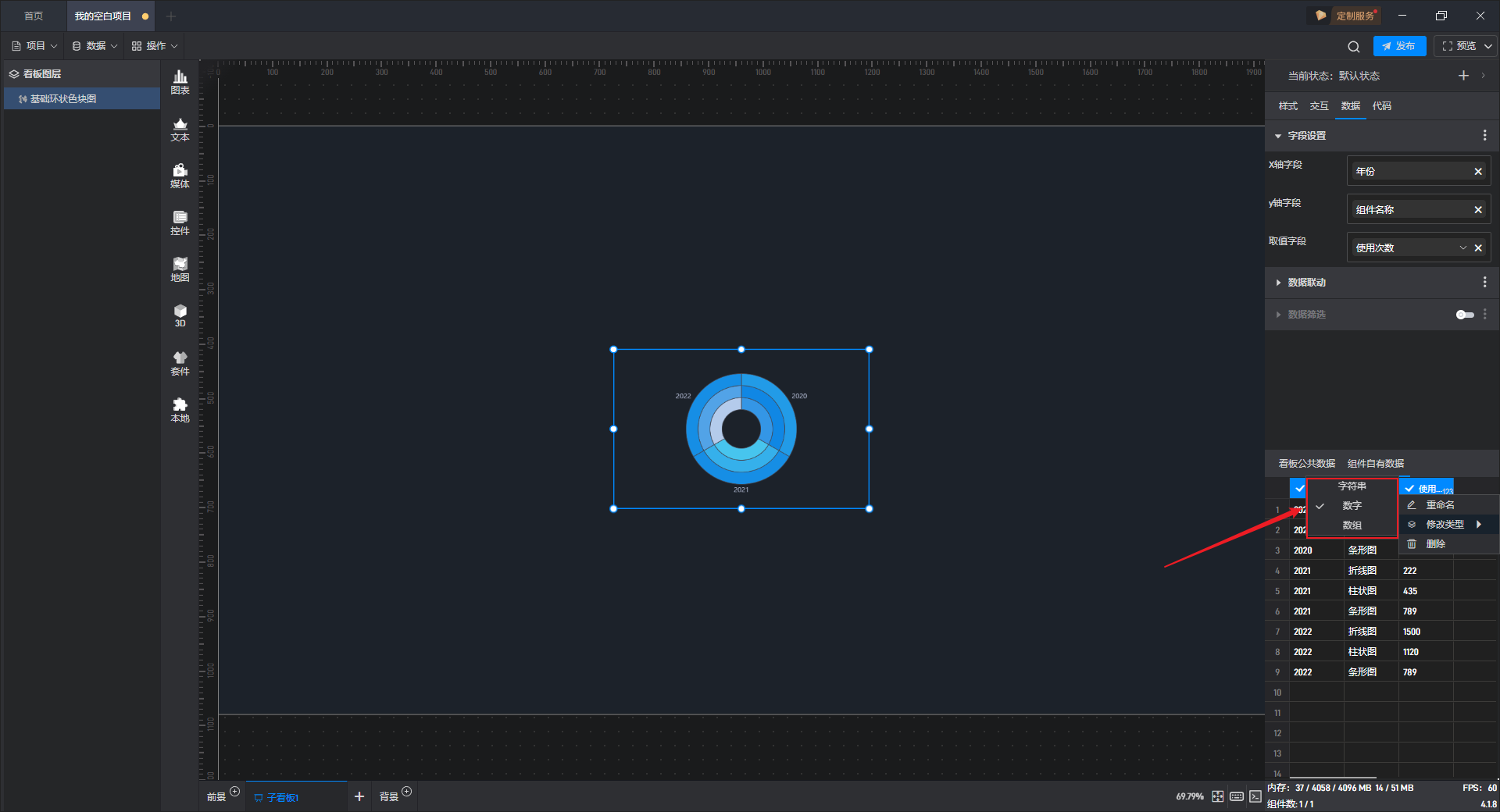 字段类型包括:字符串、数字和数组(X 轴字段和系列字段都是字符串类型,Y 轴是数字类型,数组类型用于词云组件),只有在字段类型正确的情况下,组件内容才能正常显示。