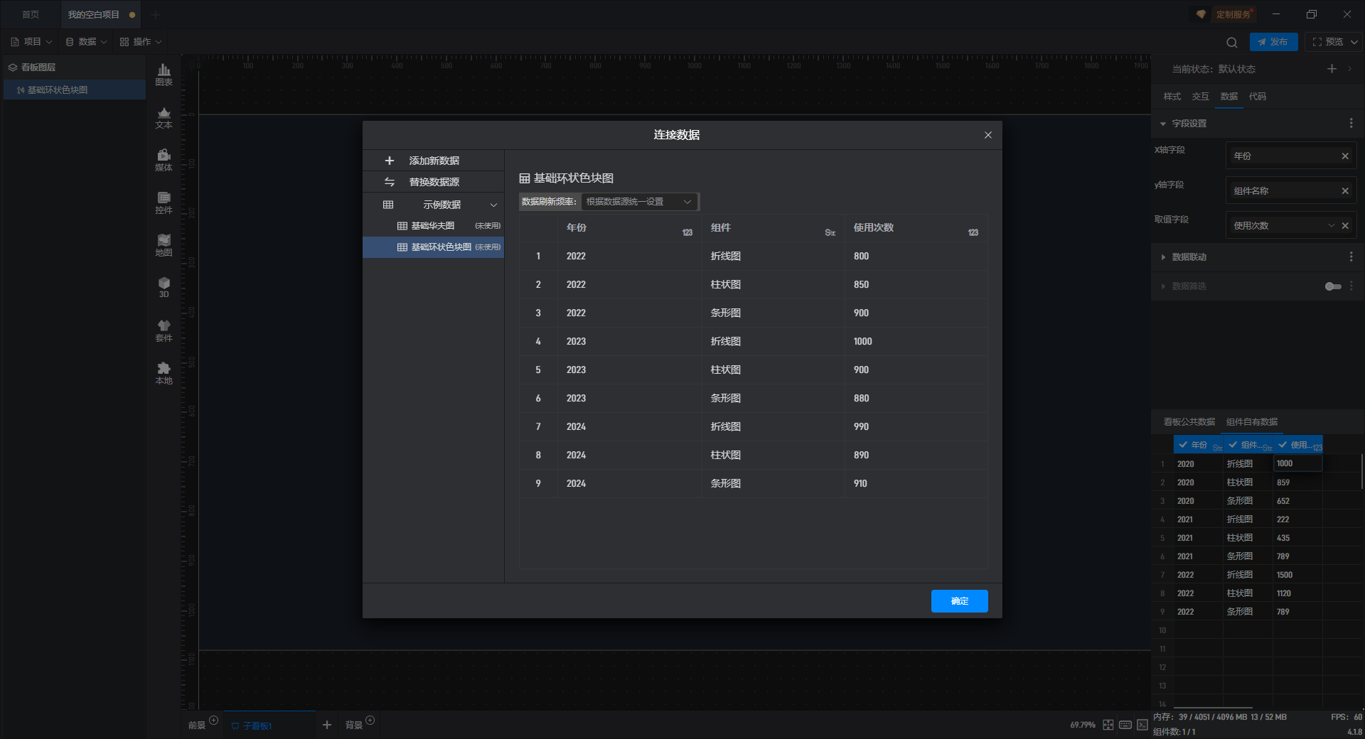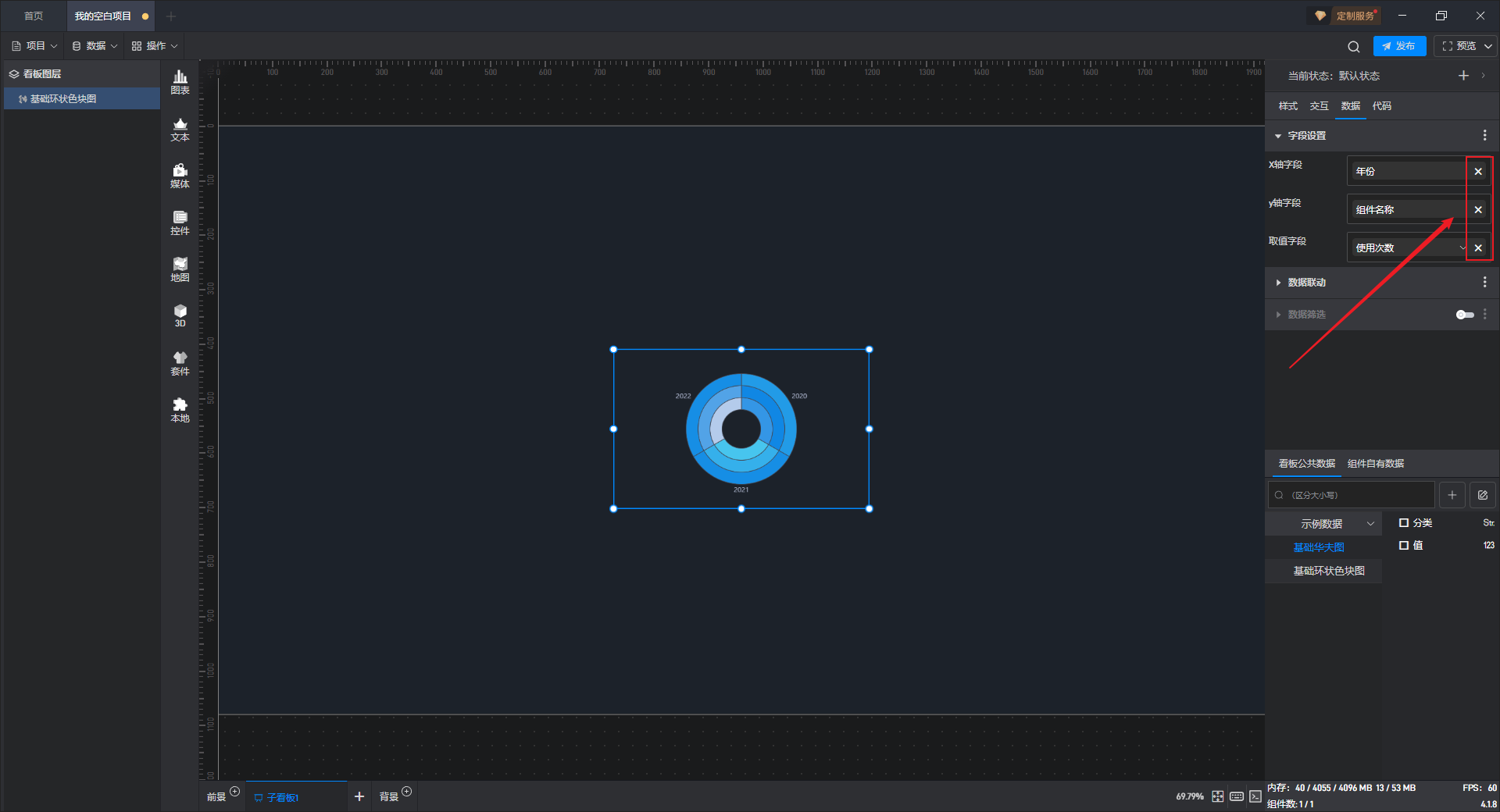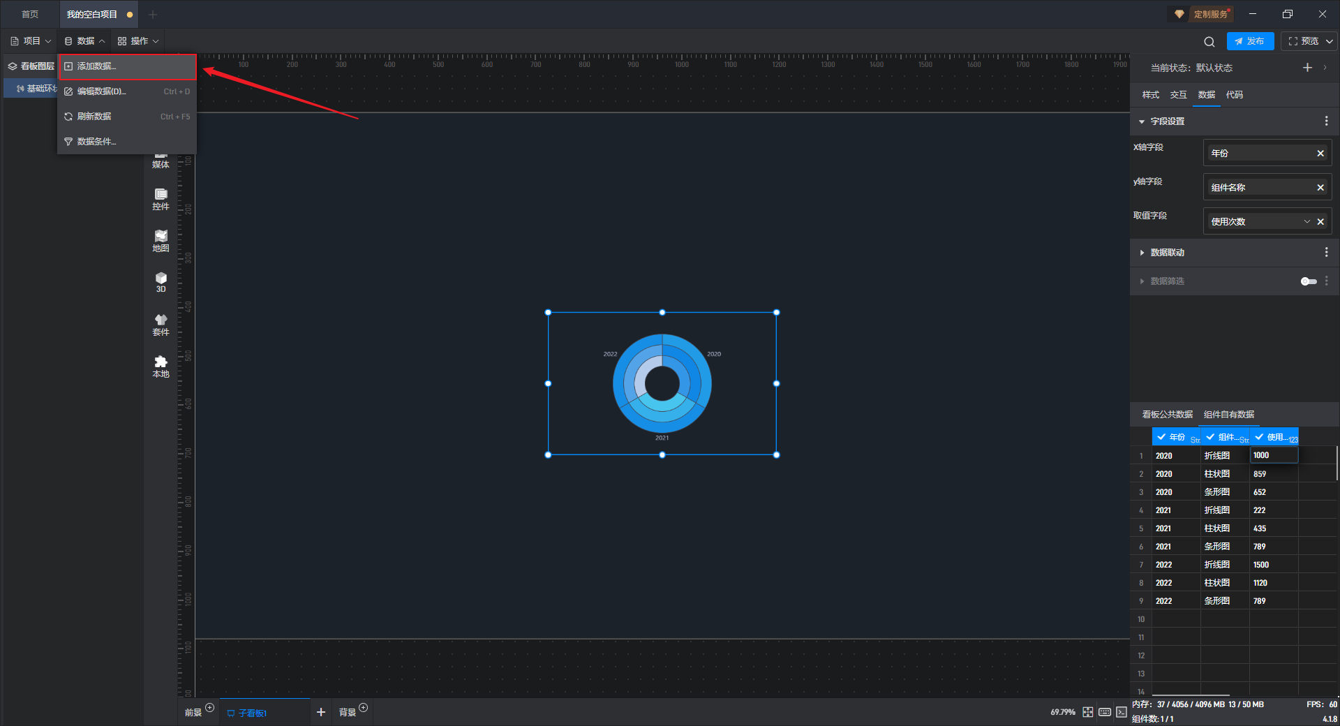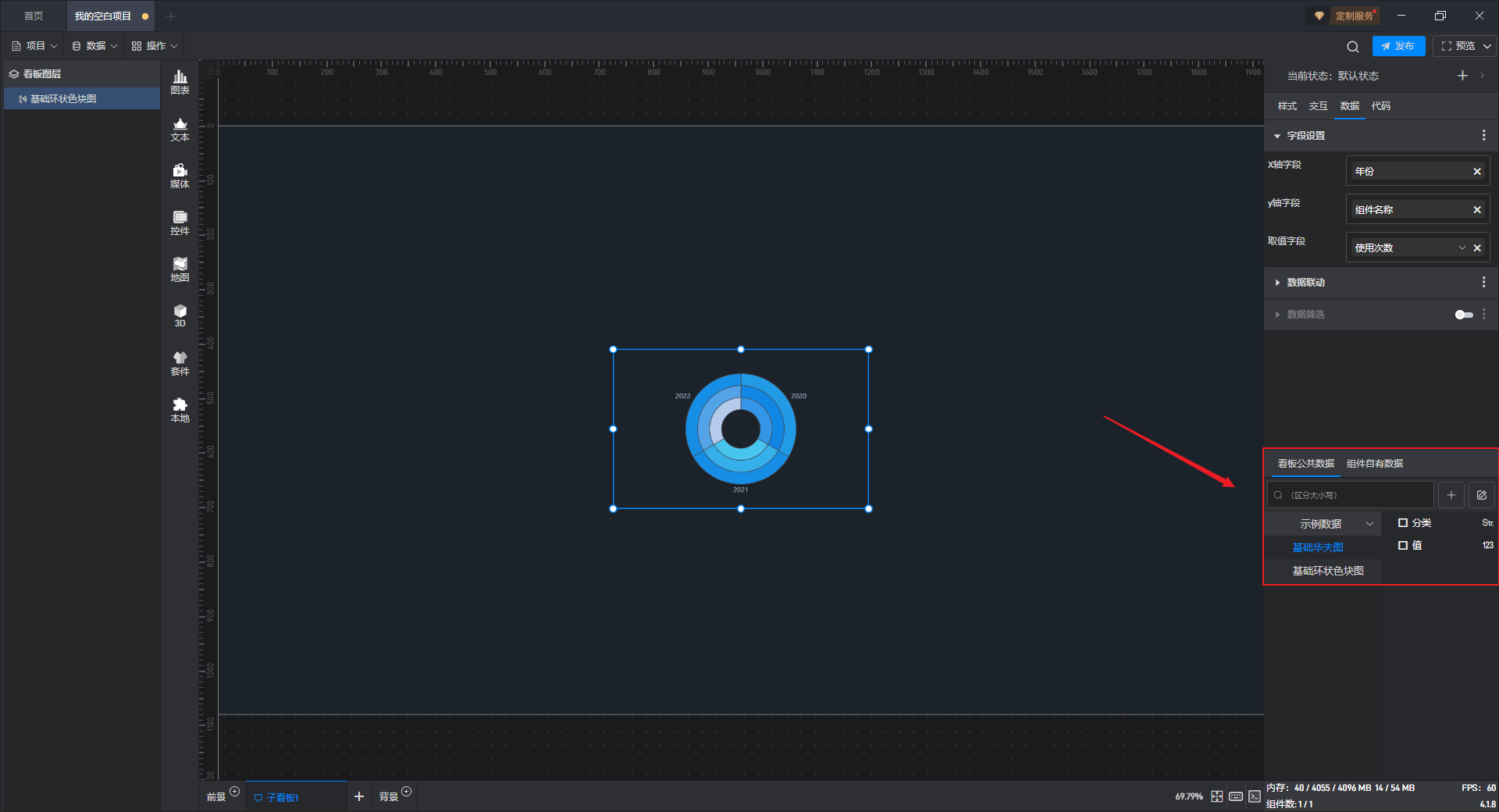 点击选中组件,在右侧“数据”设置窗口中切换到“看板公共数据”(同一个项目中所有数据源是共享的)。