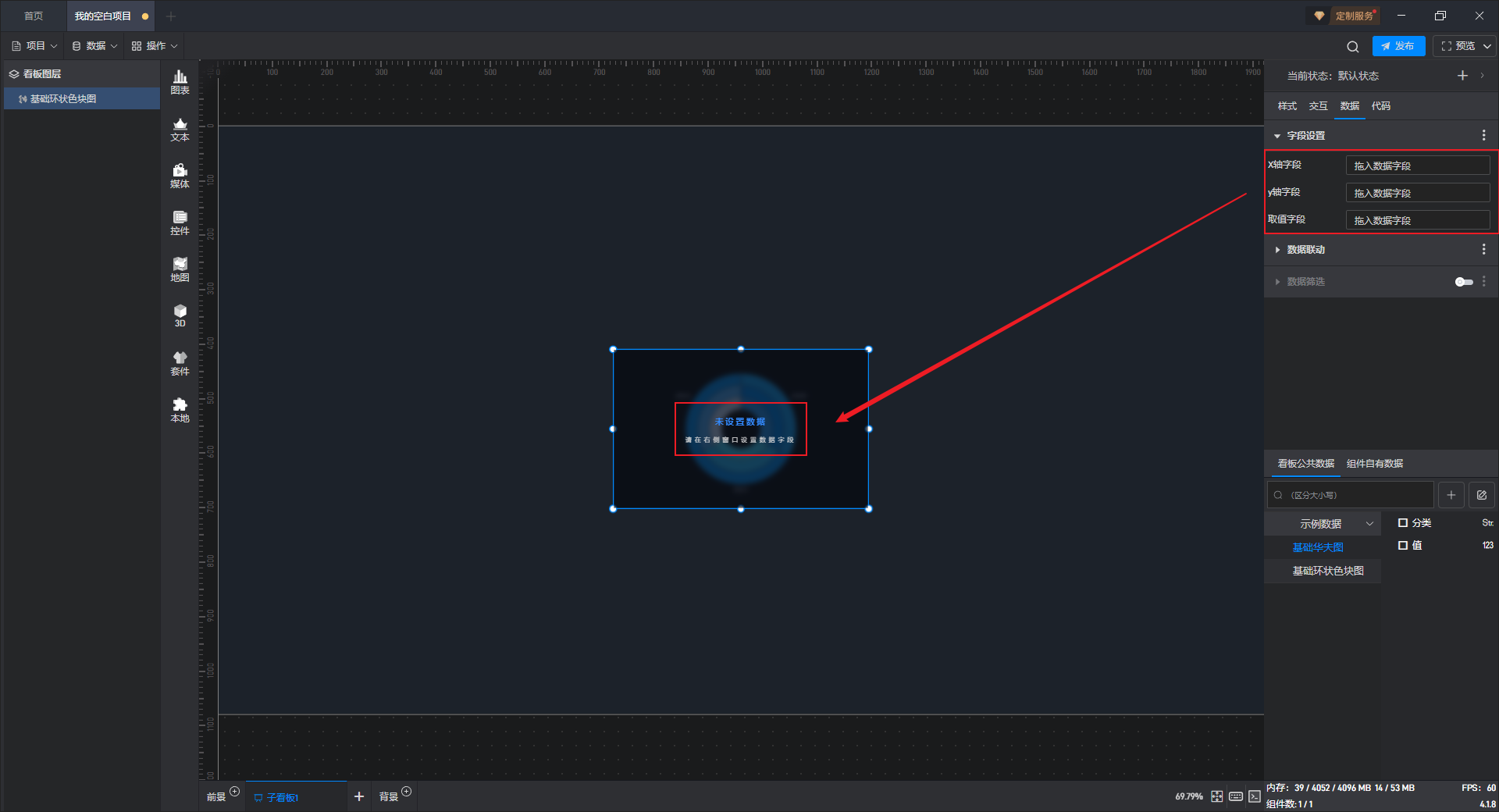 删除当前字段后,右侧字段栏为空,同时组件会提示“未设置数据”。