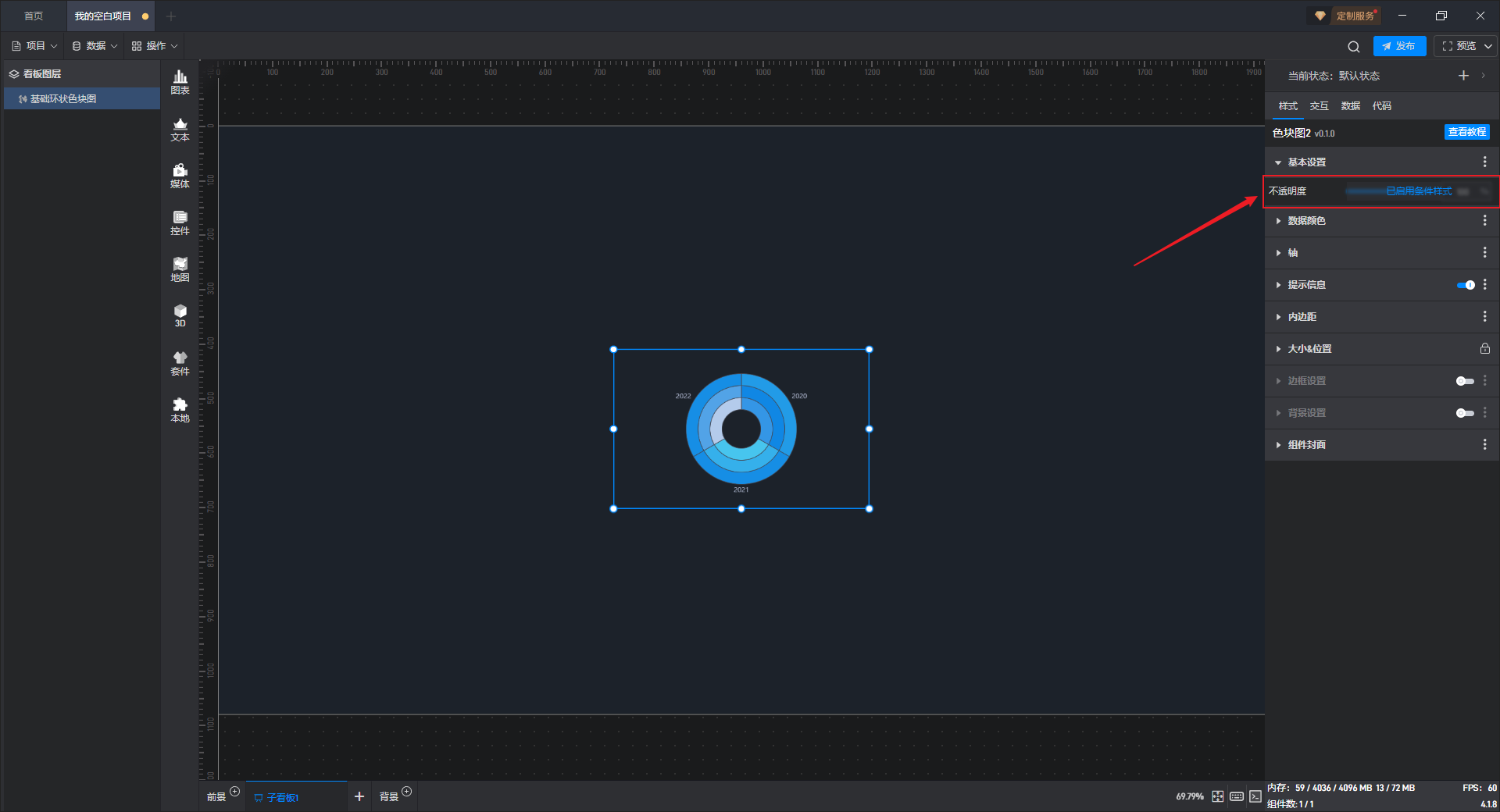 | 不透明度 | 1)根据个人喜好或整体和谐度合理地使用透明度,会让大屏布局更美观; | 2)这个设置项的一个常见用法是结合条件样式/交互/多状态来实现组件的显示和隐藏。 |