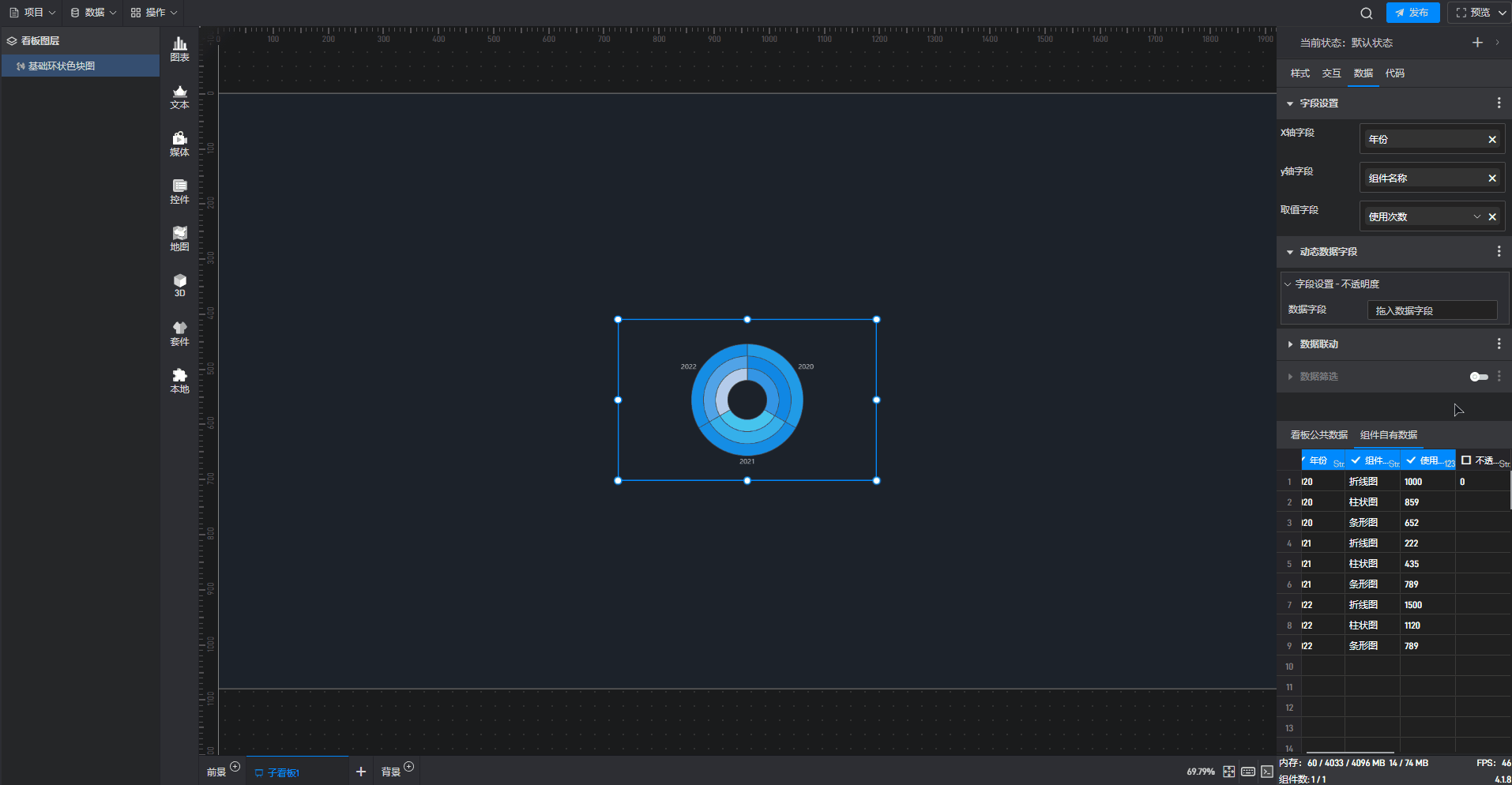 单击选中组件,在右侧“数据”设置窗口中,可以看到组件已经设置好了数据字段,且数据字段来自于“组件自有数据”。