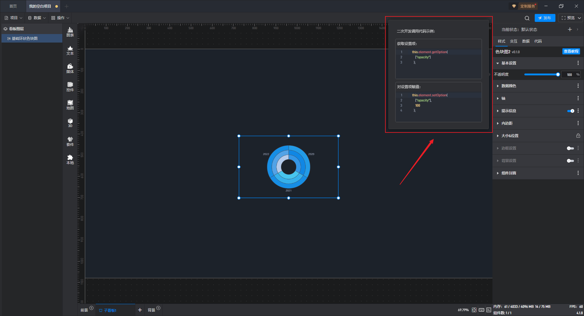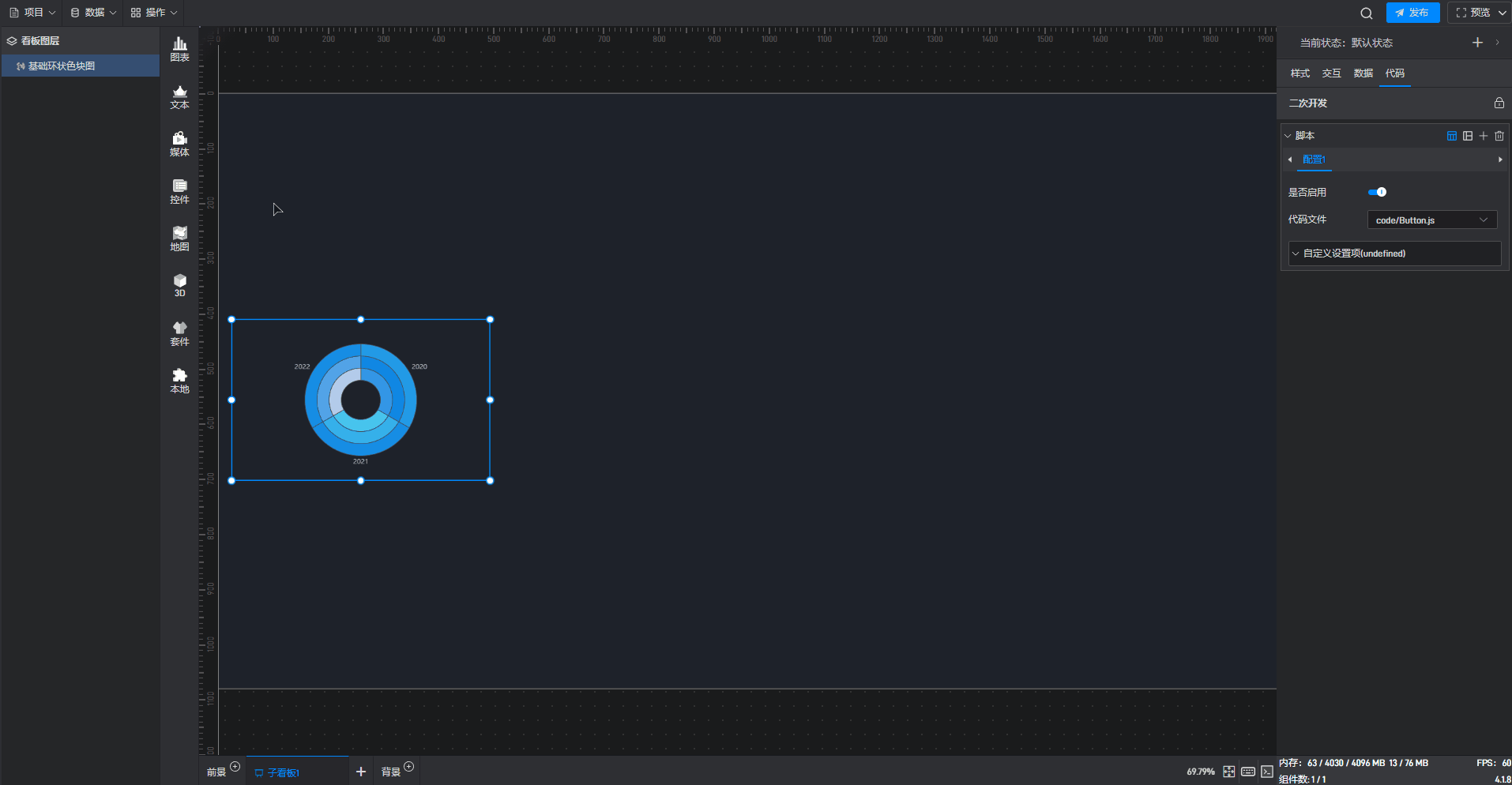 点击选中组件,在右侧设置窗口中切换到“代码”,可以对组件进行二次开发设置。