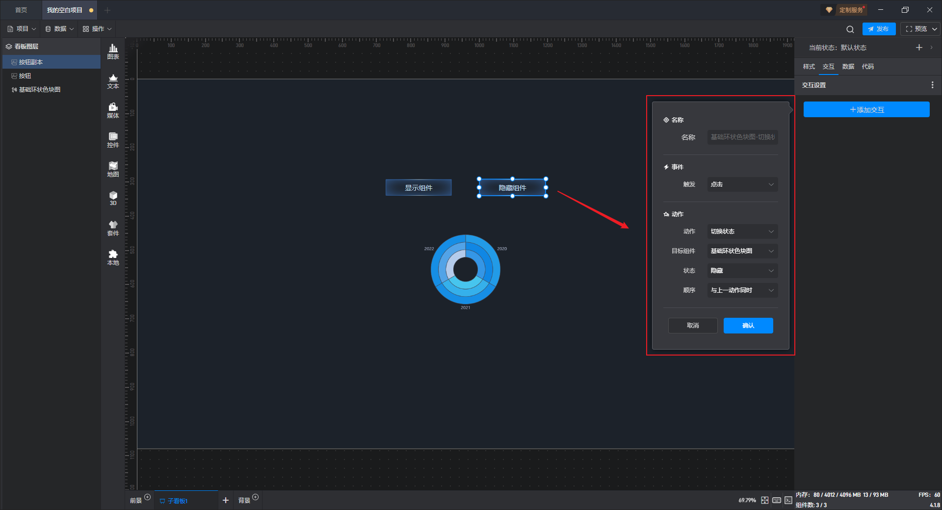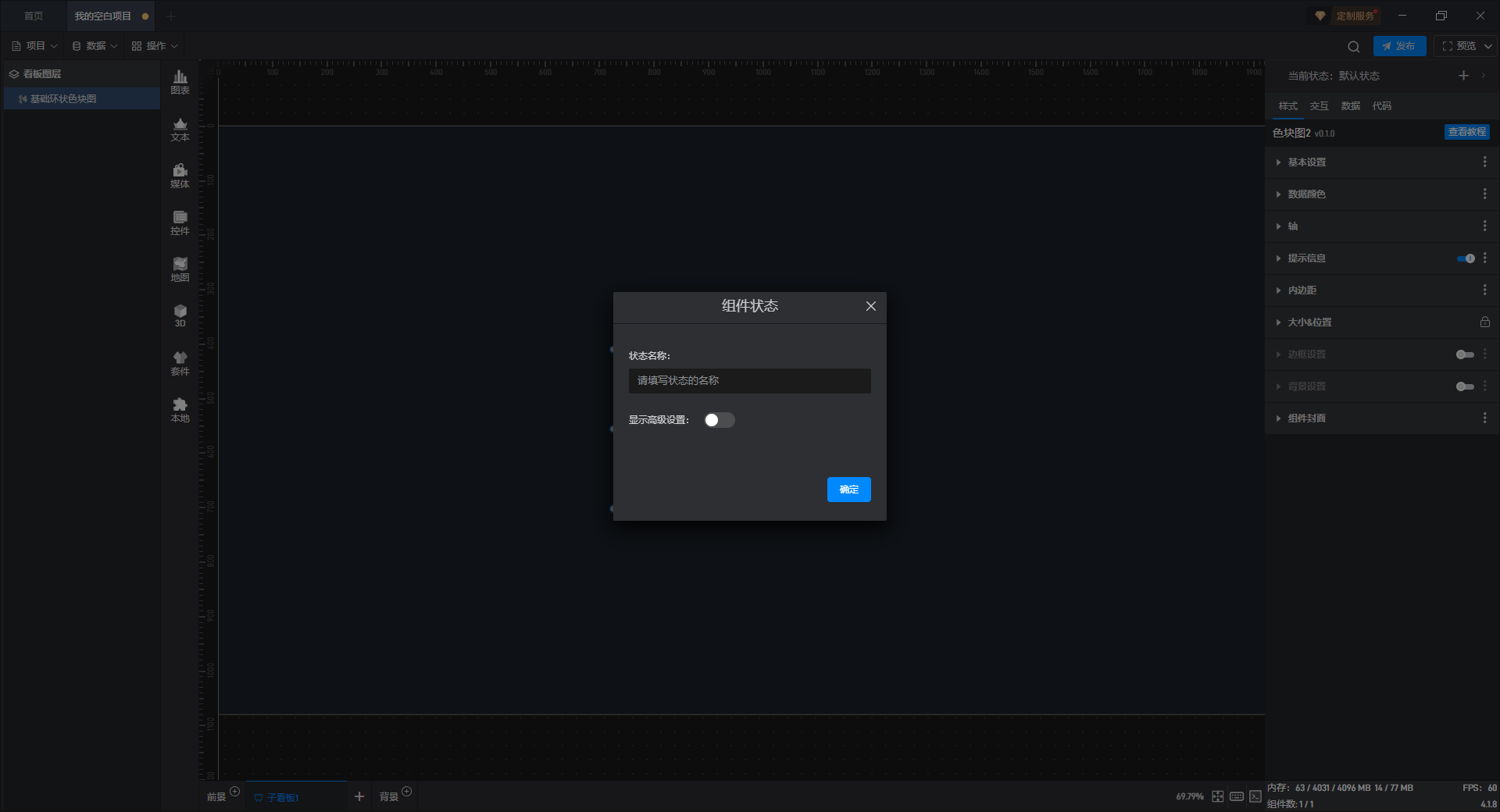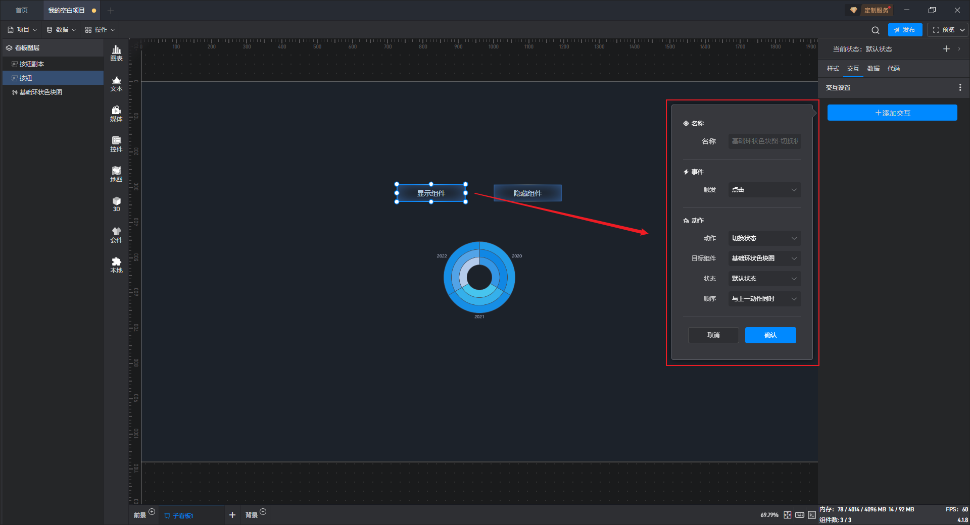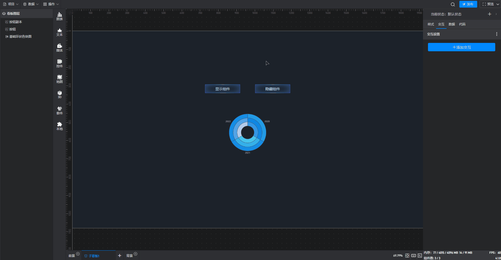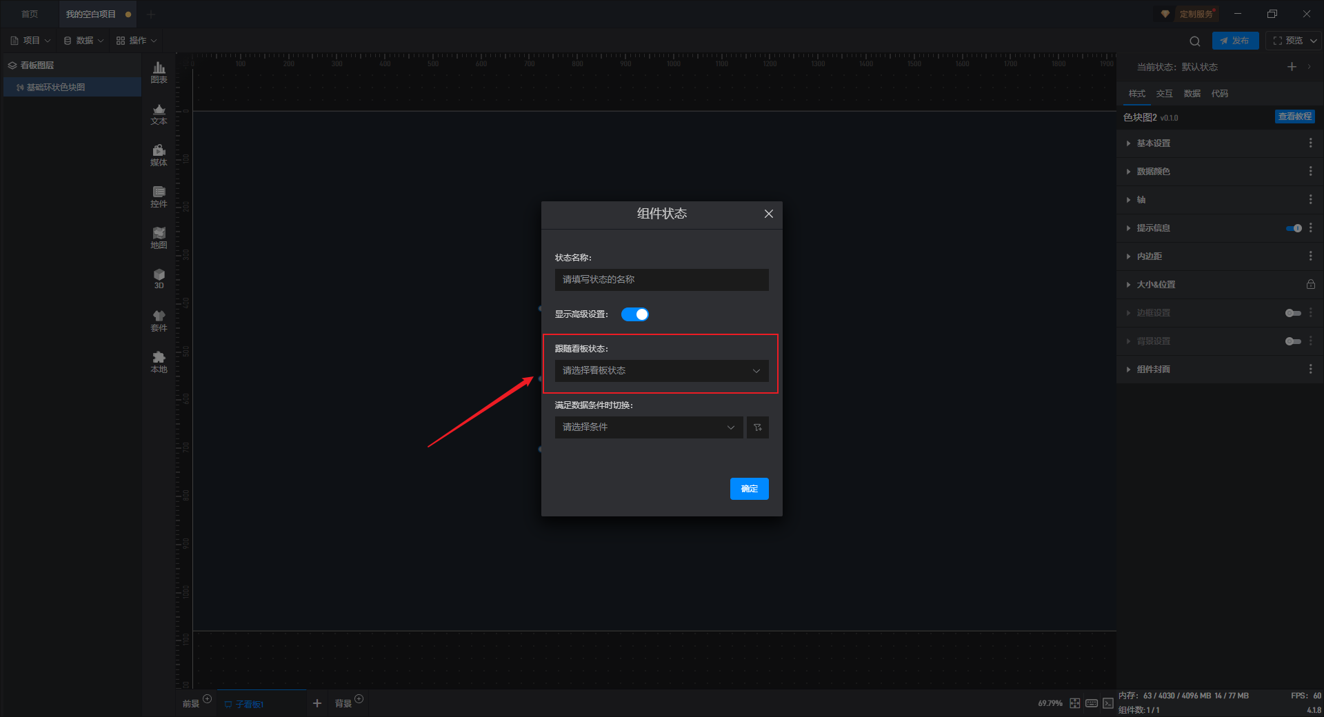 多状态主要用于通过数据条件或是点击交互(通常是点击其他组件来触发本组件的状态切换)来切换组件设置项的场景,这里的设置项包括组件的样式、交互、数据和代码。