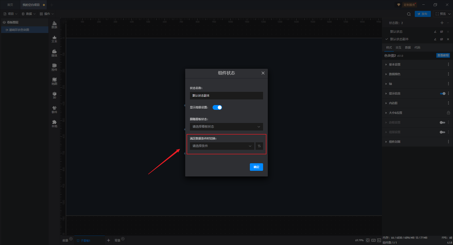 在这里我们可以选择已设置的数据条件,从而在数据条件满足时,组件的状态就会发生变化。