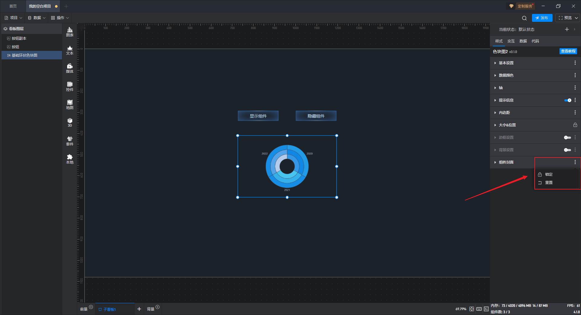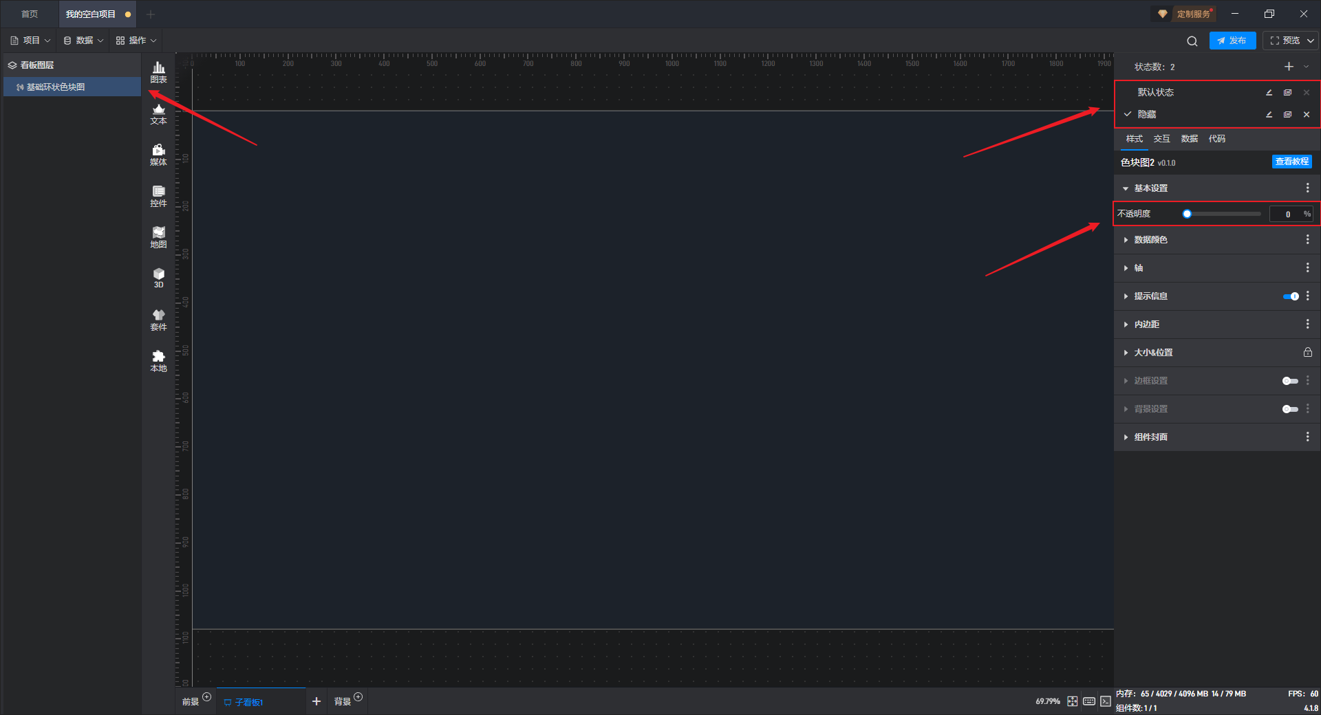 添加一个数值为“0”的数据到数据字段中,可以看到通过动态数据字段将不透明度的数值修改为“0”,从而使组件隐藏。