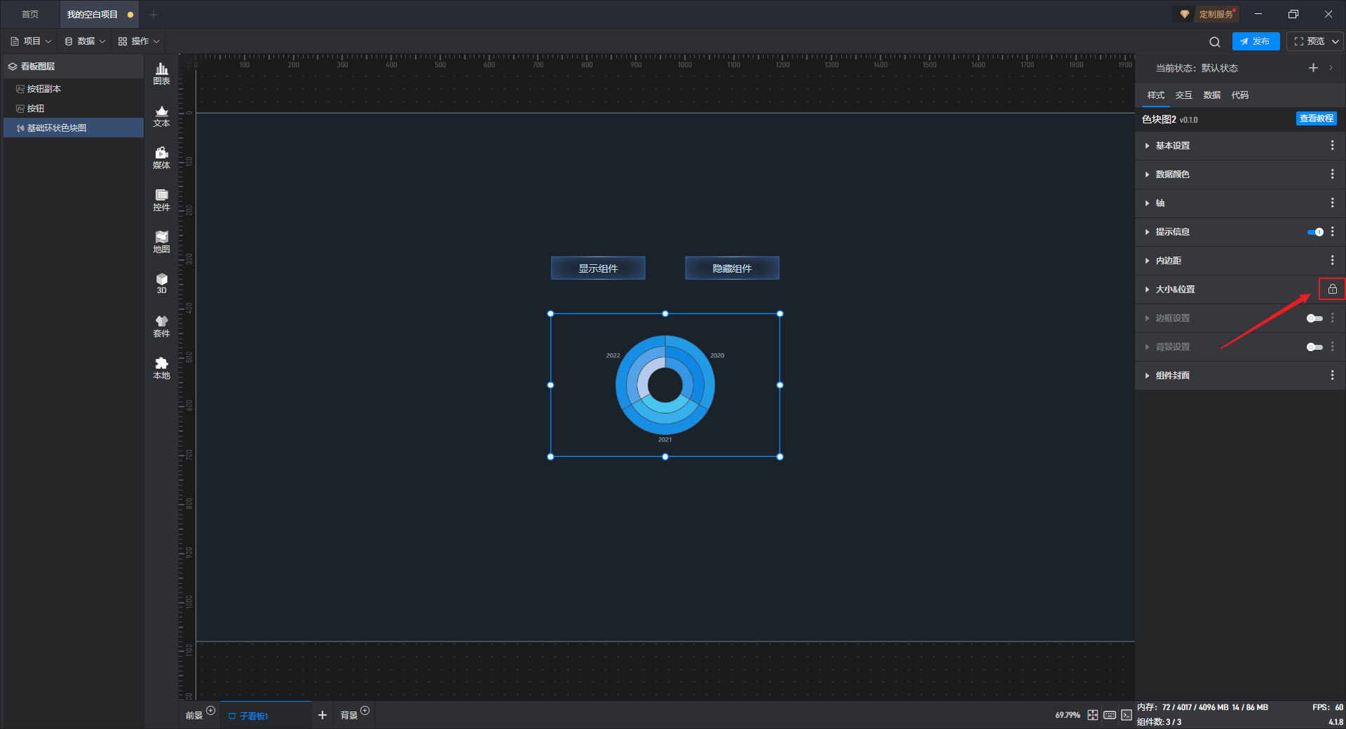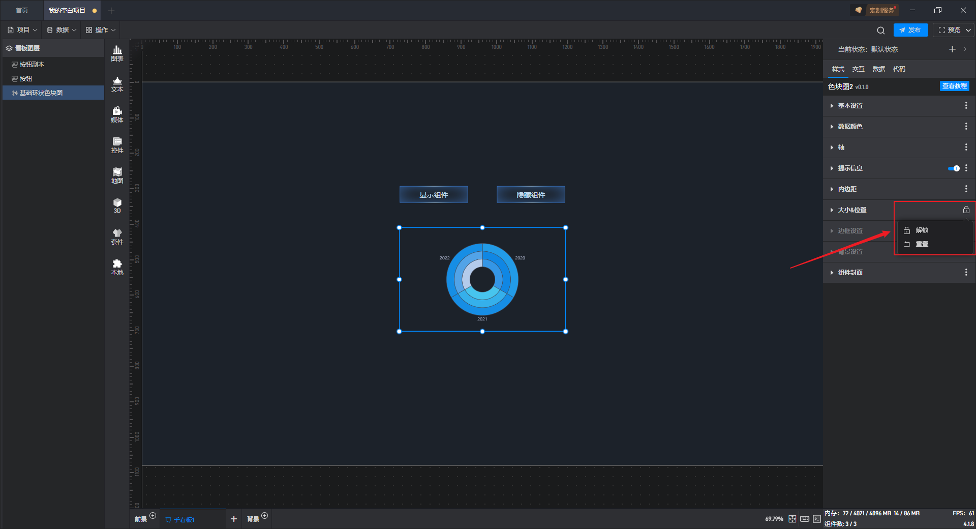 可以通过直接点击和拖动组件来调整大小和位置,也可以通过直接输入宽、高、X 坐标和Y 坐标来设置。