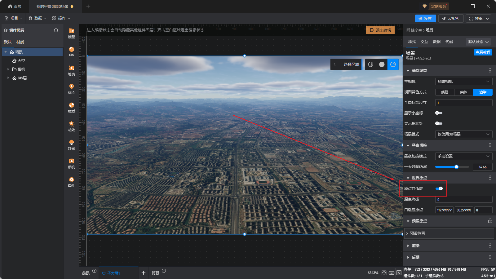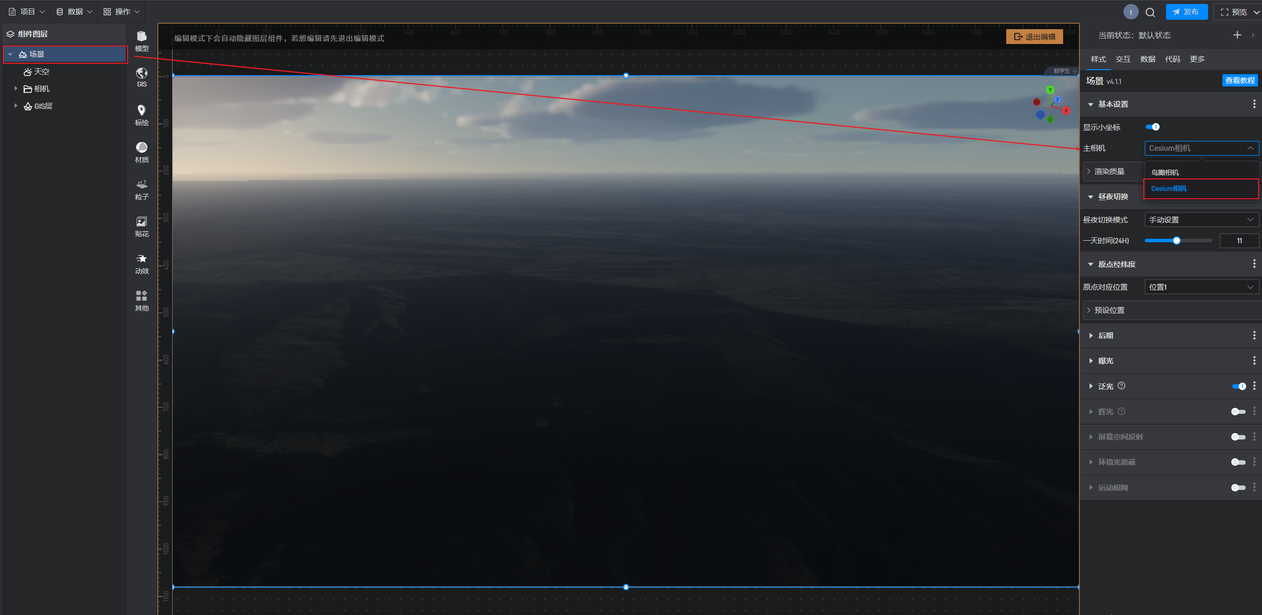 鲸孪生中的主相机默认是鸟瞰相机,这个相机无法受 CesiumJS 代码的控制,需要修改为 Cesium 相机。画面中双击鲸孪生组件(注意不是在图层面板中双击),进入编辑模式。选择场景组件,右侧属性面板中主相机修改为 Cesium 相机。