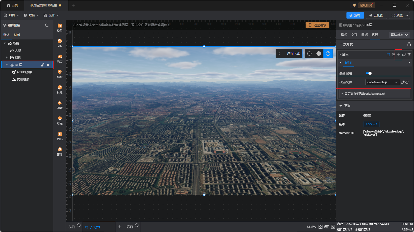 打开项目后,选择 GIS 层,在右侧的选项卡中选择代码,点击编辑: