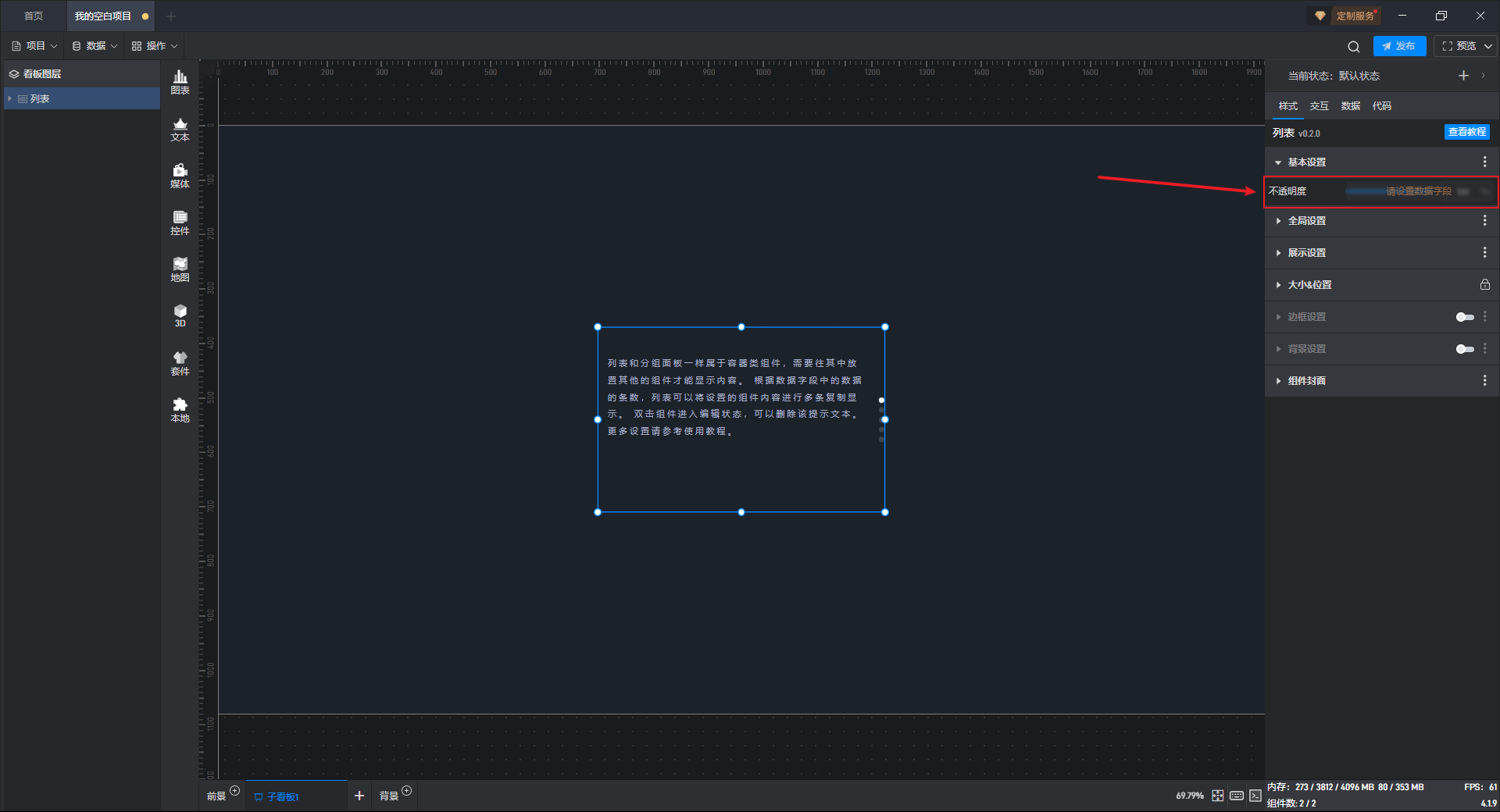 列表的使用与分组面板类似,也是将多个组件合并成一个分组,但是与分组面板相比,列表组件是专门用来展示文字、图片、视频等媒体组件的,因此我们不建议在列表组件中添加柱状图等图表组件。