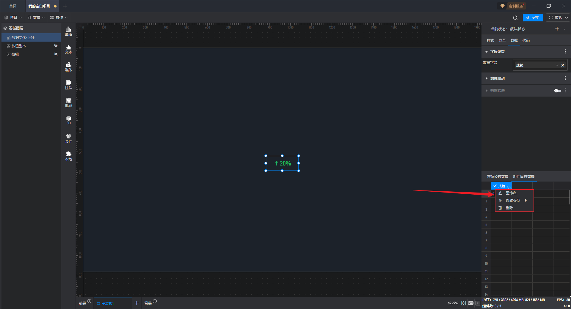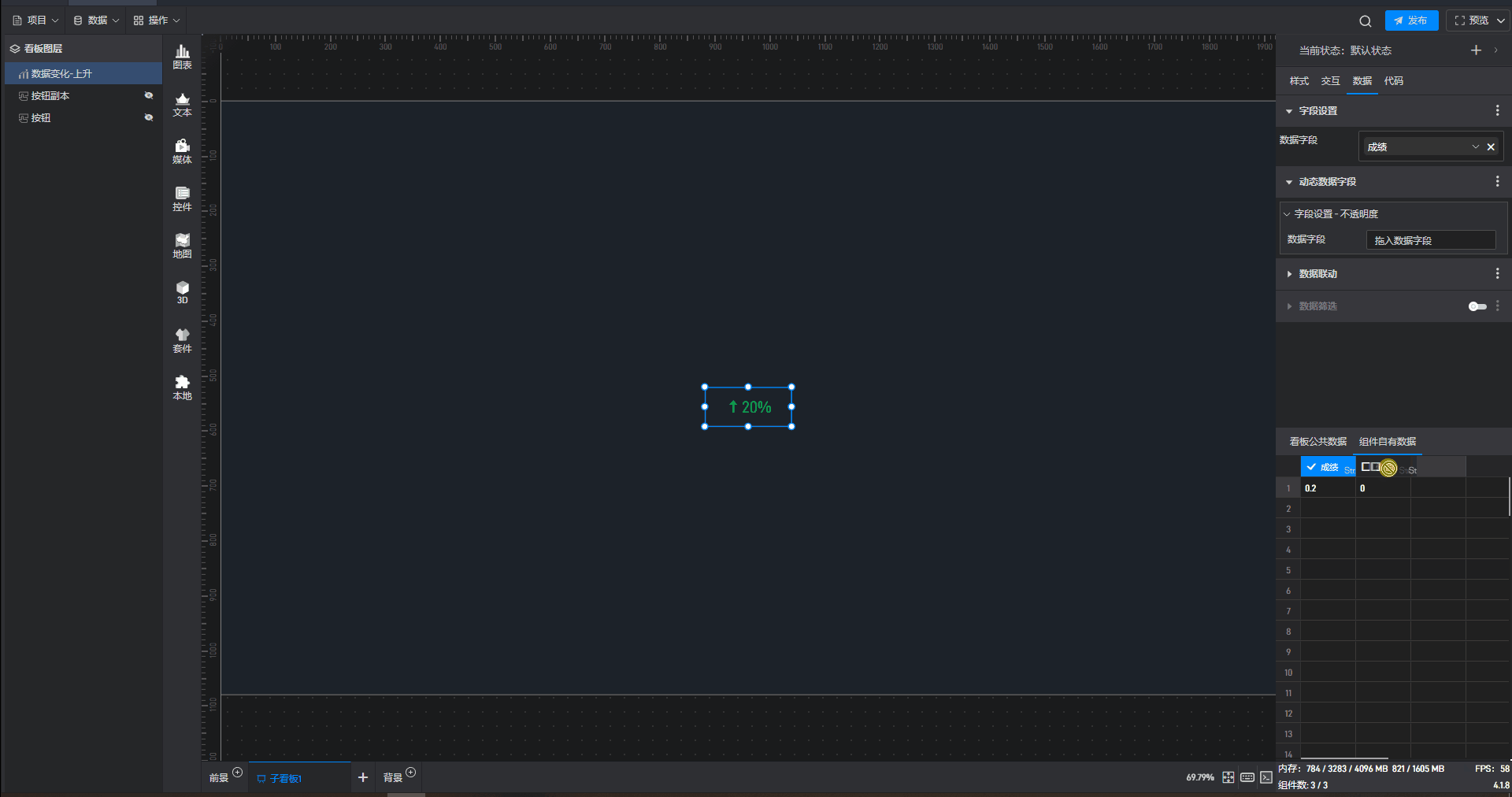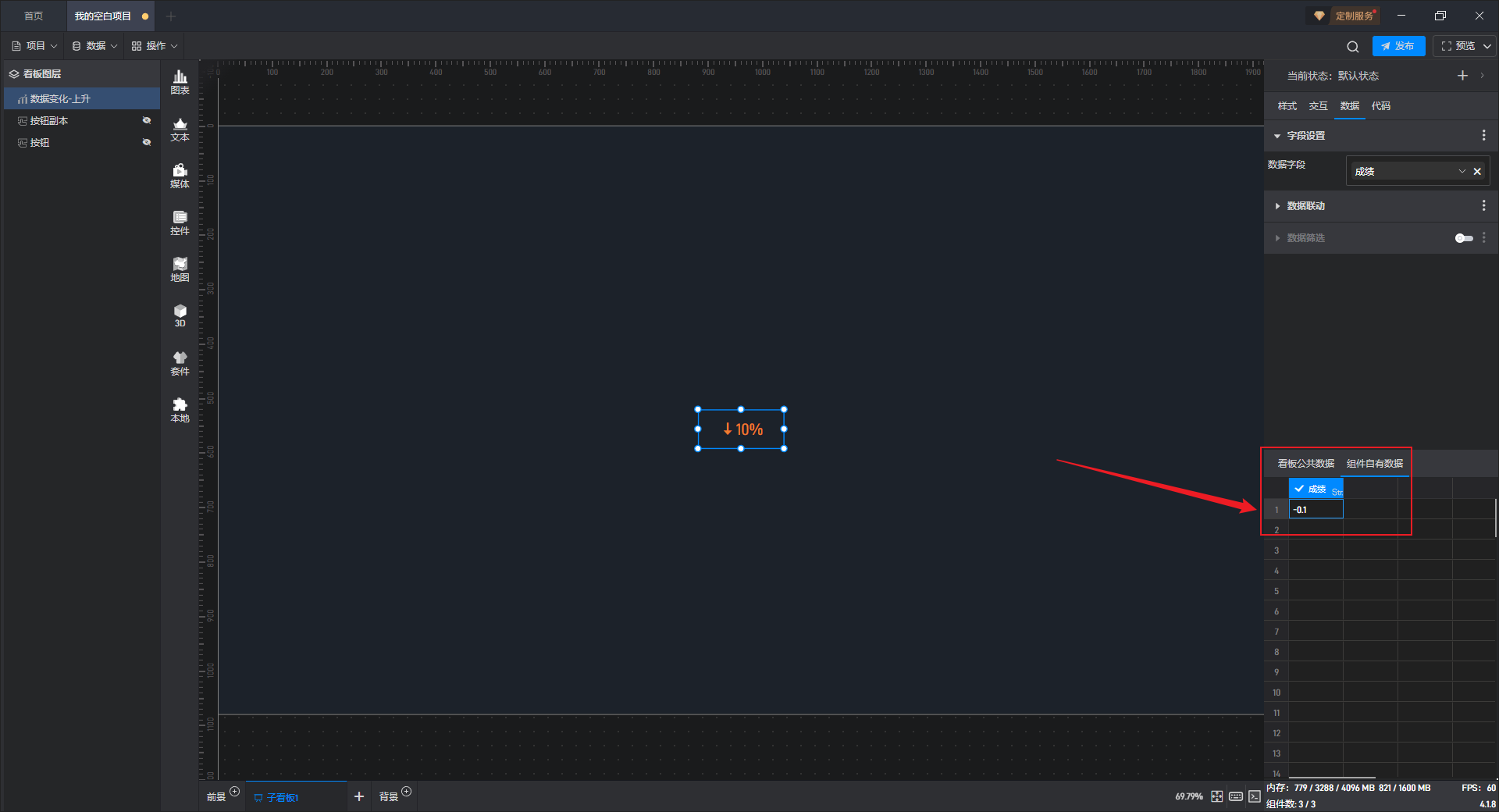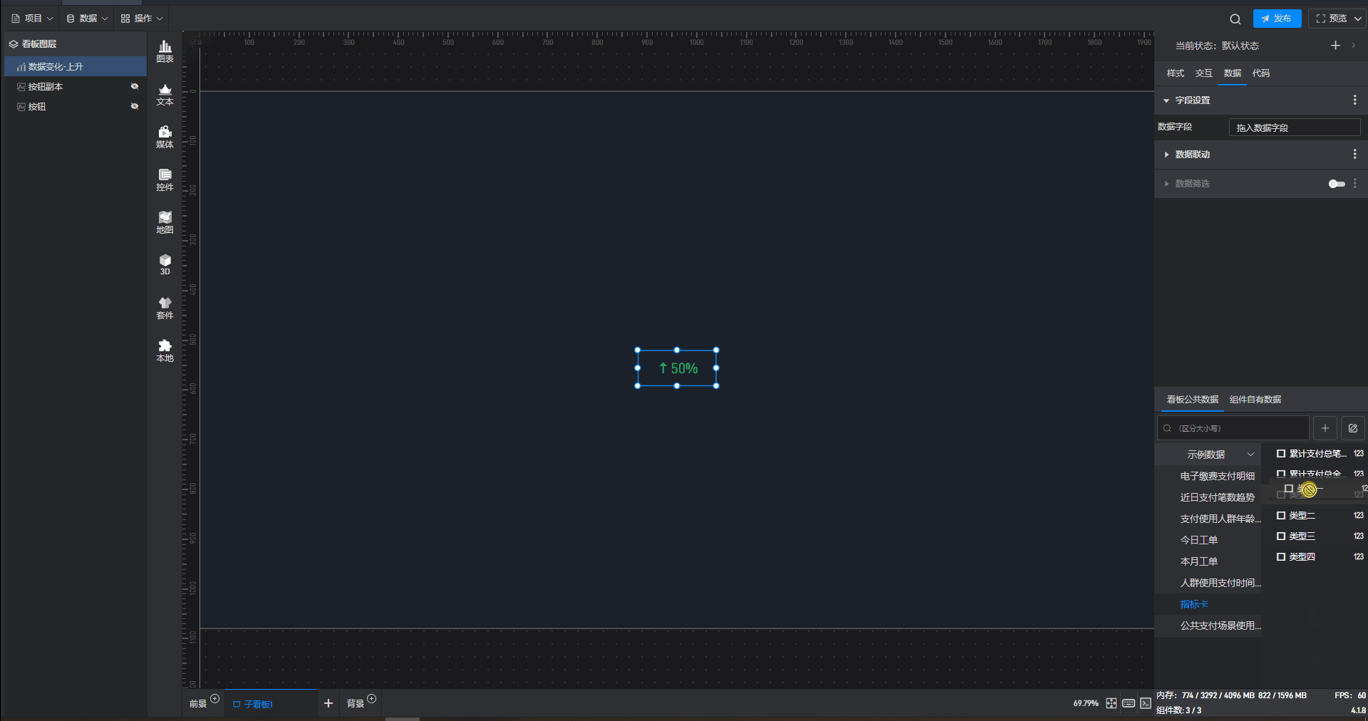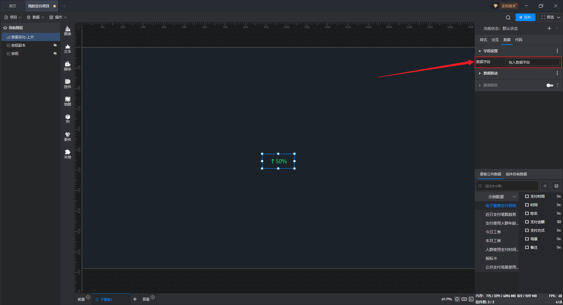 数据变化-上升只有一个数据字段,数据字段决定数据变化-上升组件显示的数值。