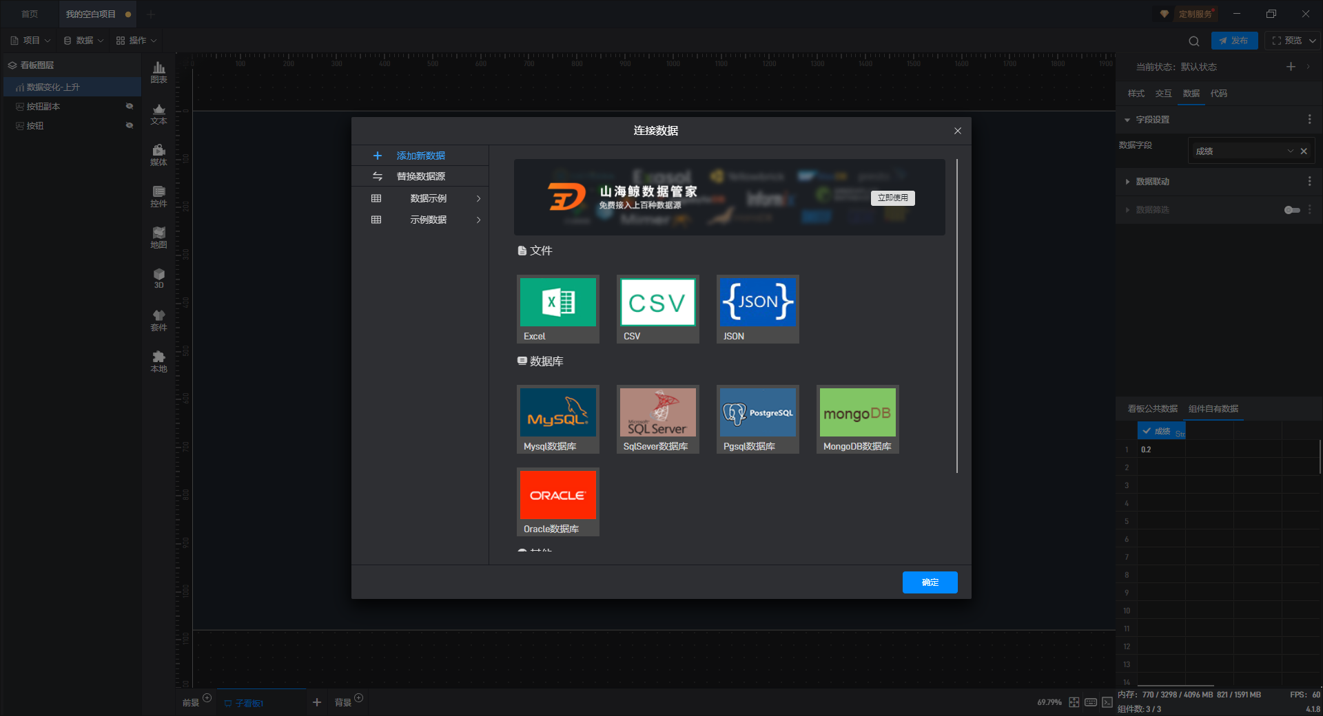 点击选中组件,在右侧“数据”设置窗口中切换到“看板公共数据”(同一个项目中所有数据源是共享的)。