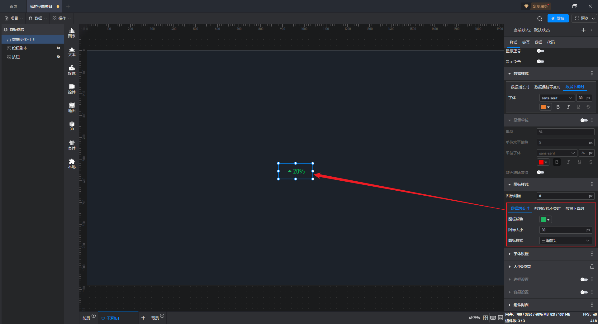 与“数据样式”相对应,在此处可对数据处于“数据增长时”、“数据保持不变时”、“数据下降时”三种不同趋势状态的图标颜色、大小和样式进行设置。