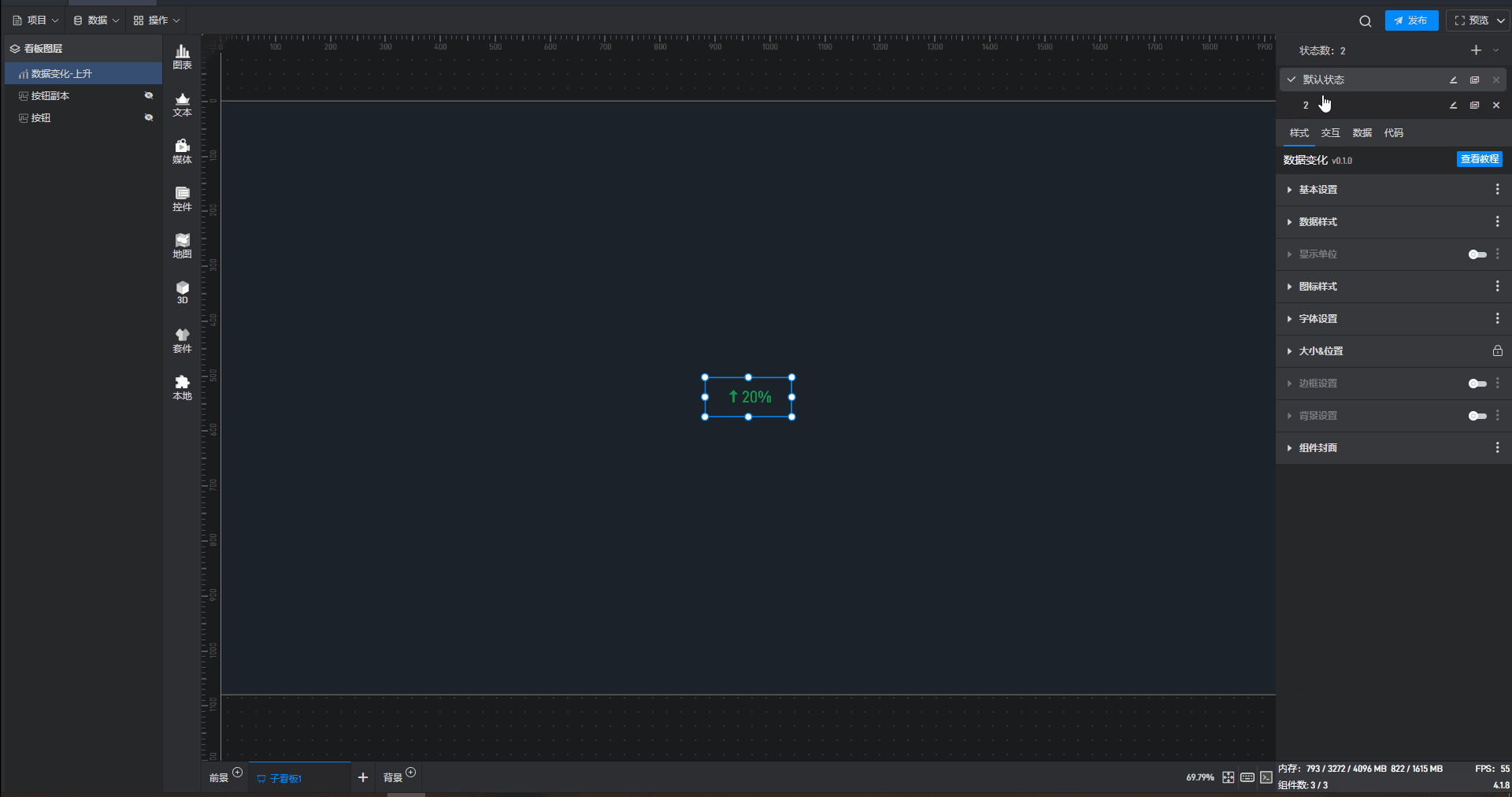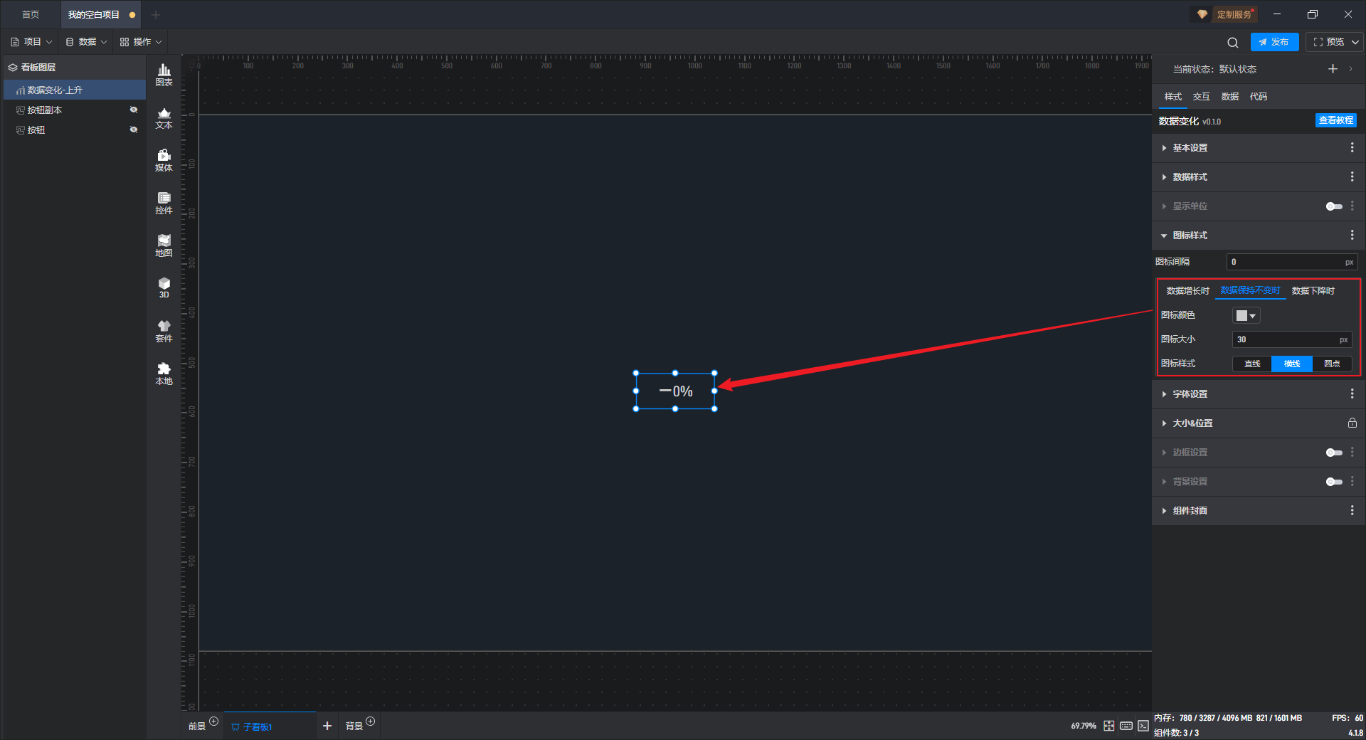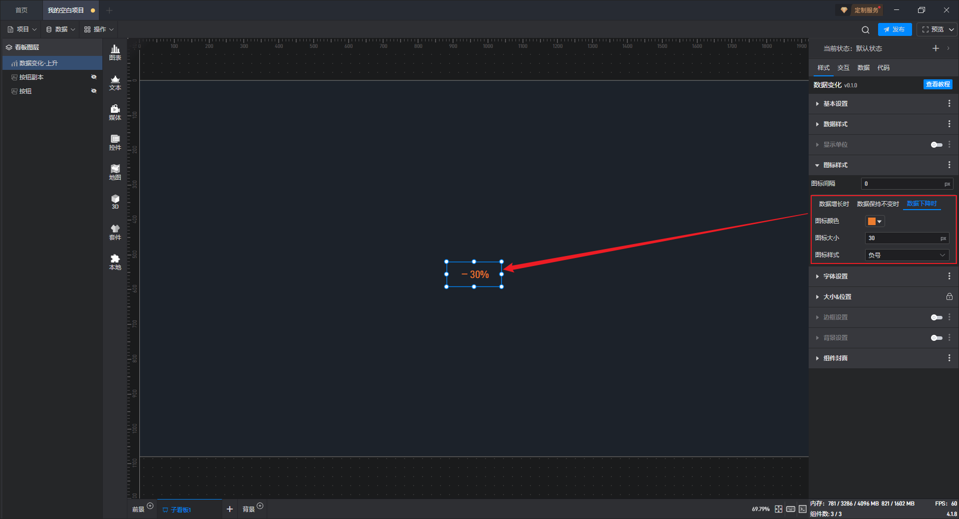 数据变化-保持不变、数据变化-上升、数据变化-下降都是数据变化的预设样式,这些预设的样式主要是组件自有数据、组件图形的形状、颜色和数量,但是本质上这些组件都是数据变化。