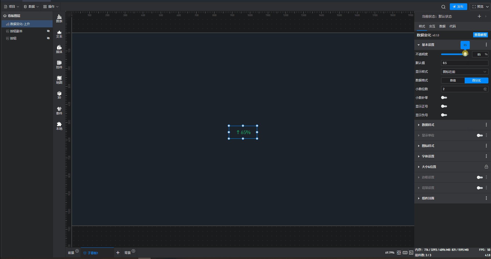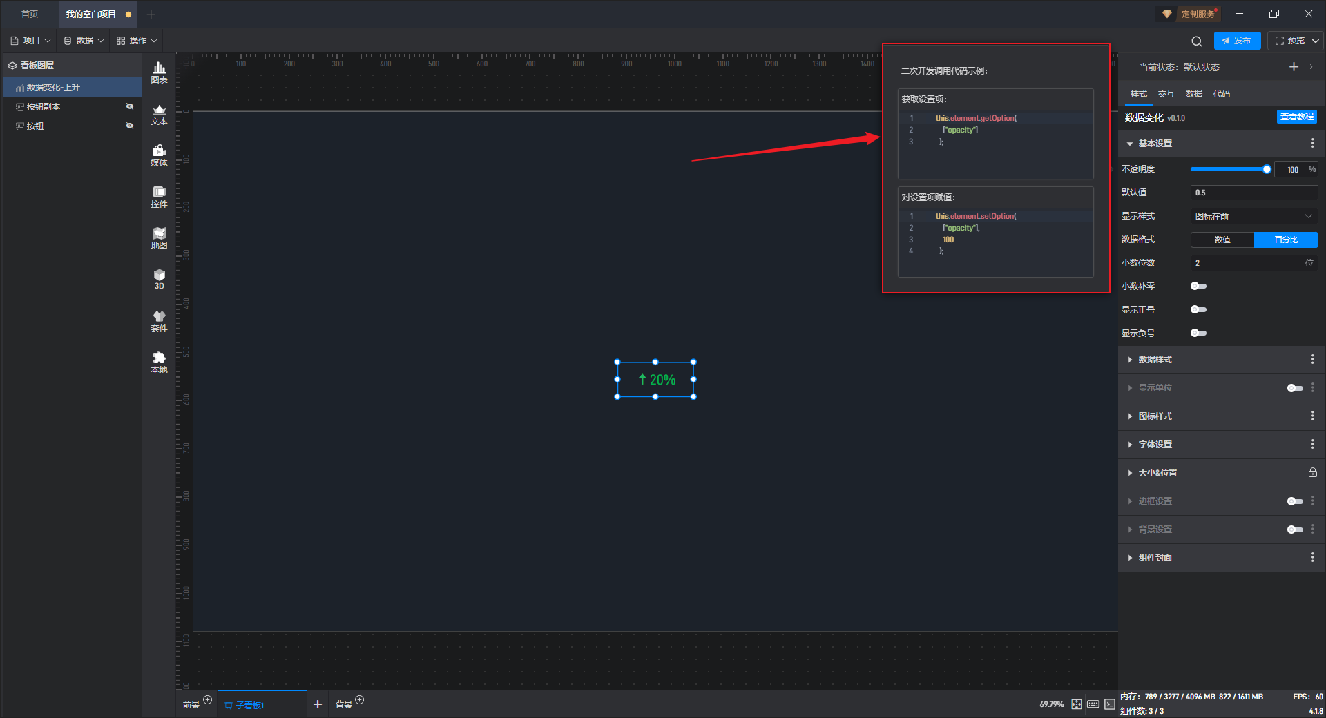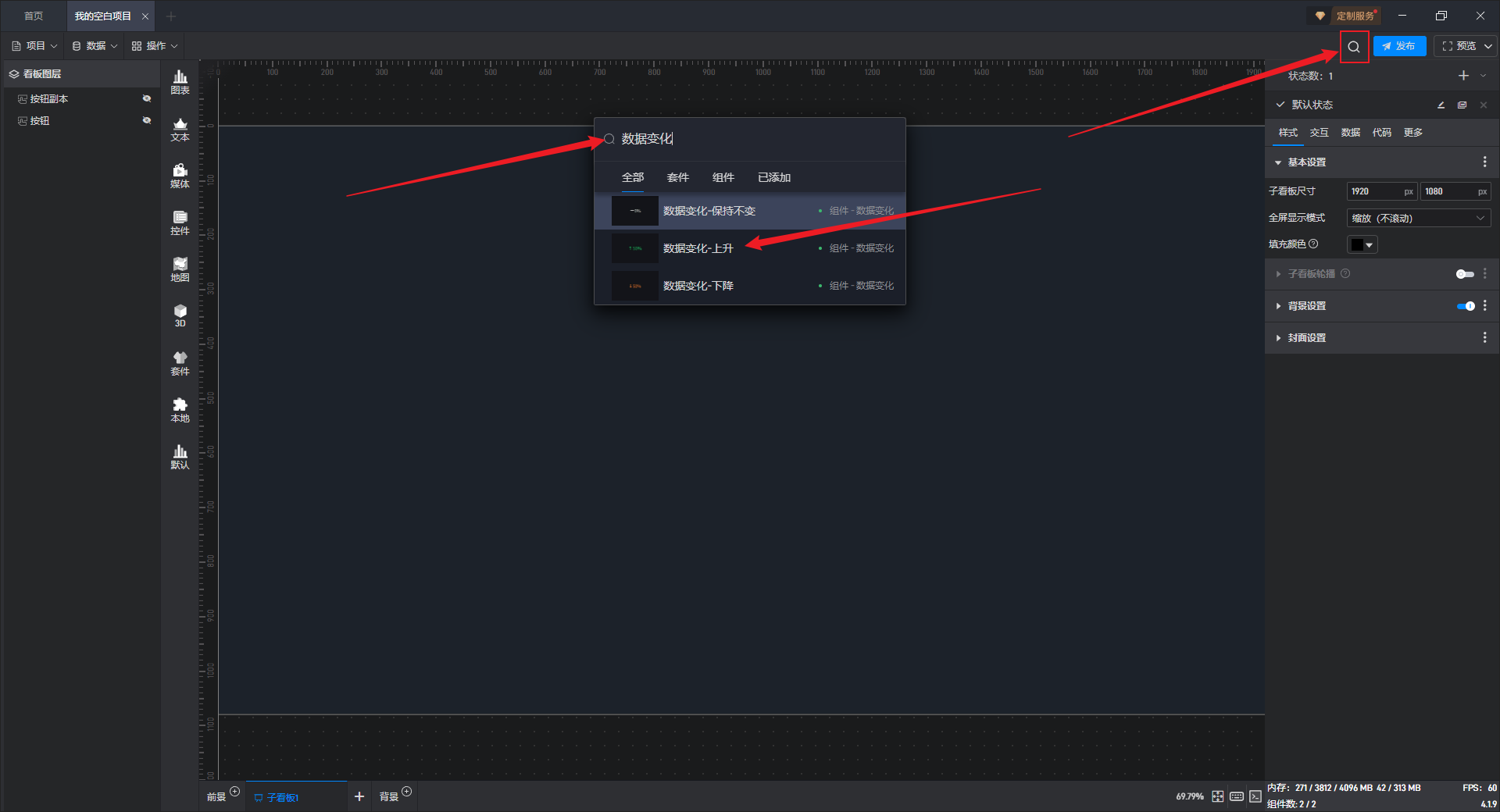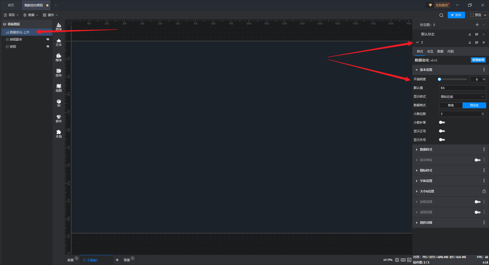 数据变化-保持不变、数据变化-上升、数据变化-下降都是数据变化的预设样式,这些预设的样式主要是组件自有数据、组件图形的形状、颜色和数量,但是本质上这些组件都是数据变化。