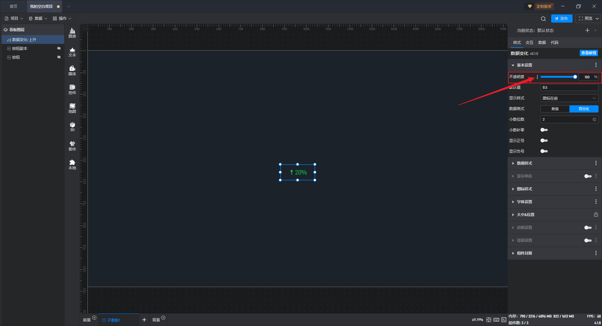 添加一个数值为“0”的数据到数据字段中,可以看到通过动态数据字段将不透明度的数值修改为“0”,从而使组件隐藏。