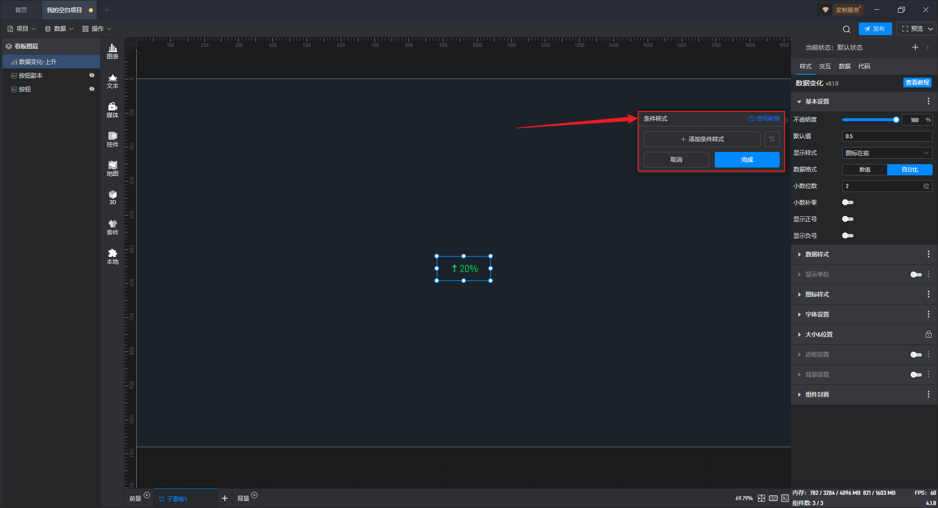 在这里我们可以选择已设置的数据条件,从而在数据条件满足时,组件的状态就会发生变化。