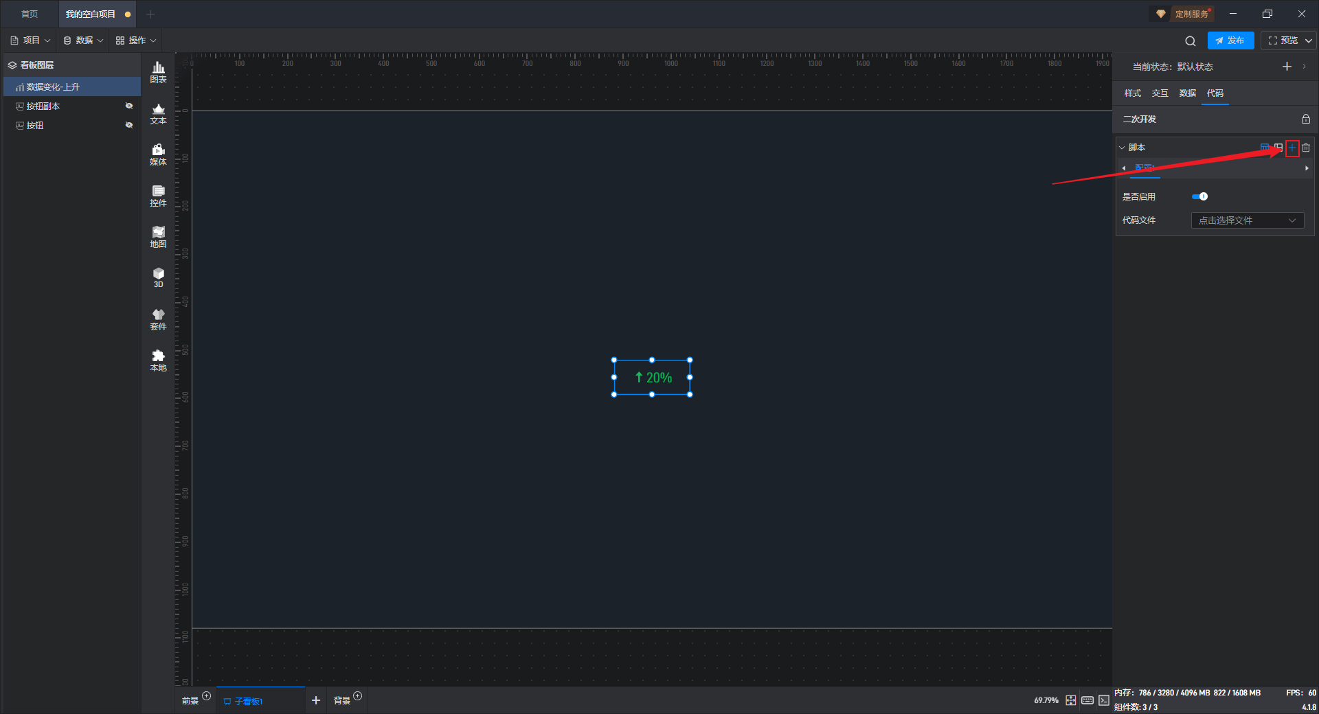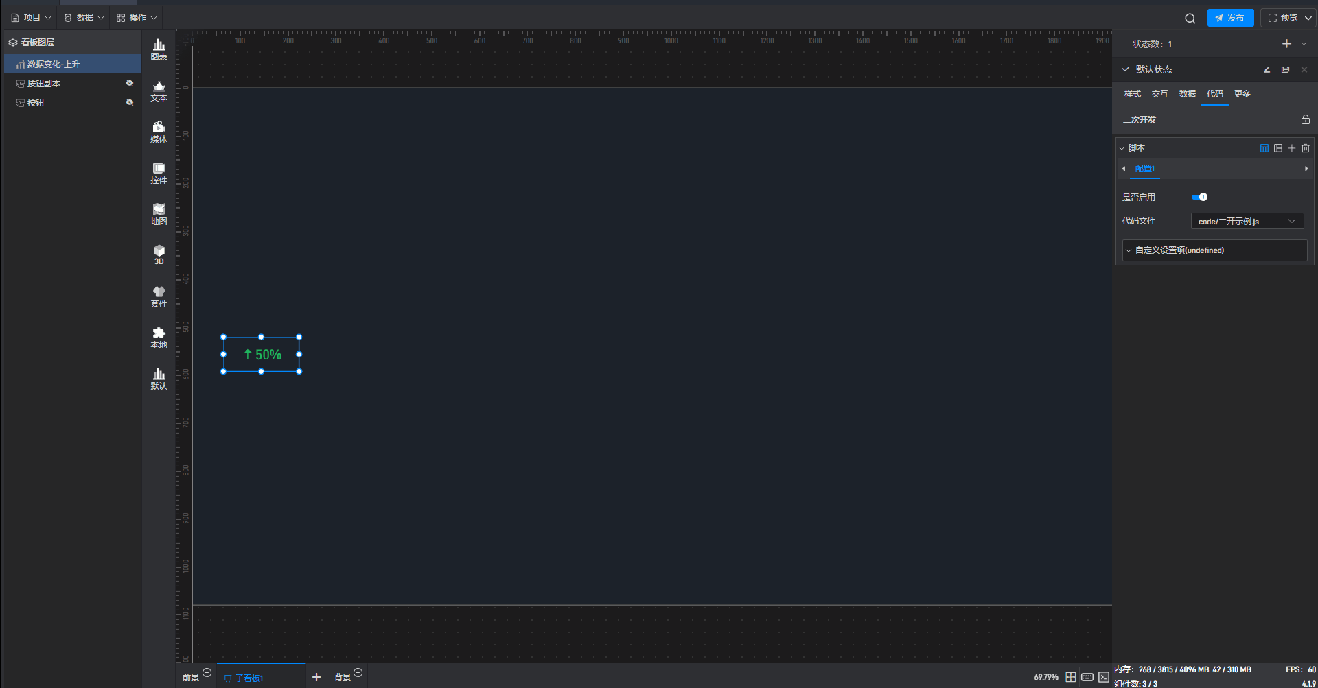 点击选中组件,在右侧“代码”设置窗口中可以对组件进行二次开发设置。