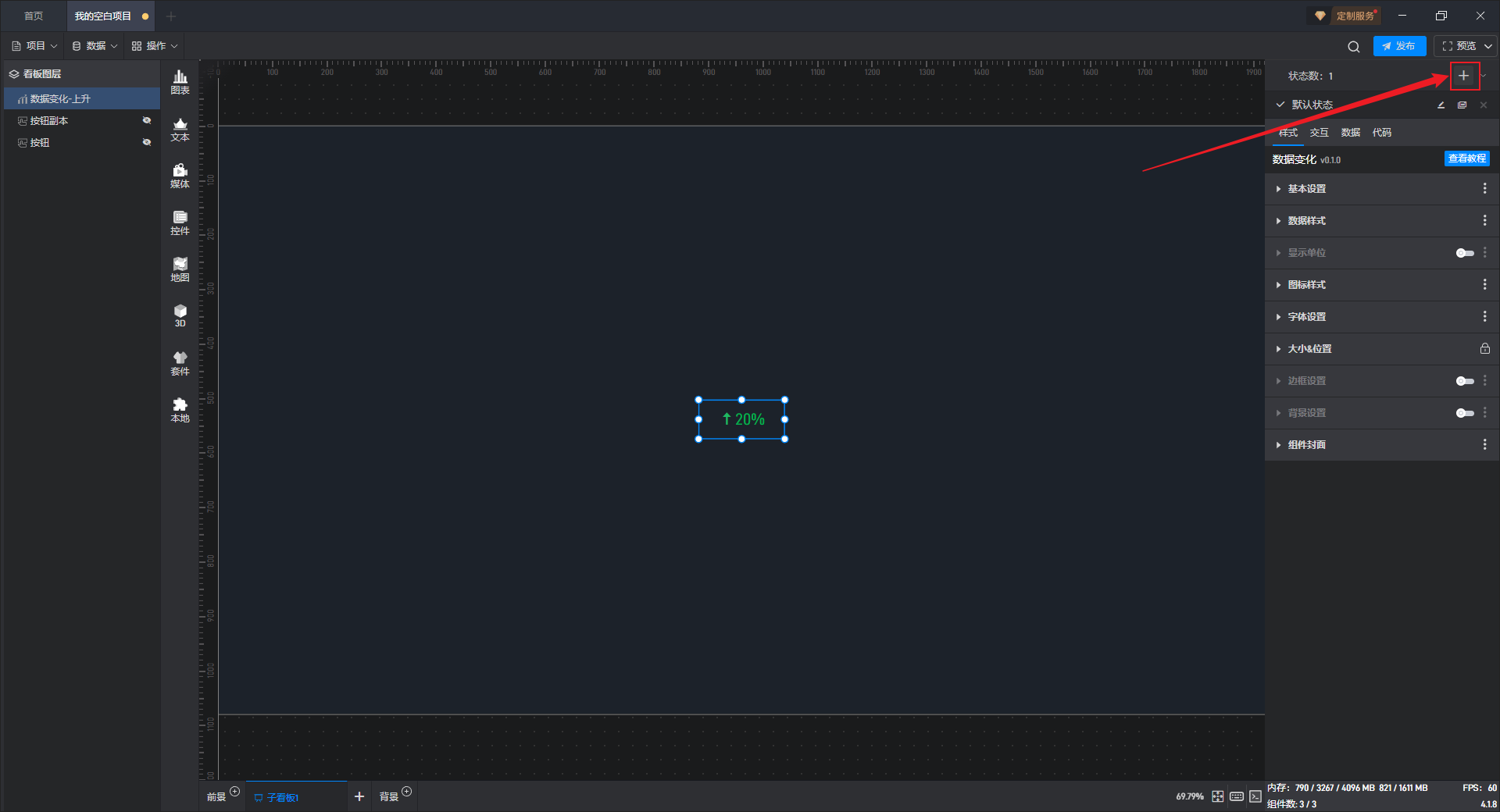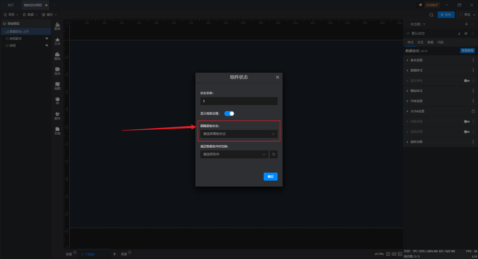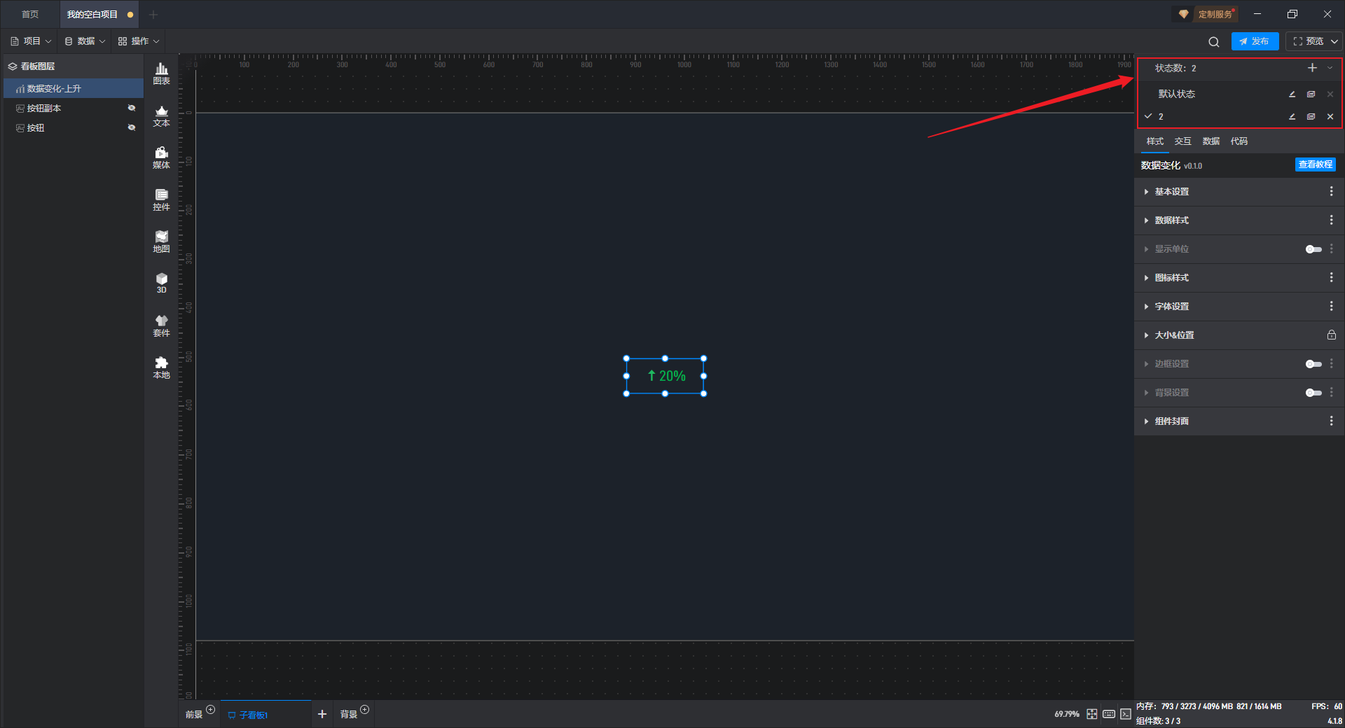 多状态主要用于通过数据条件或是点击交互(通常是点击其他组件来触发本组件的状态切换)来切换组件设置项的场景,这里的设置项包括组件的样式、交互、数据和代码。