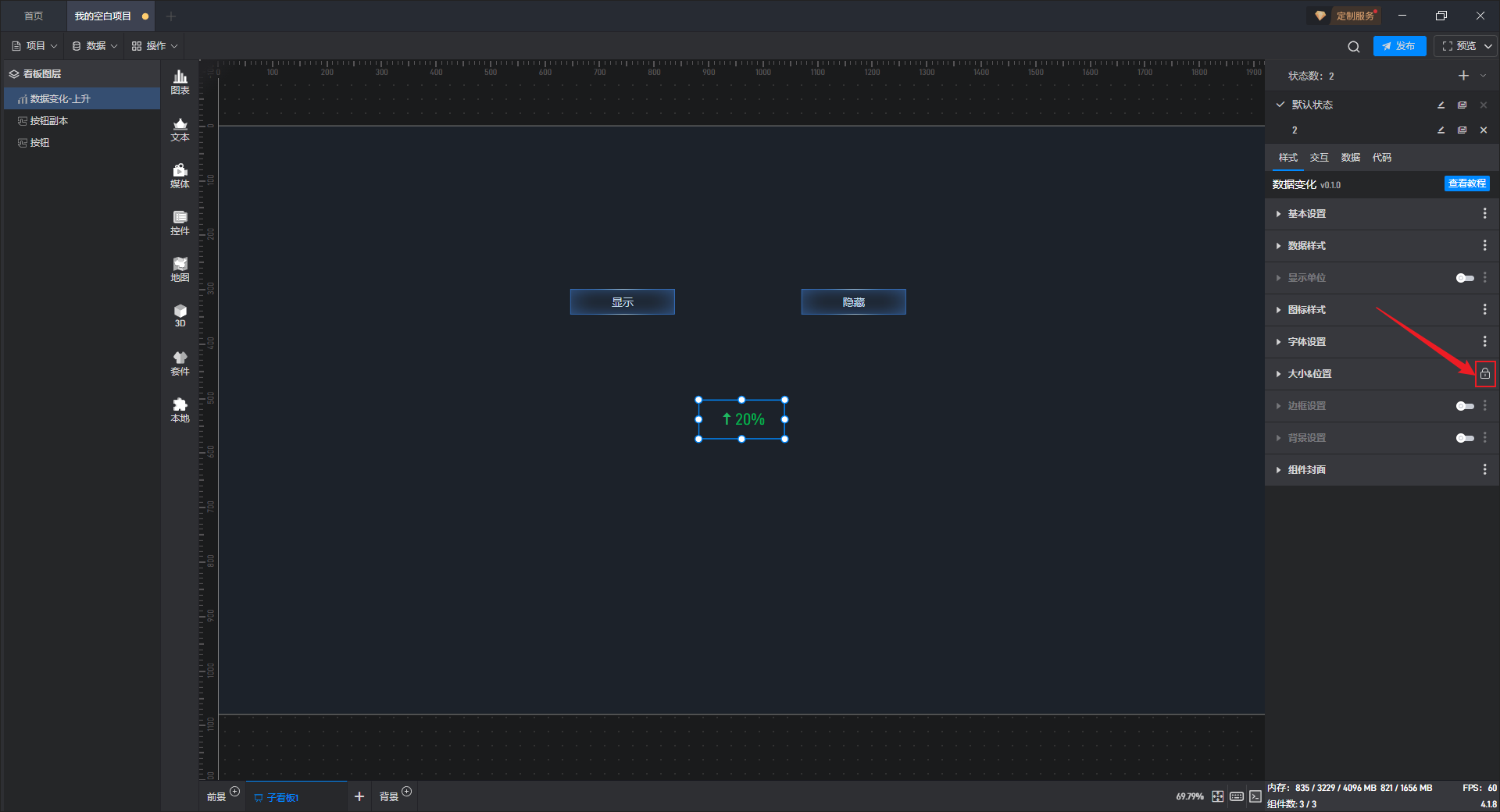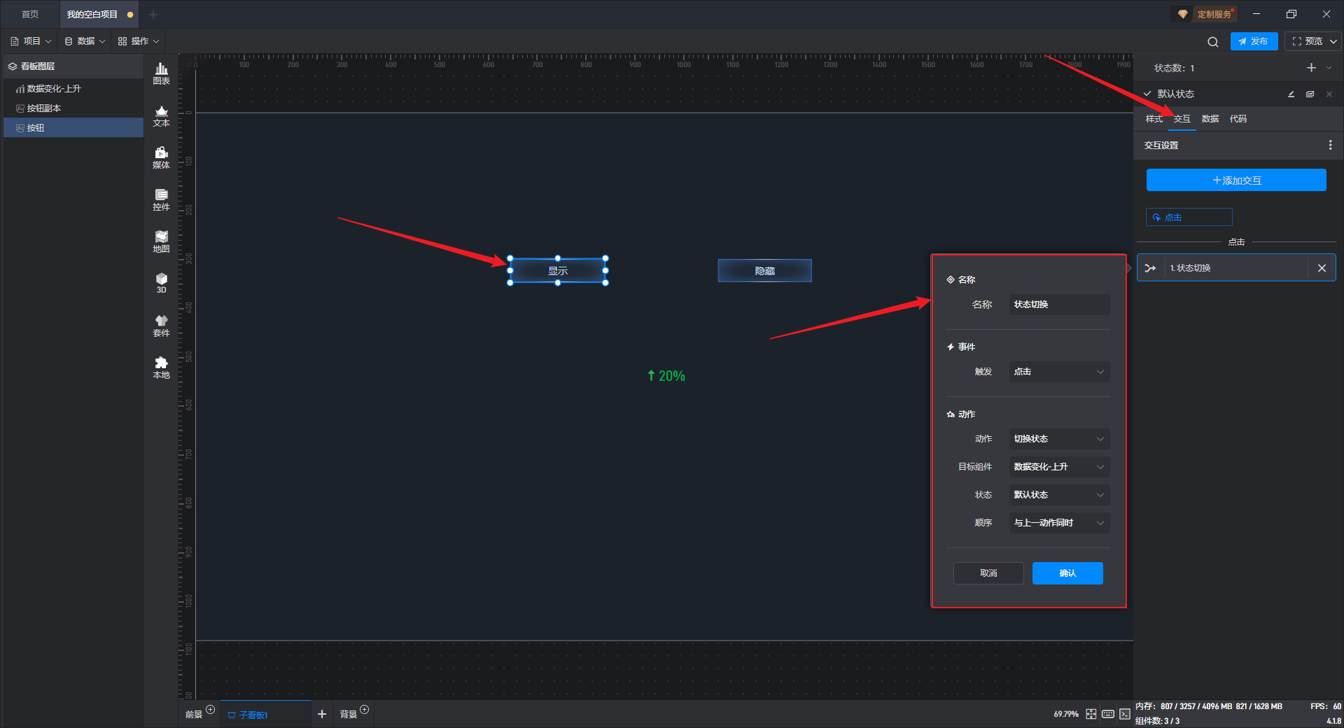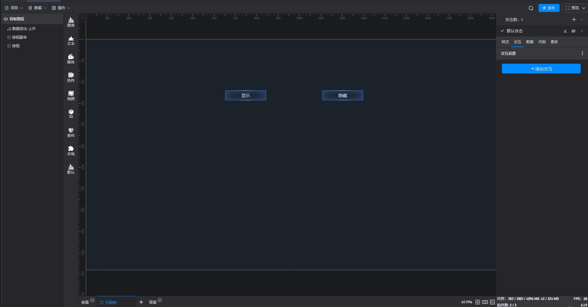 给隐藏按钮组件添加一个交互,点击后切换数据变化组件到隐藏状态。