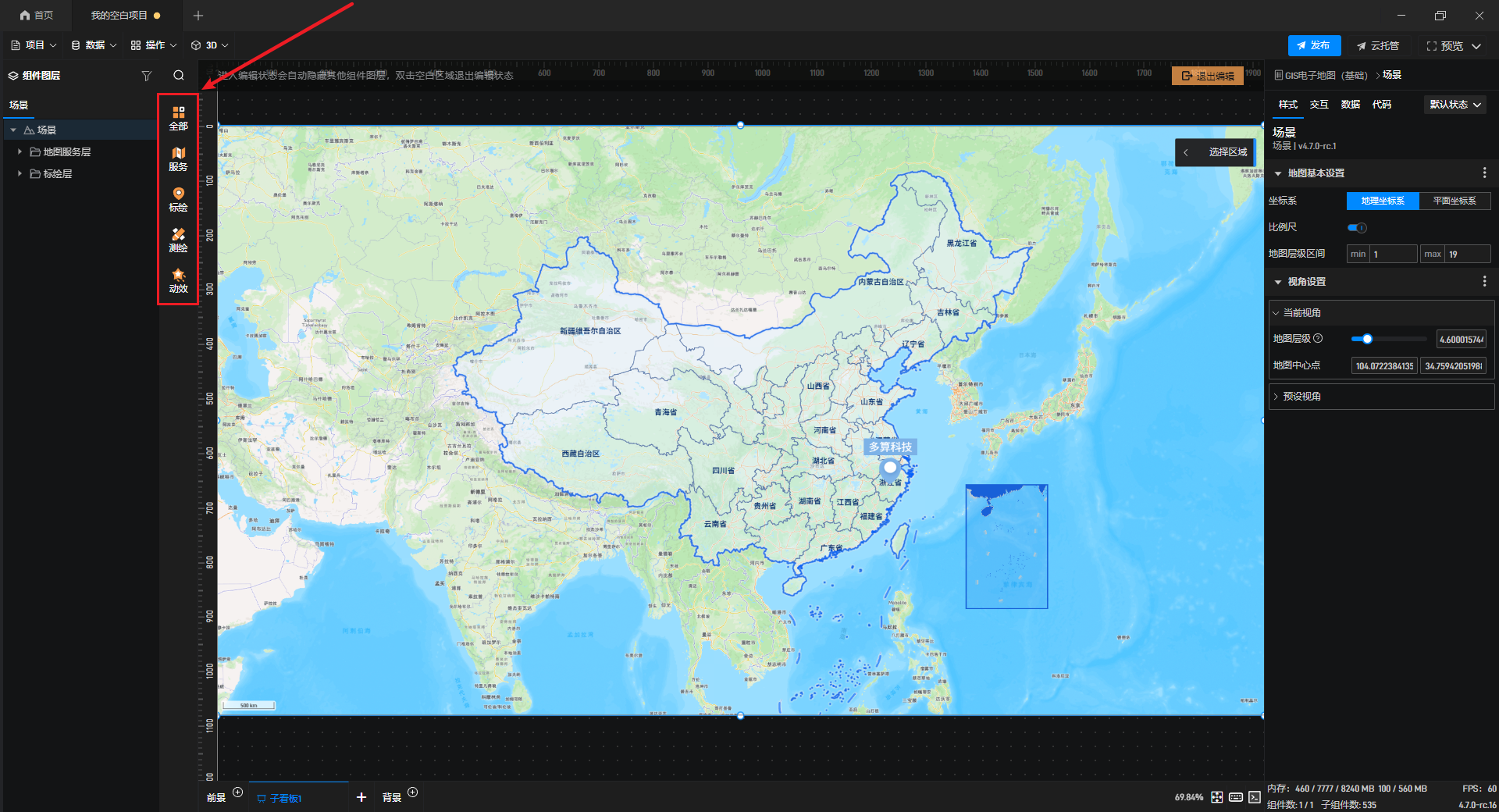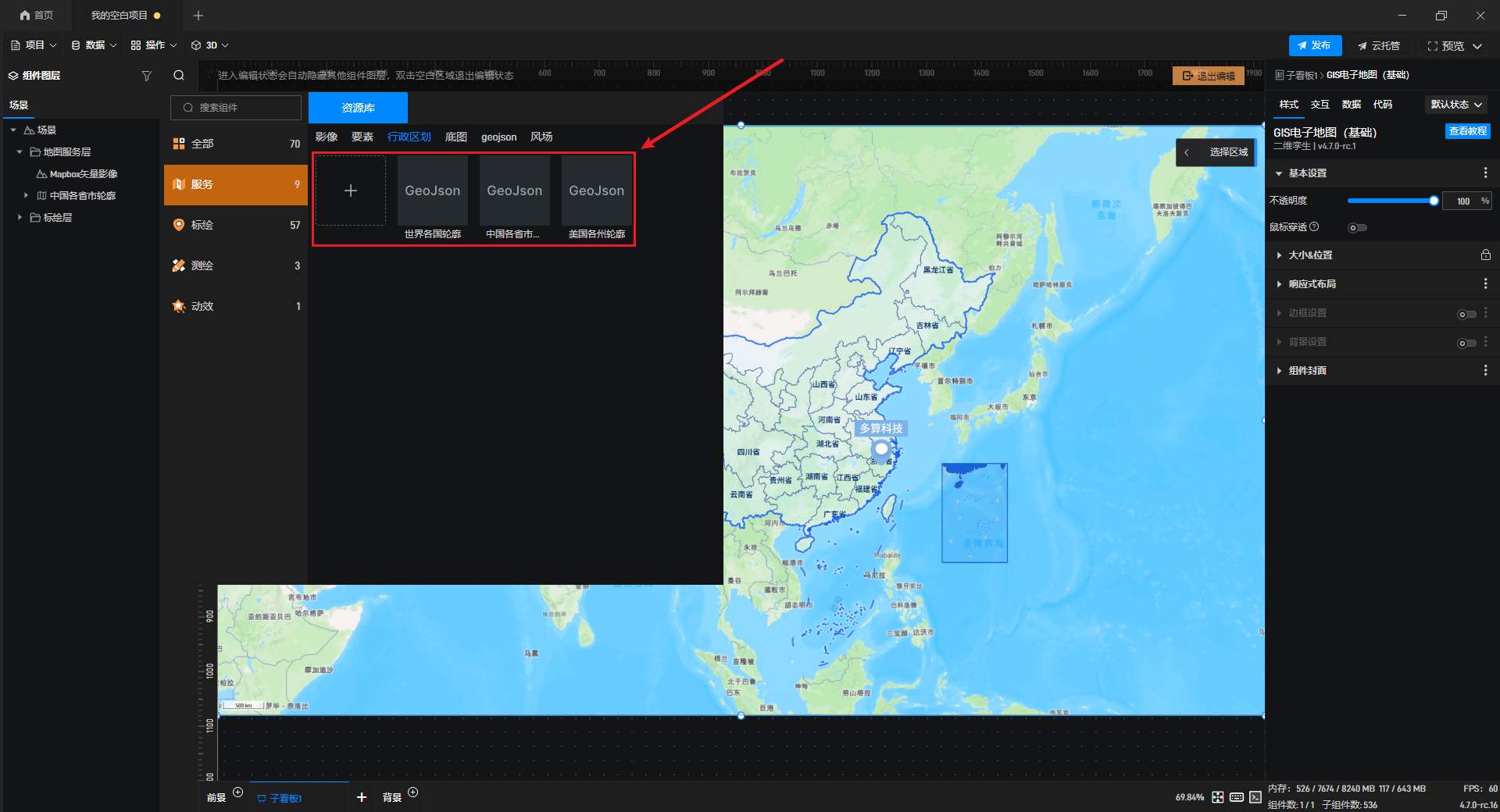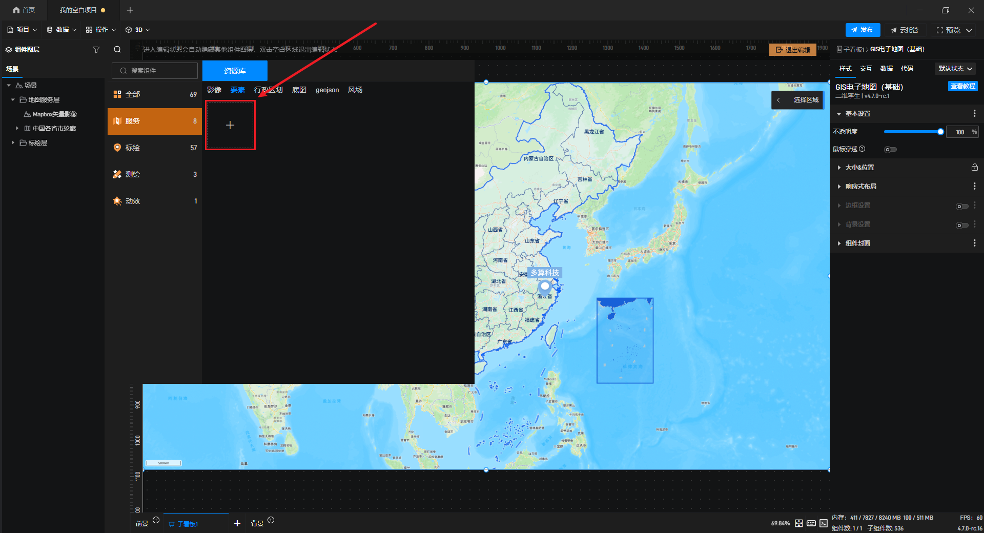 添加后,双击鲸地图即可进入编辑模式,对鲸地图进行编辑,此时可以看到左侧组件库变为了鲸地图专用的资源库。