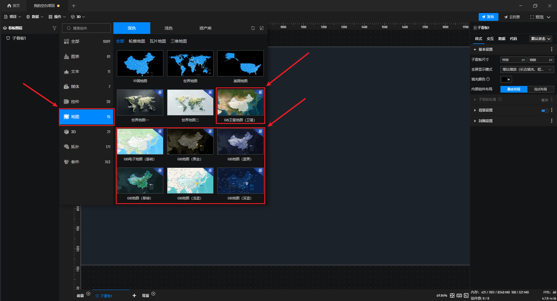 鲸地图可以在左侧组件库的“地图”分类中添加,其中包含许多种类,它们只有外观不同,功能设置上是相同的。