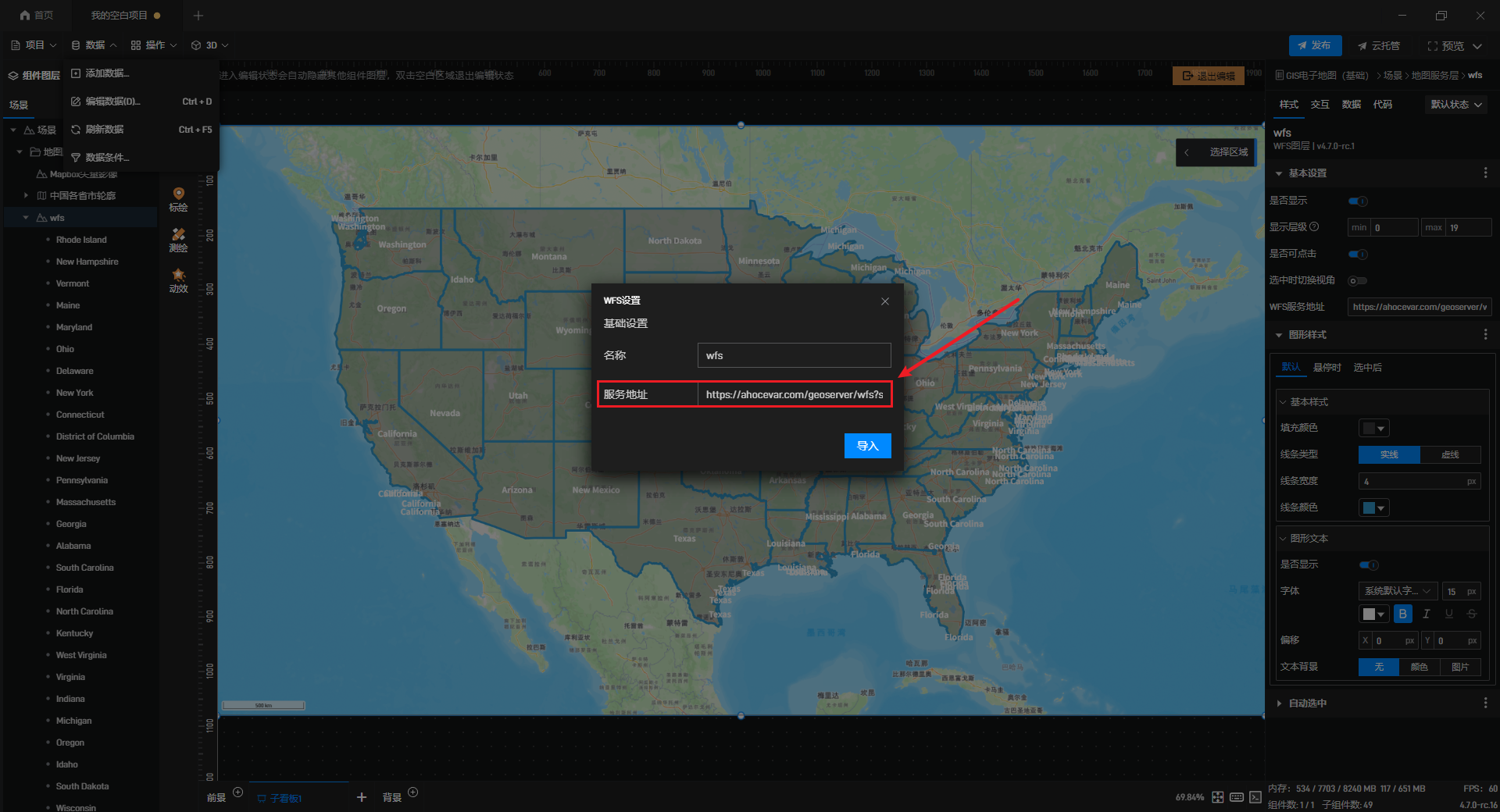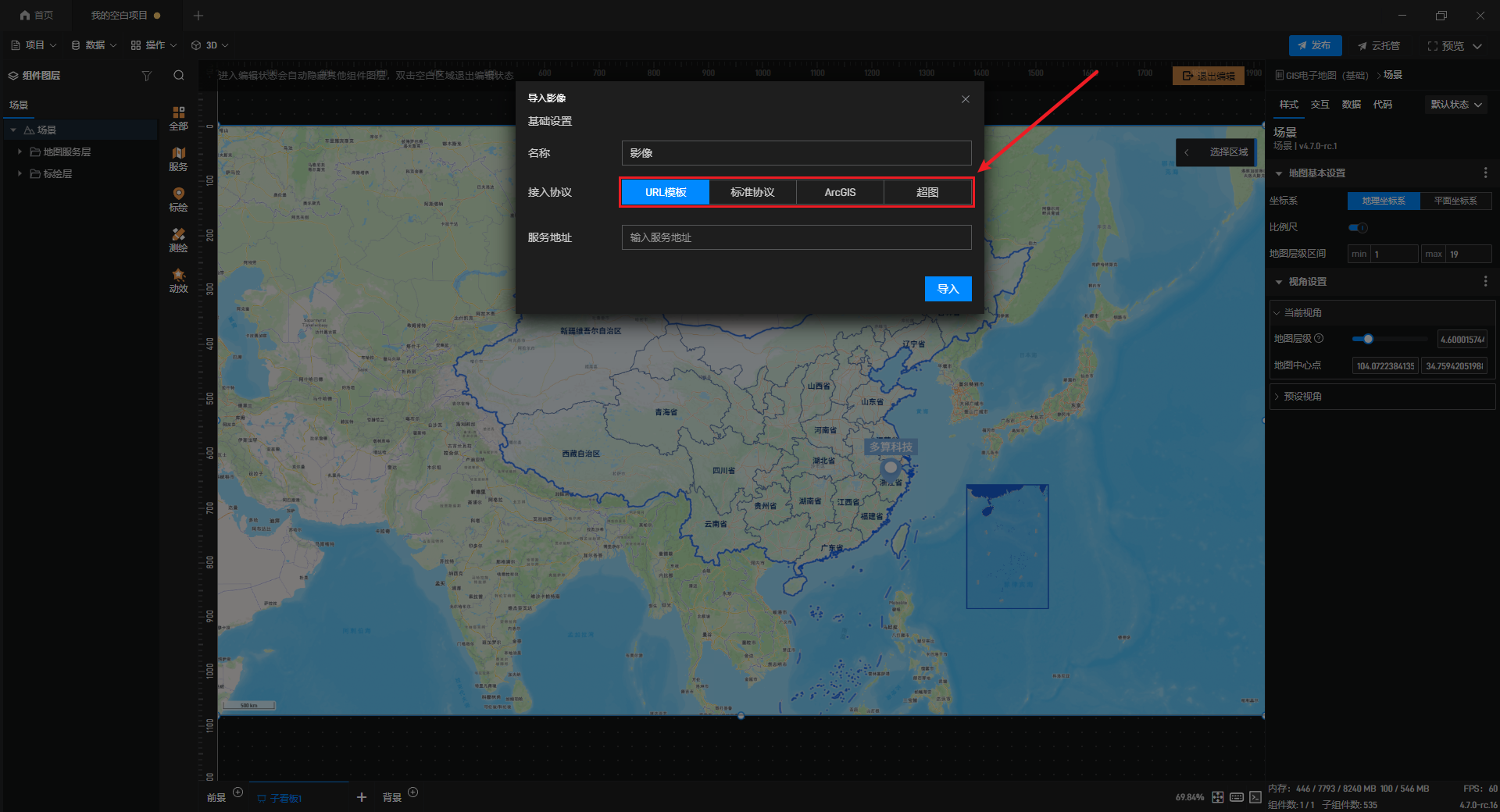 导入影像支持URL模板、标准协议、ArcGIS、超图等协议,添加服务地址后点击右下角“导入”即可使用。