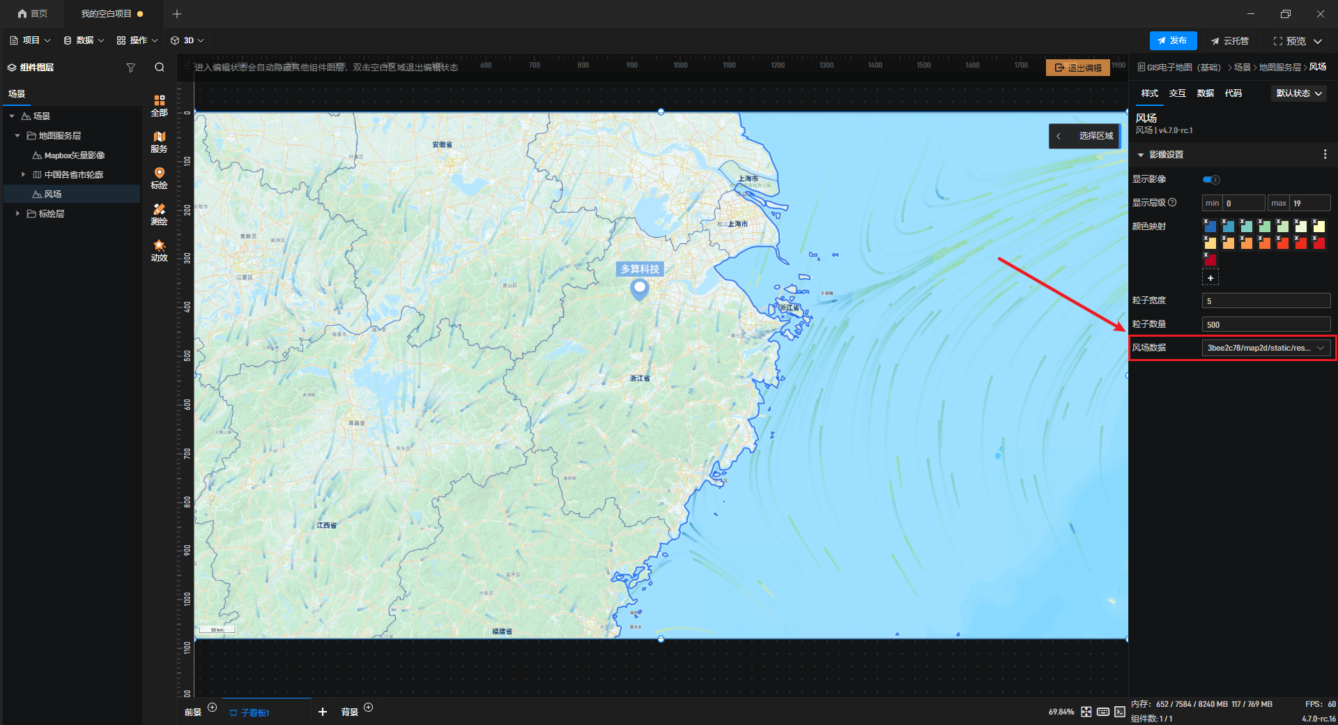 风场是全新增加的功能,我们可以通过风场来展示当前地图中的气象、洋流、风向等信息。
