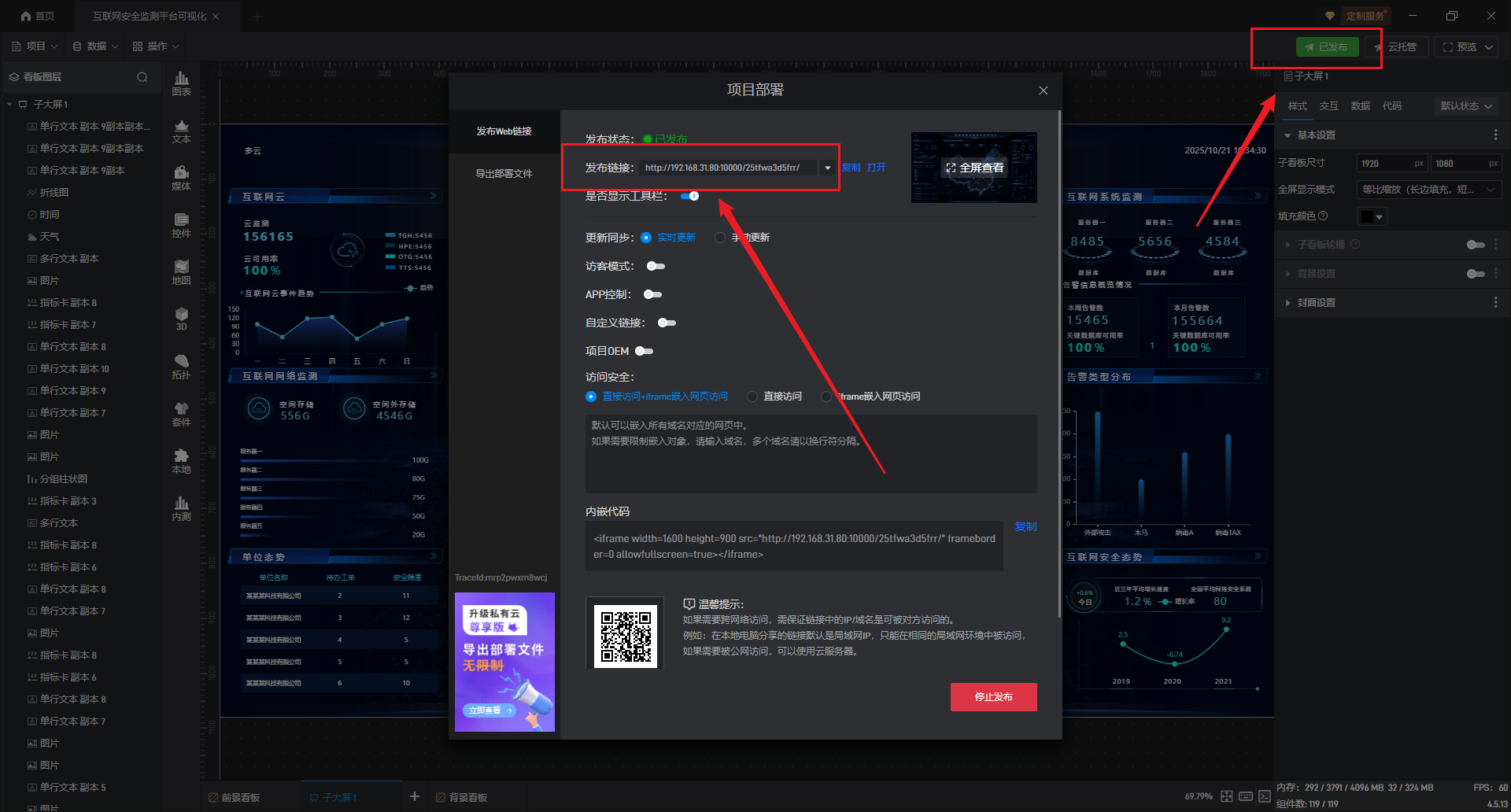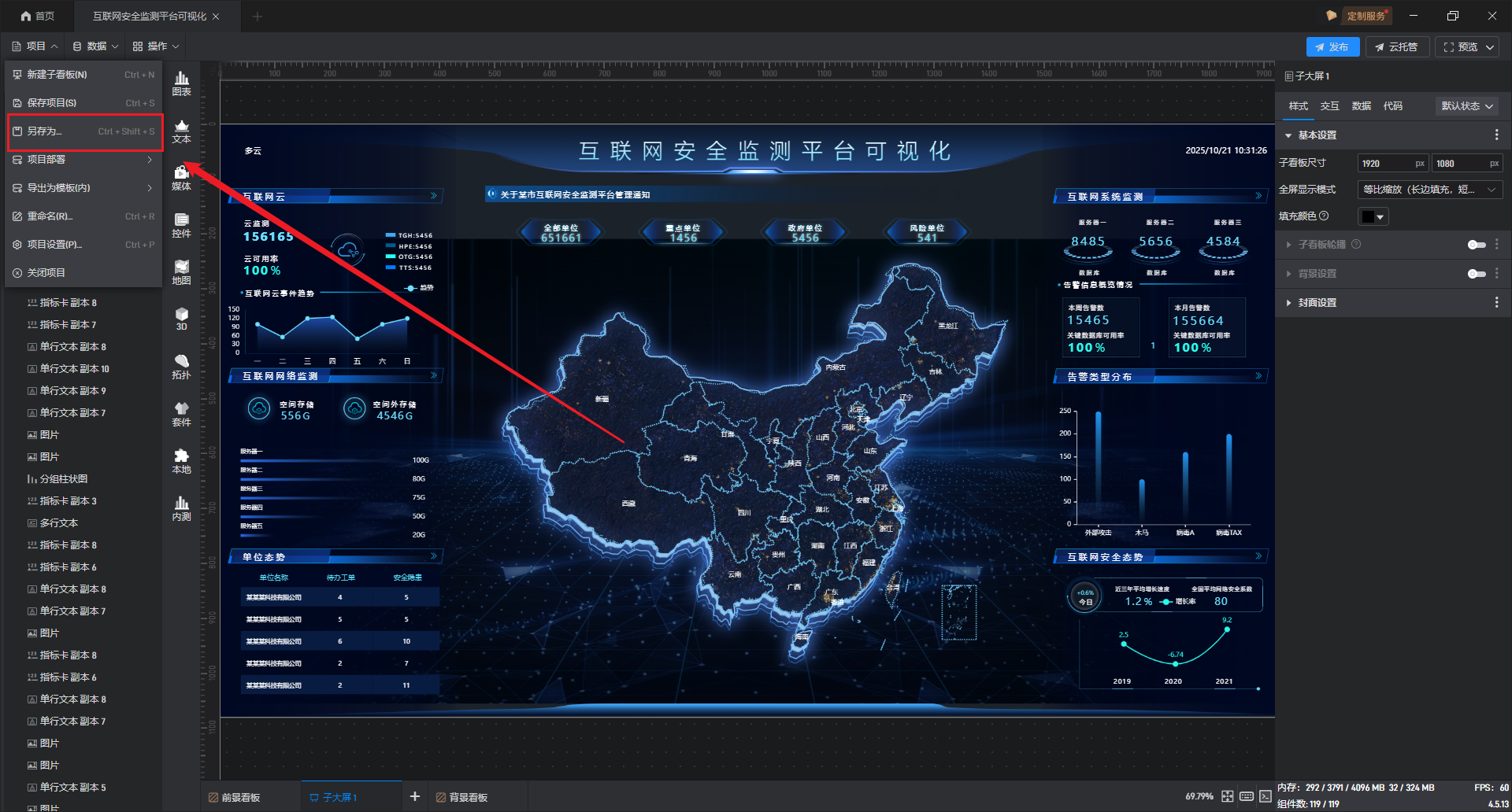 项目编辑界面支持添加多个子看板,其中前景看板用于放置标题、菜单等全局共用元素,背景看板用于承载地图、基础模型等底层元素,主内容则放置在普通子看板中。