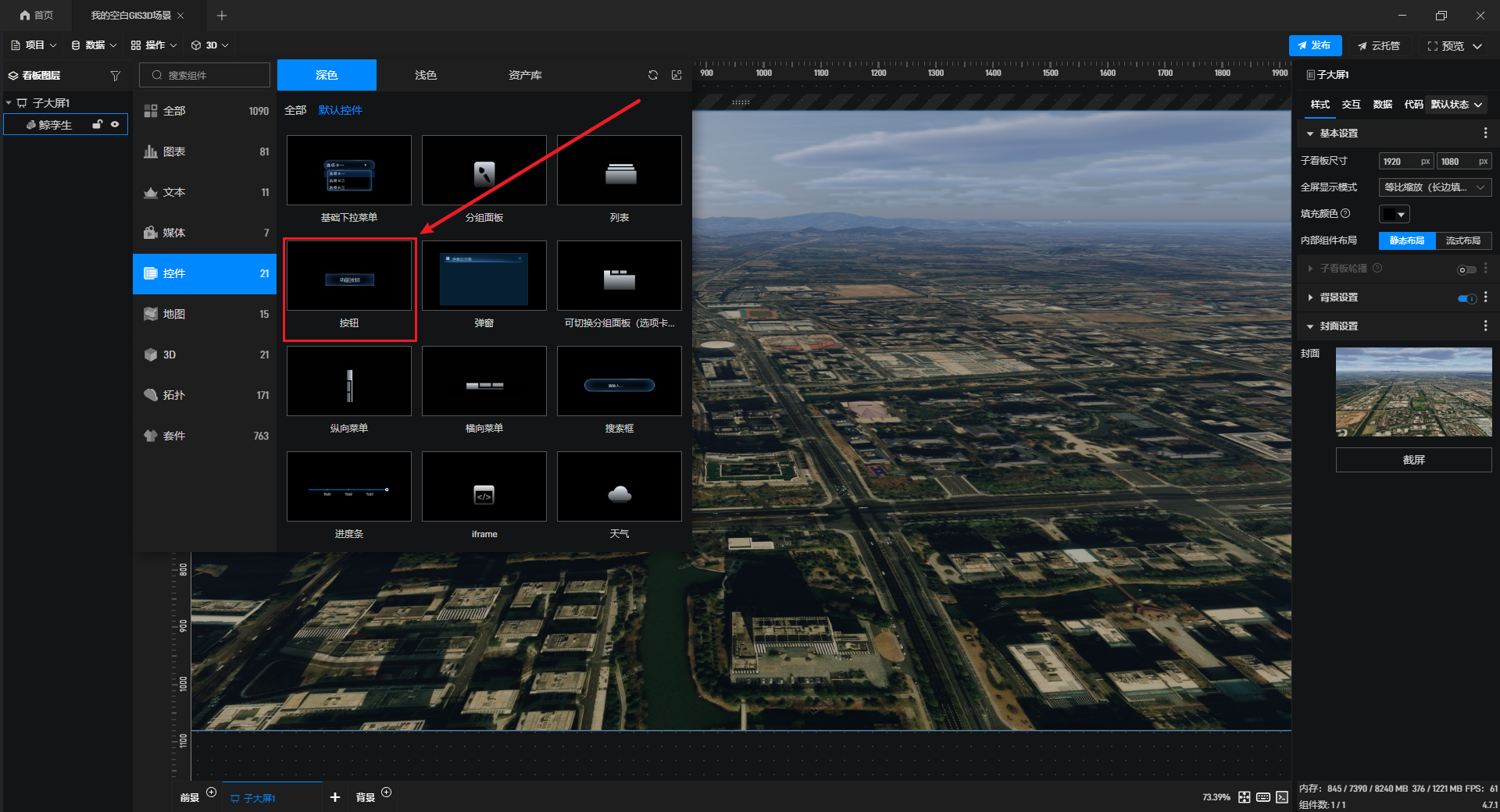 然后在左侧组件库的“控件”中,选择一个“按钮”组件添加。