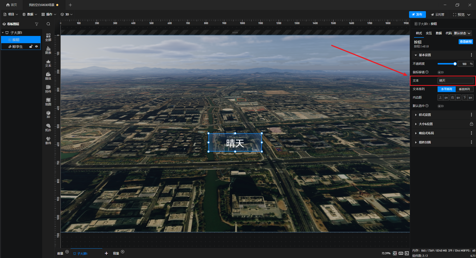 添加完成后,修改“按钮”组件的显示文本,改为“晴天”