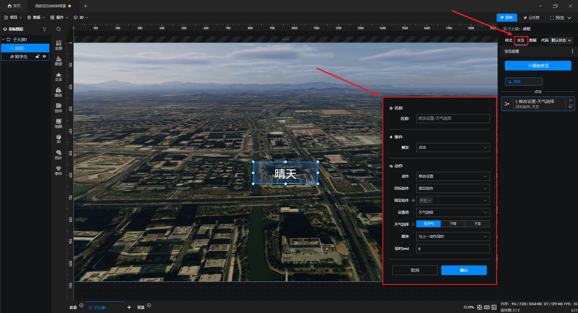 打开“交互”设置,为“按钮”组件添加将场景切换为晴天的交互,如下图所示: