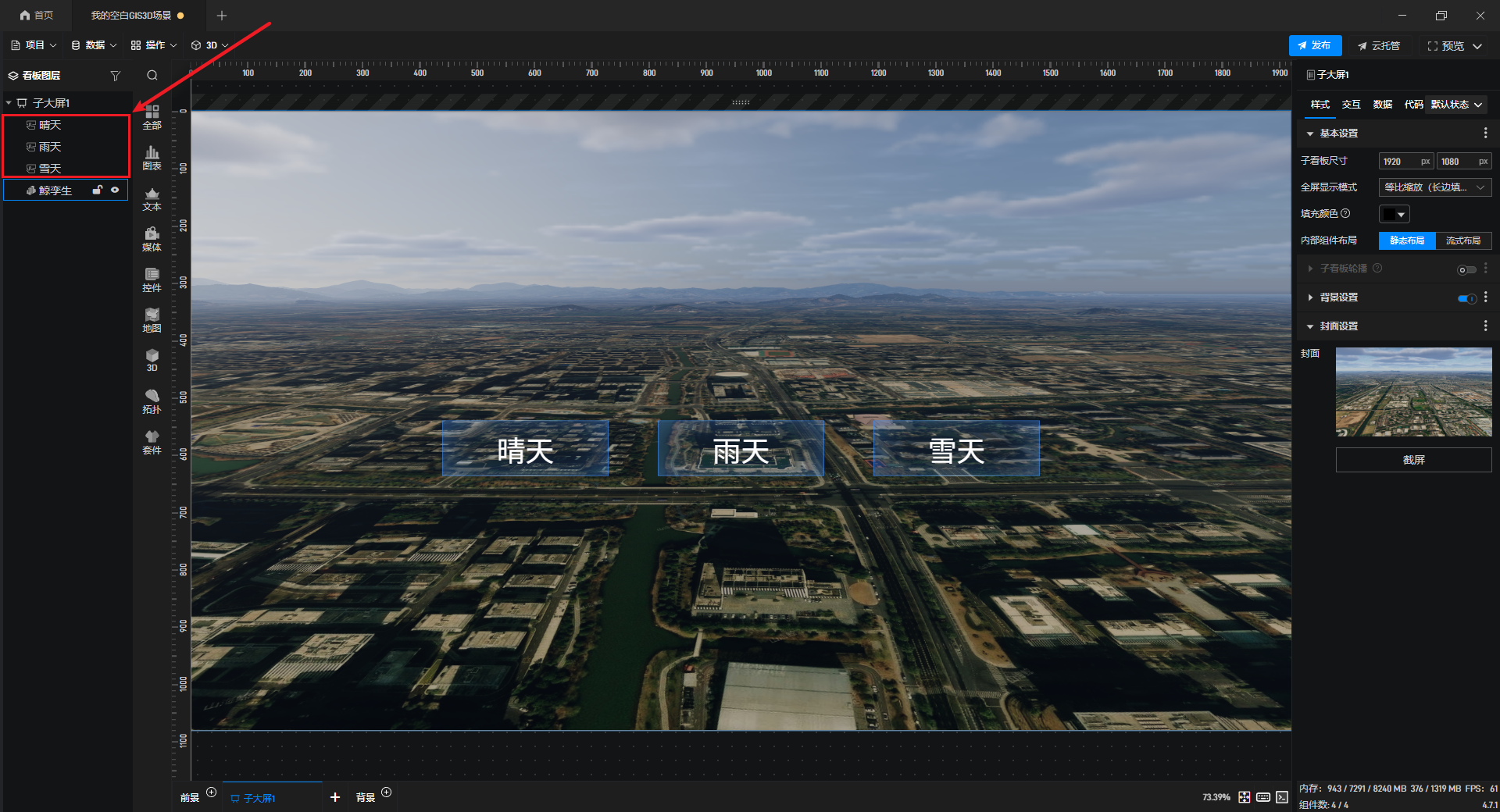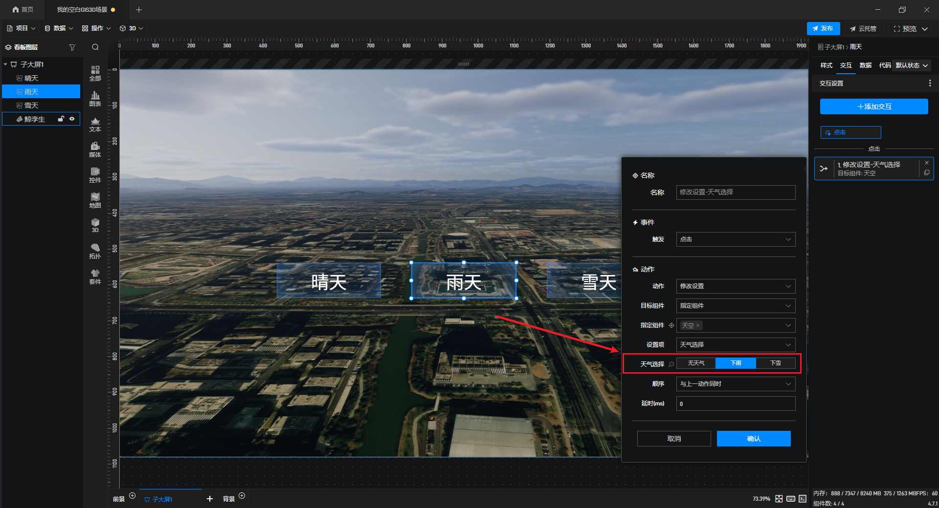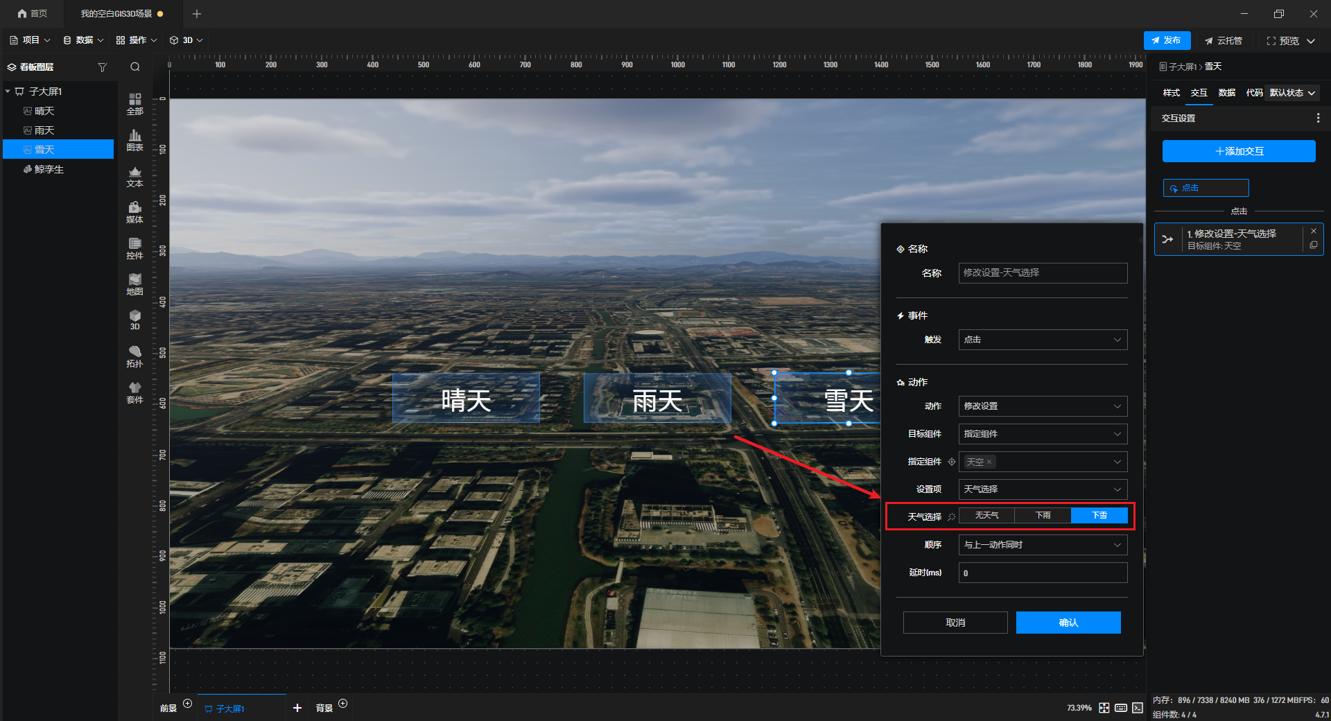 在项目制作过程中,如何快速实现三维场景的天气切换,是很多人都会遇到的需求。其实,通过按钮组件的简单交互设置,就可以轻松完成这一效果。