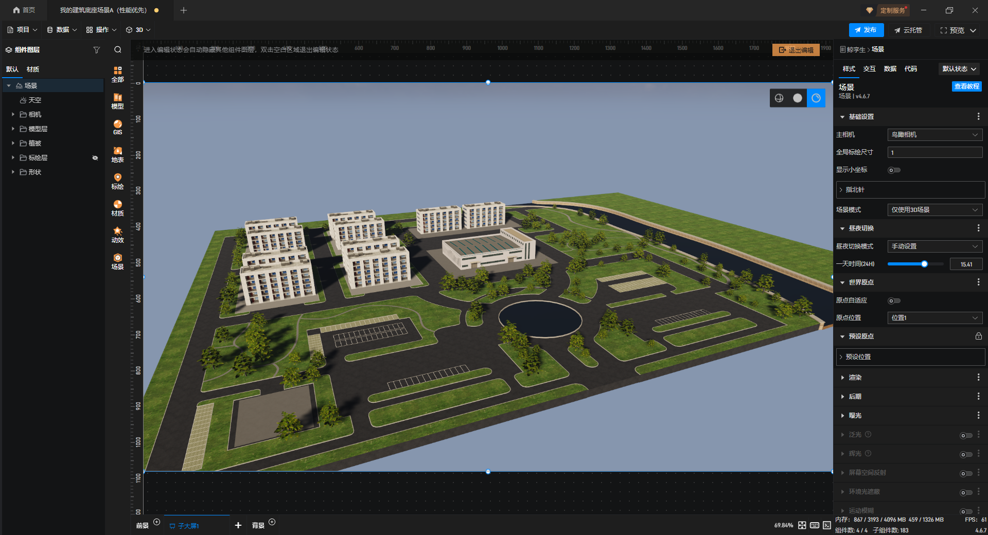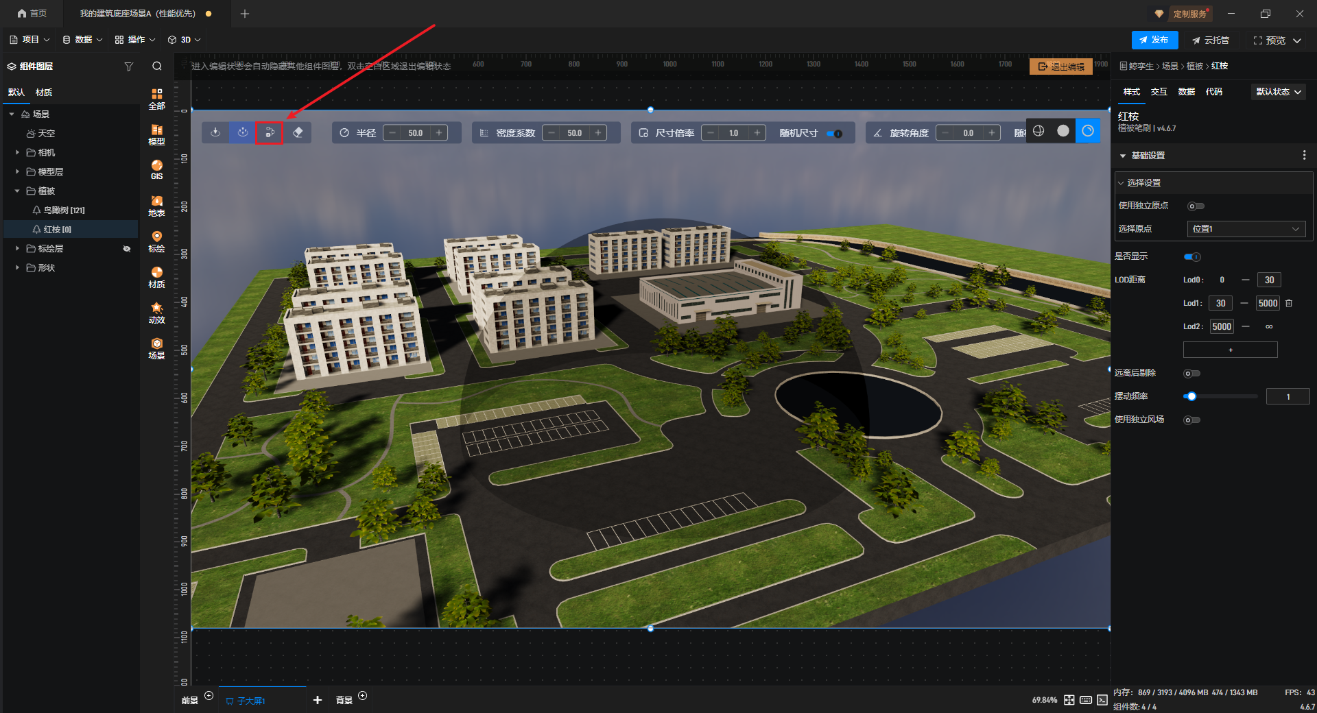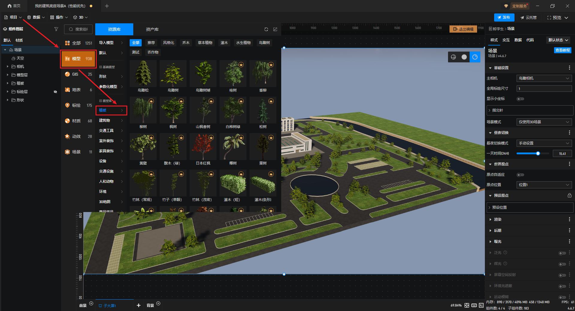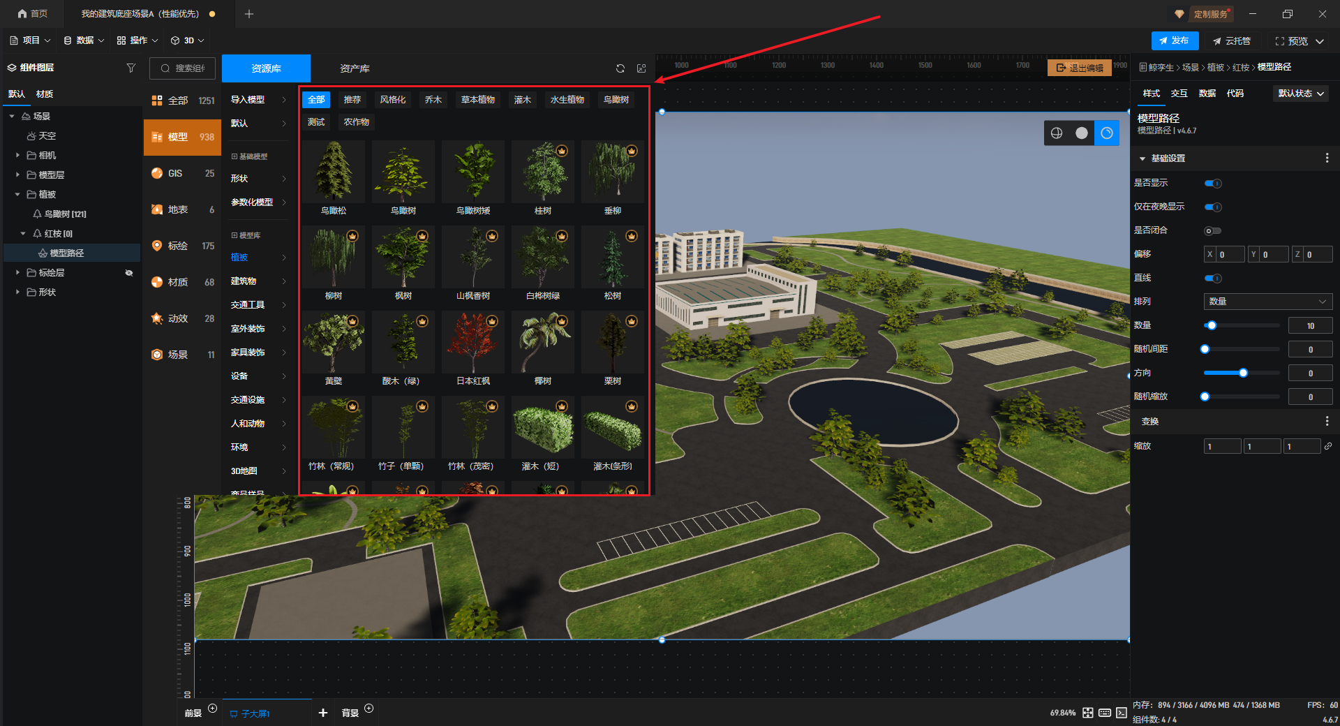 双击鲸孪生进入编辑模式,选择模型库左侧的“模型-植被”