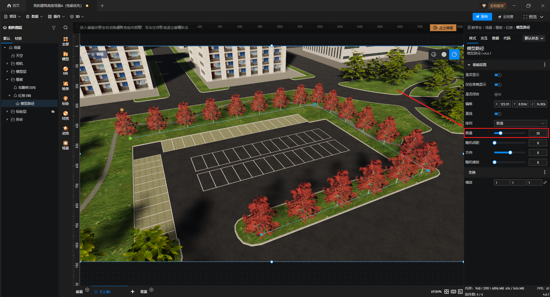 选择“数量”时,可以设置路径上的植被模型数量。