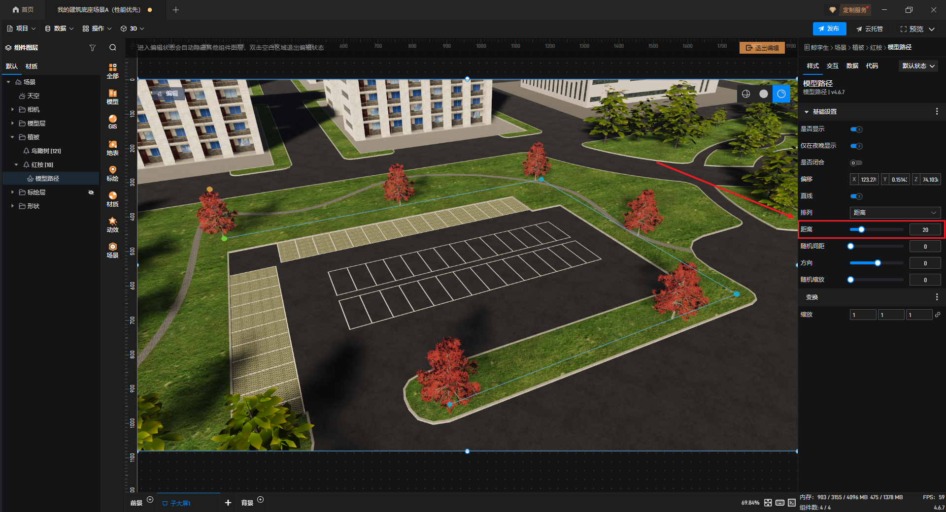 选择“距离”时,可以设置路径上的植被模型间距。