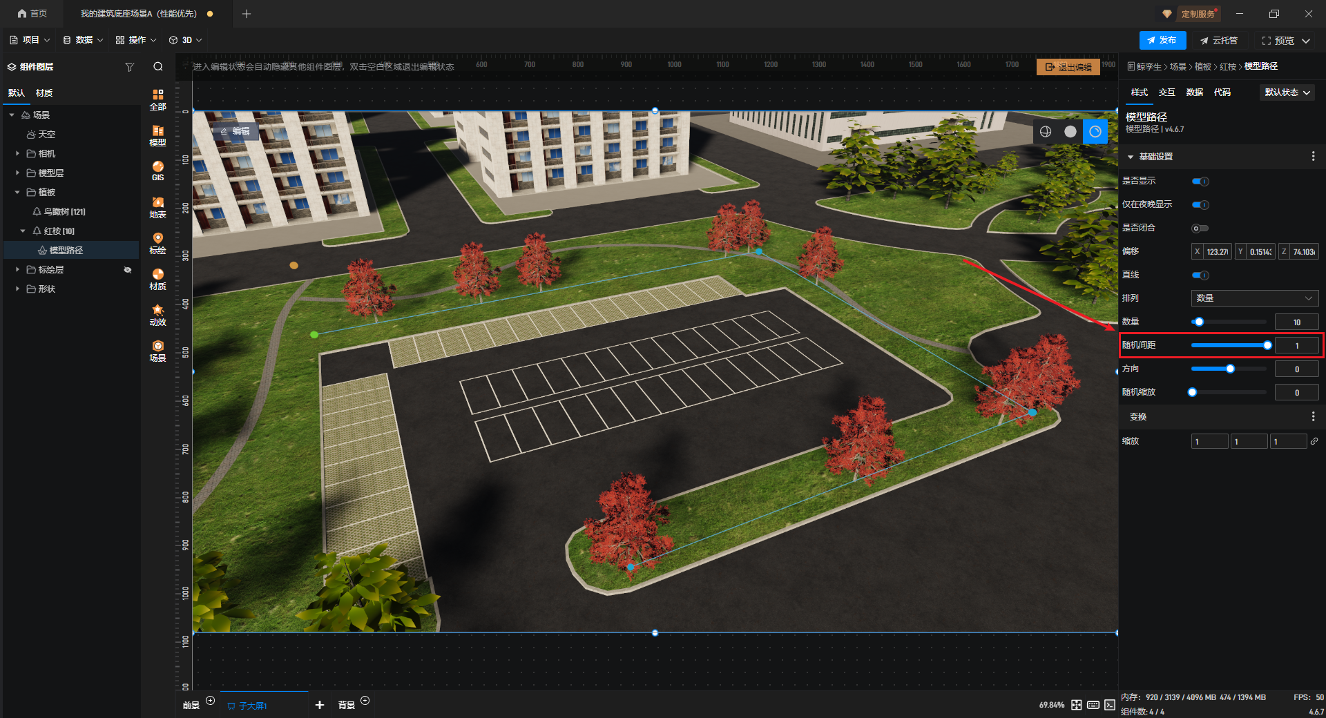 开启“随机间距”后,植被模型会在同一路径上随机排列,“随机间距”数值越高,间距随机范围越大。