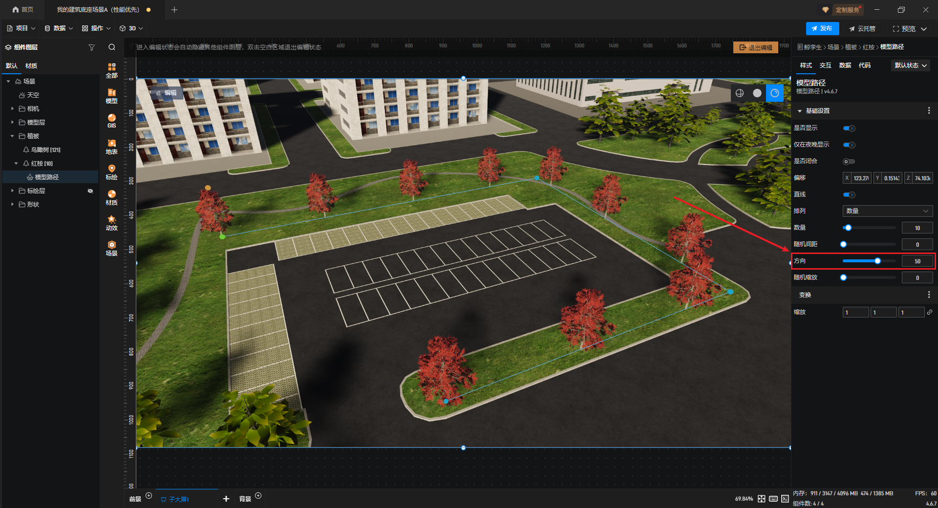 “方向”中可以设置模型路径上所有植被模型的朝向。