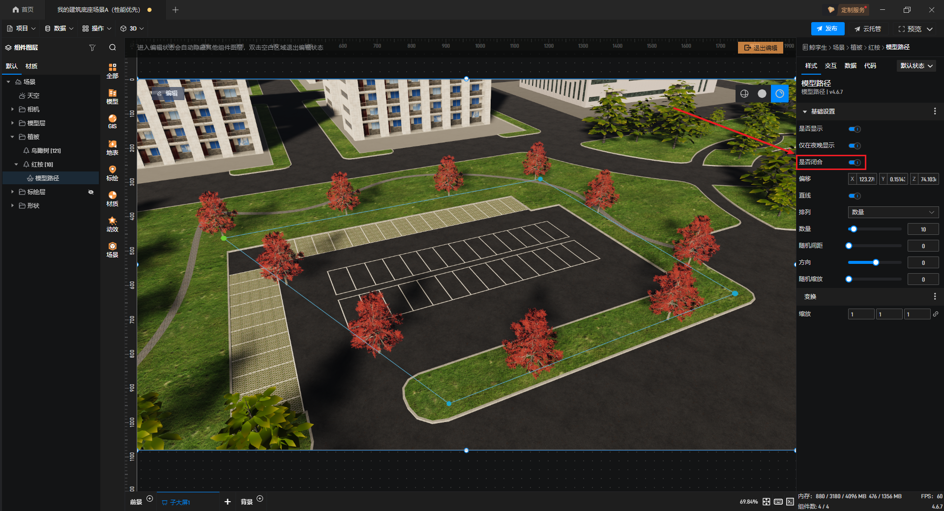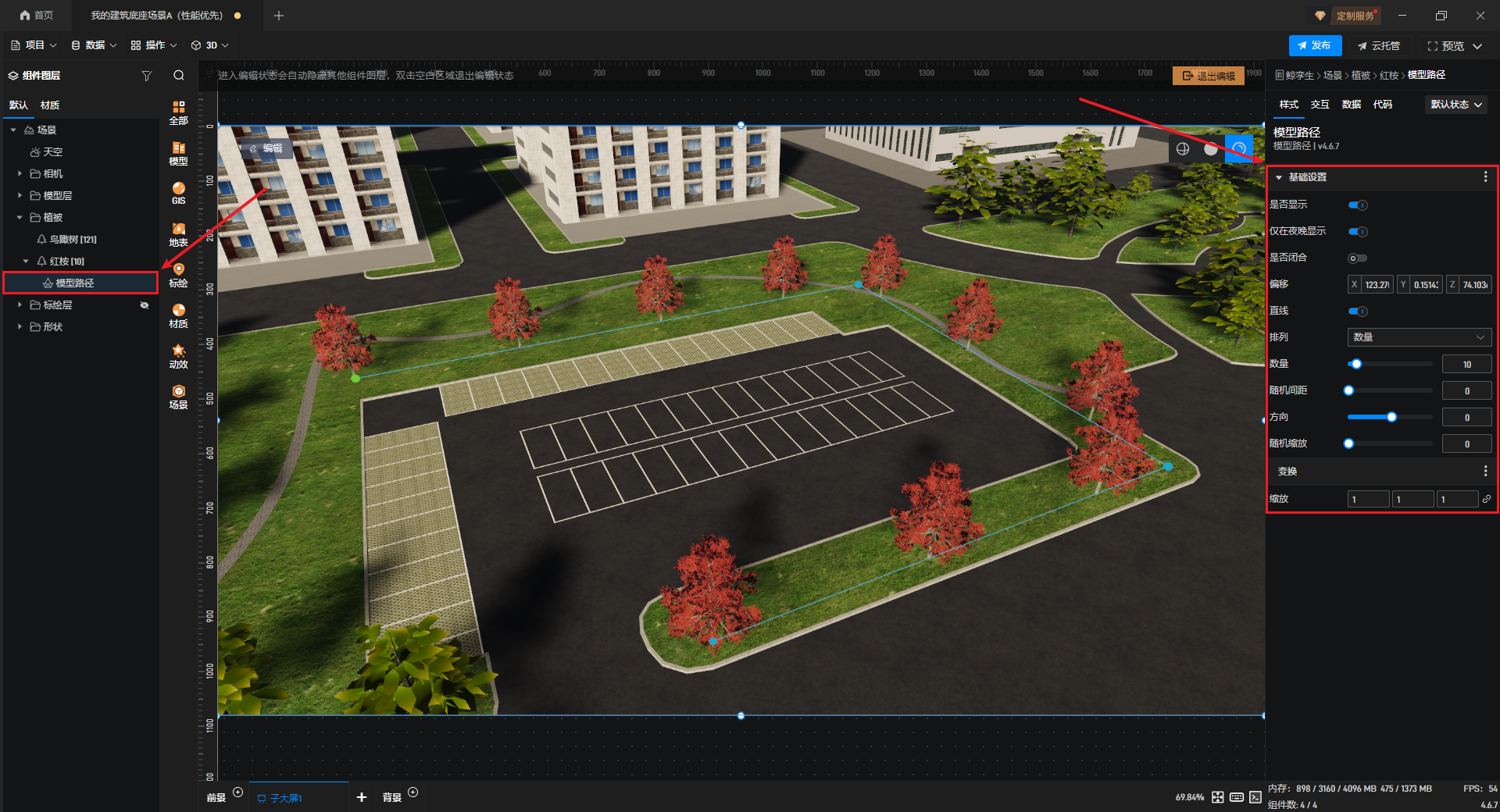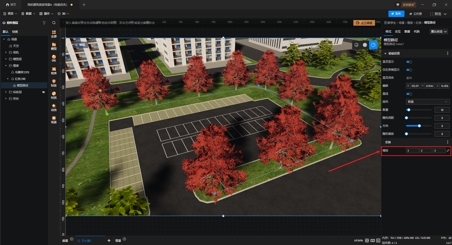 “缩放”中,可以修改模型路径上植被模型的大小。