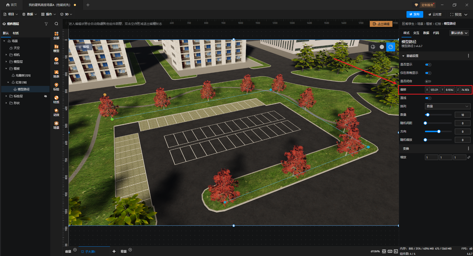 “偏移”设置中可以调整植被模型的路径位置。