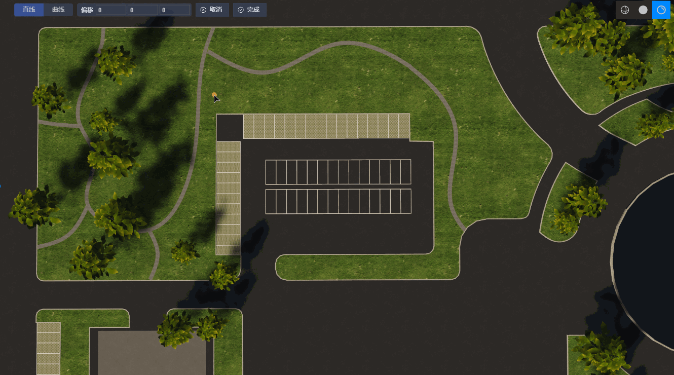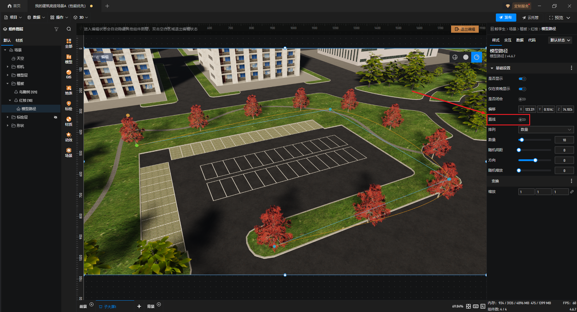 关闭“直线”选项后,路径会根据点位变为曲线,植被位置也会同步变化。