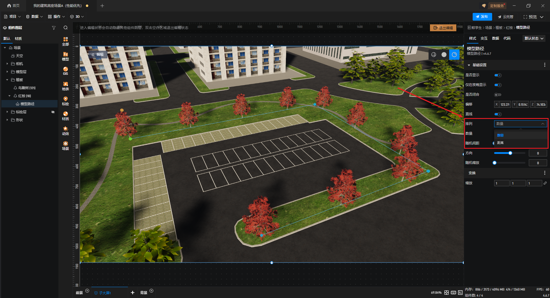排列方式分为“数量”“距离”两种,可根据两种不同方式来设置路径上的树木密度。