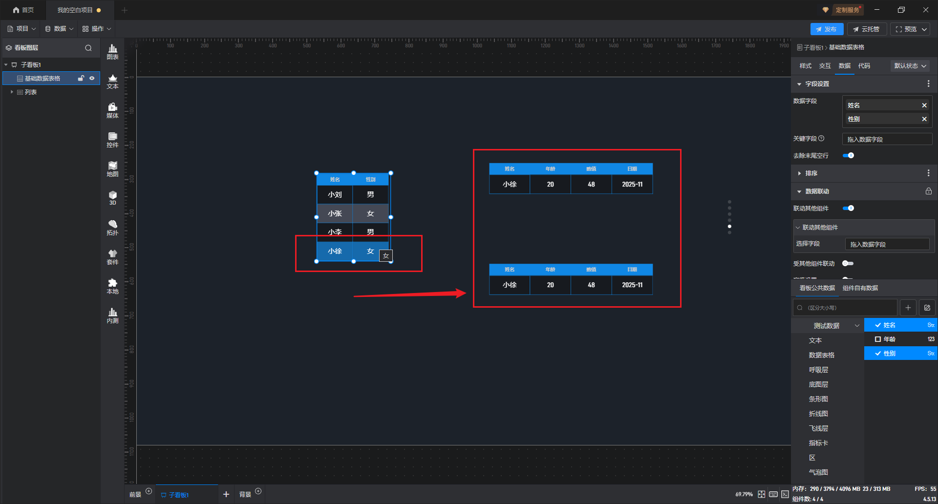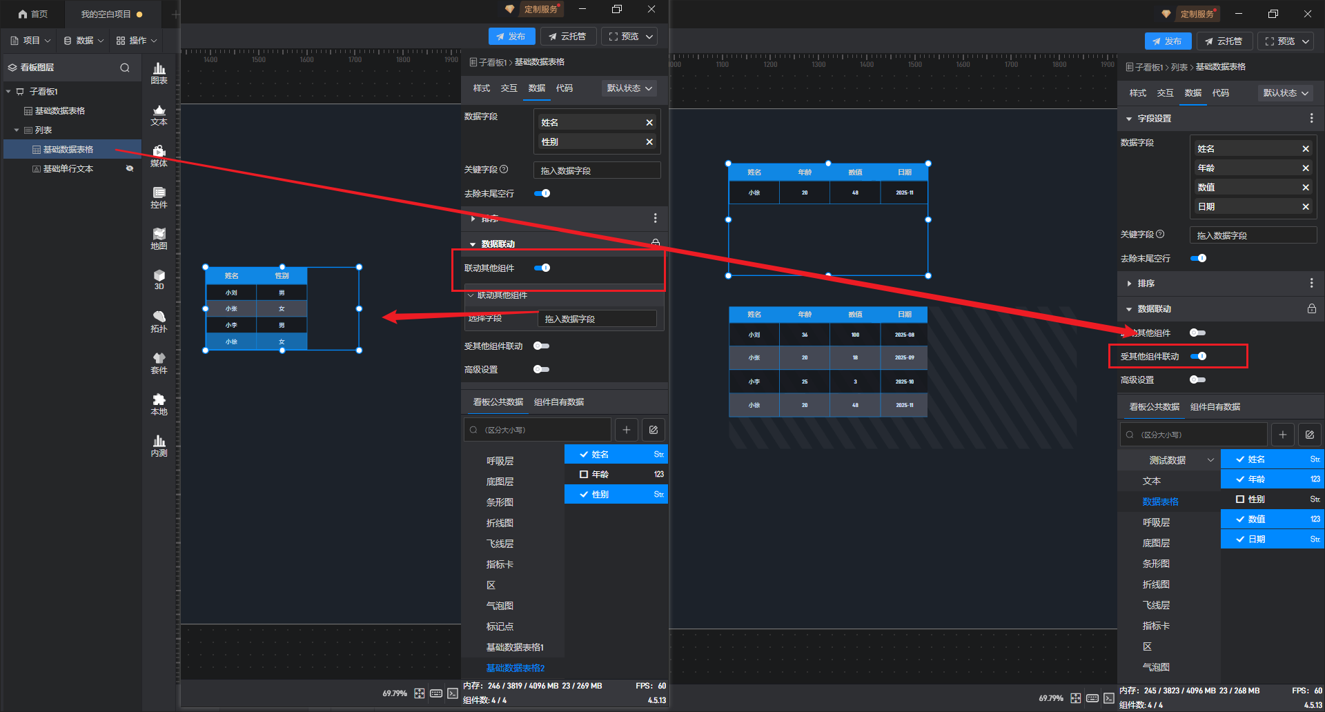 数据联动是实现组件间协同工作的核心功能,山海鲸列表组件可与软件内其他组件(如表格、下拉菜单等)无缝联动,其实现逻辑是通过勾选统一的联动字段,使列表组件与其他组件的数据实时同步。