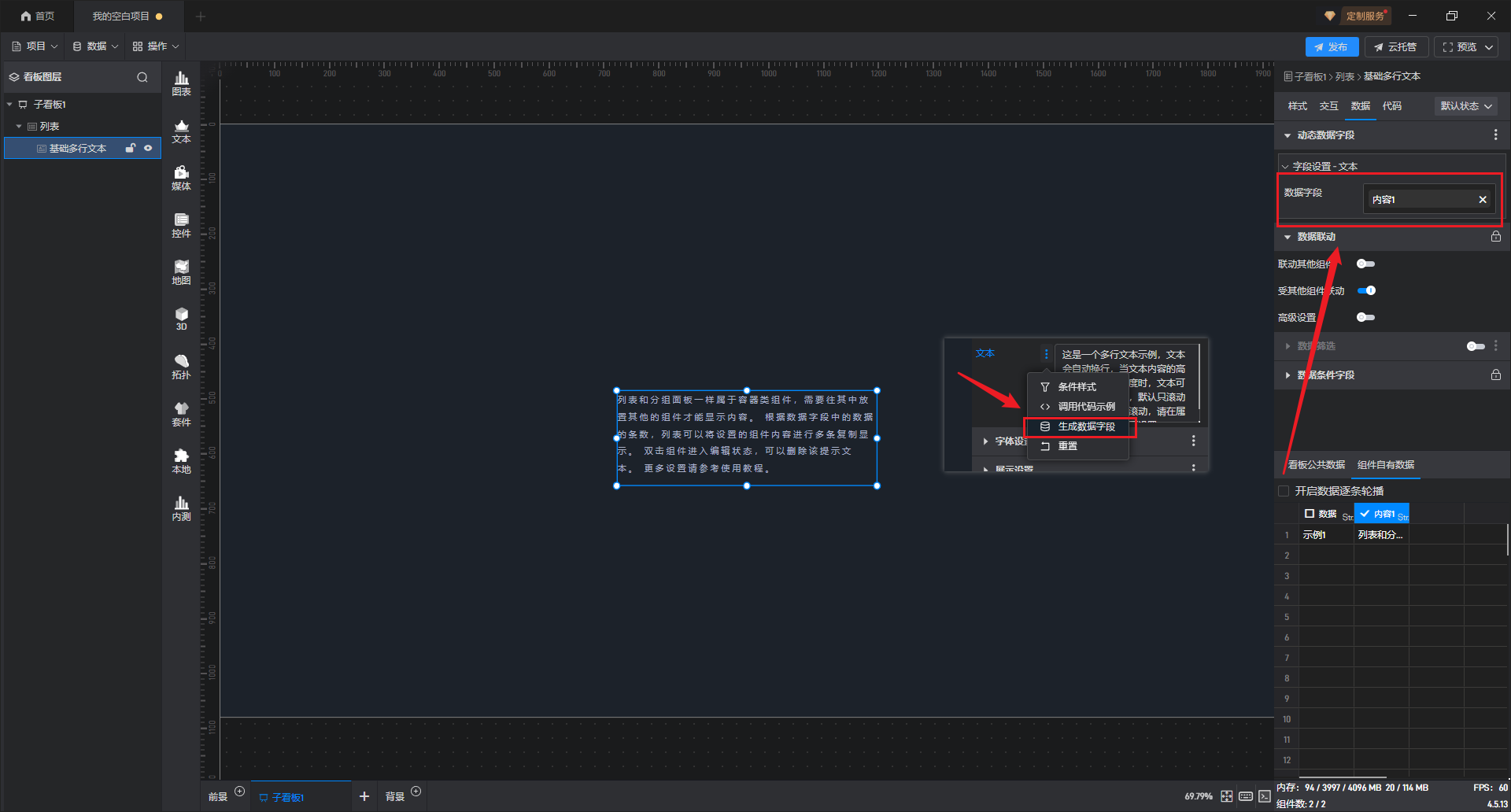 1. 将列表下的组件生成数据字段,并勾选展示字段。