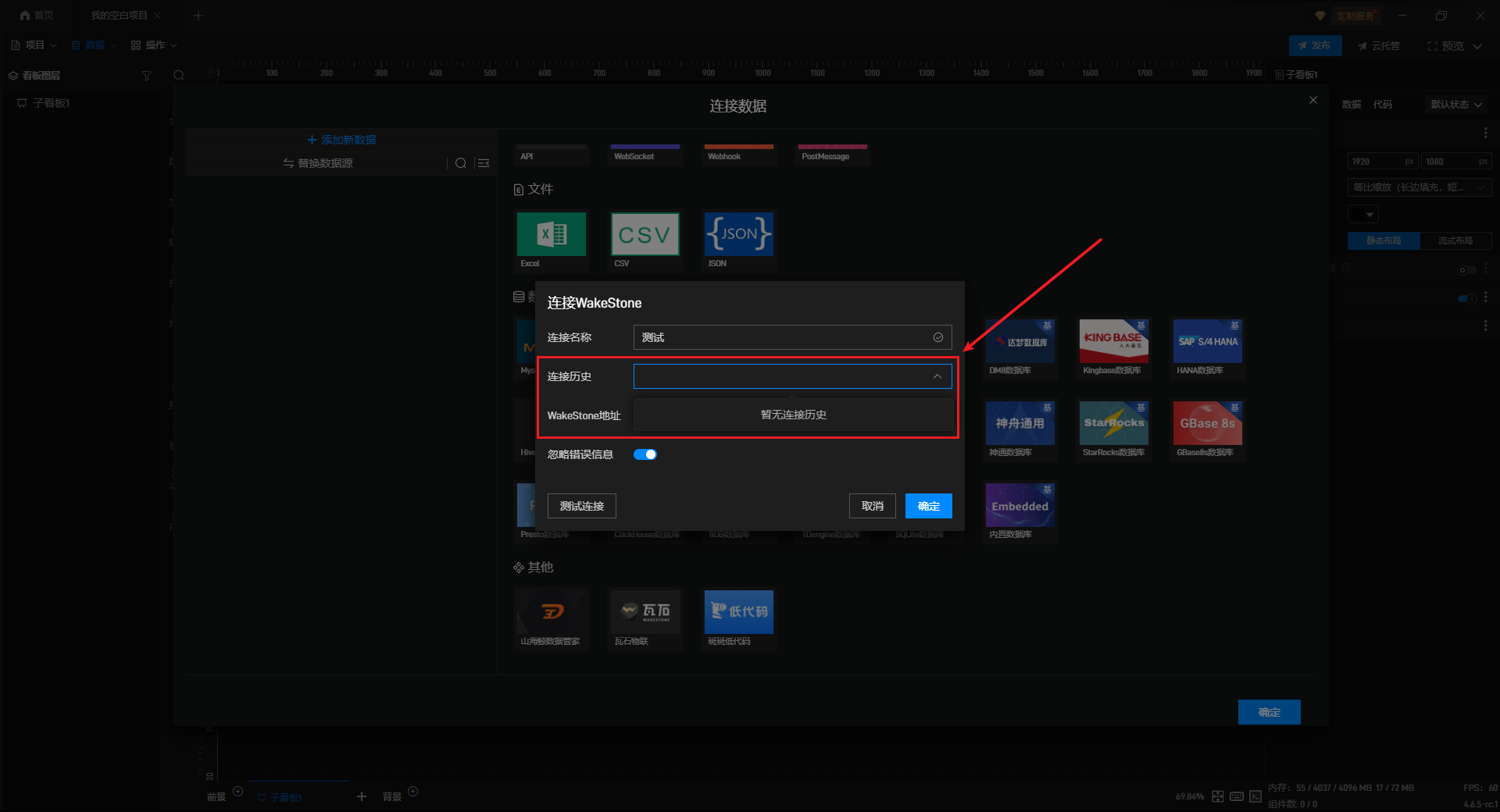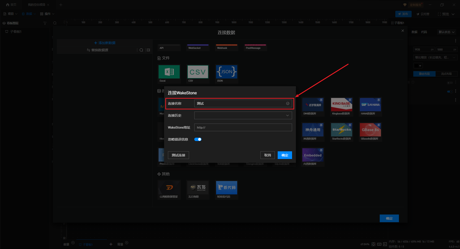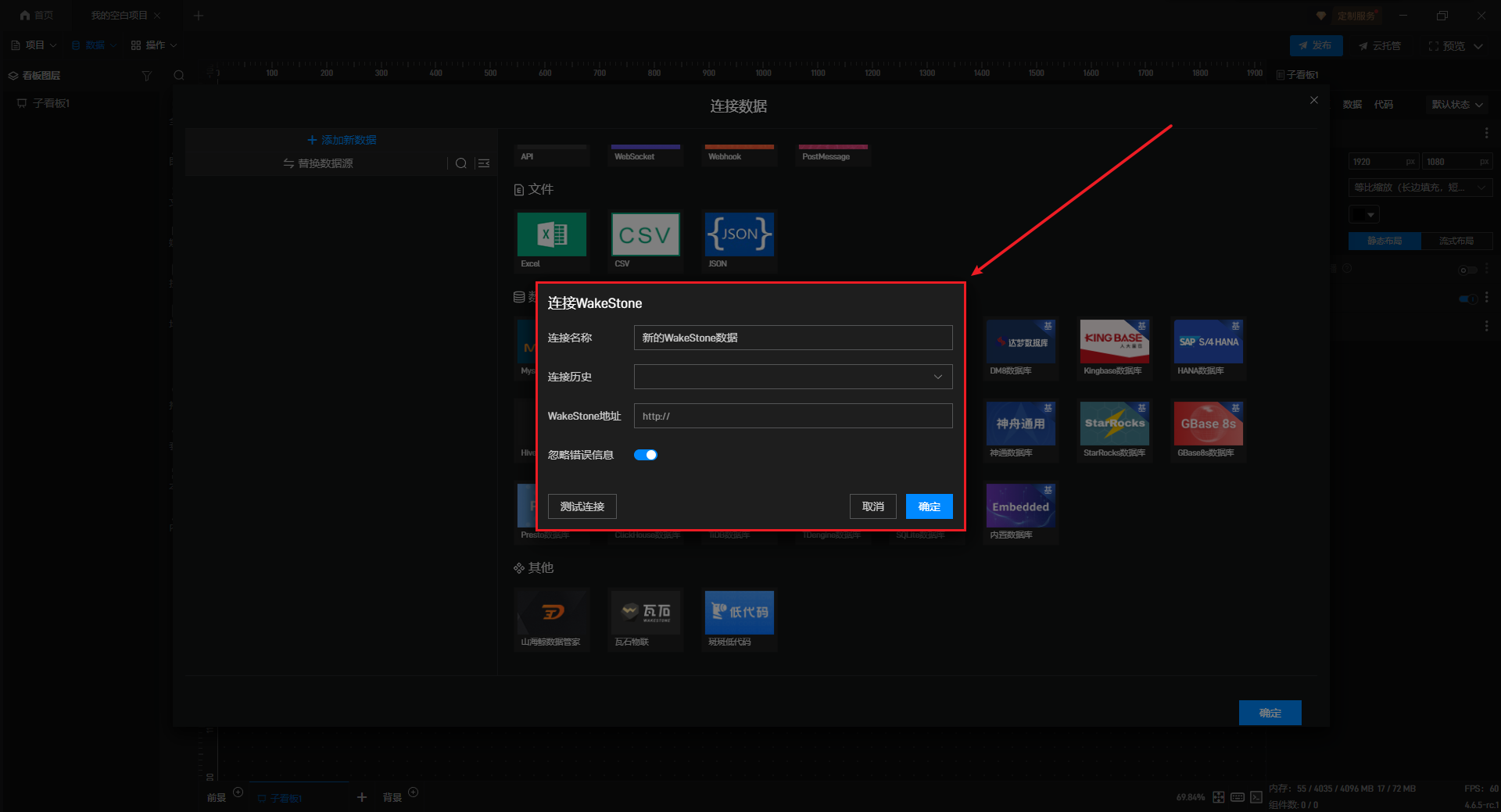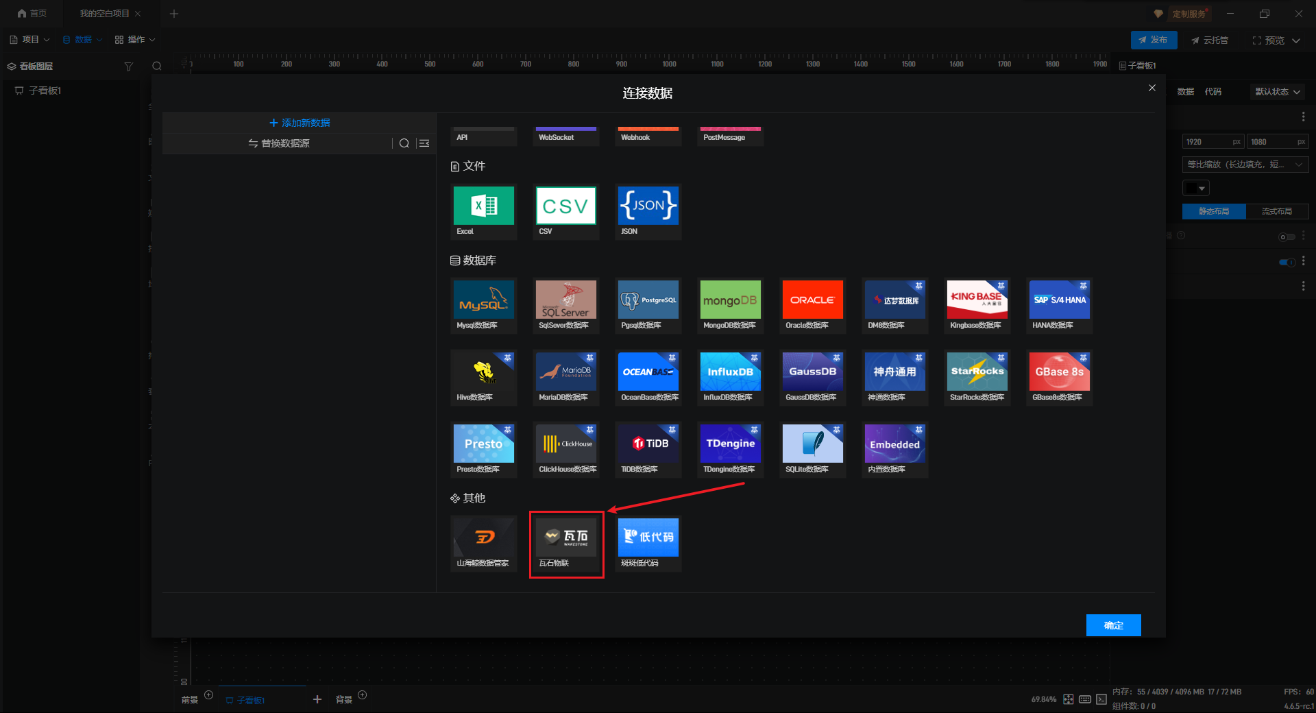 在数据源编辑窗口中,在左侧选择“添加数据”选项卡,然后在右侧点击“其他”分类中的“瓦石物联”按钮。