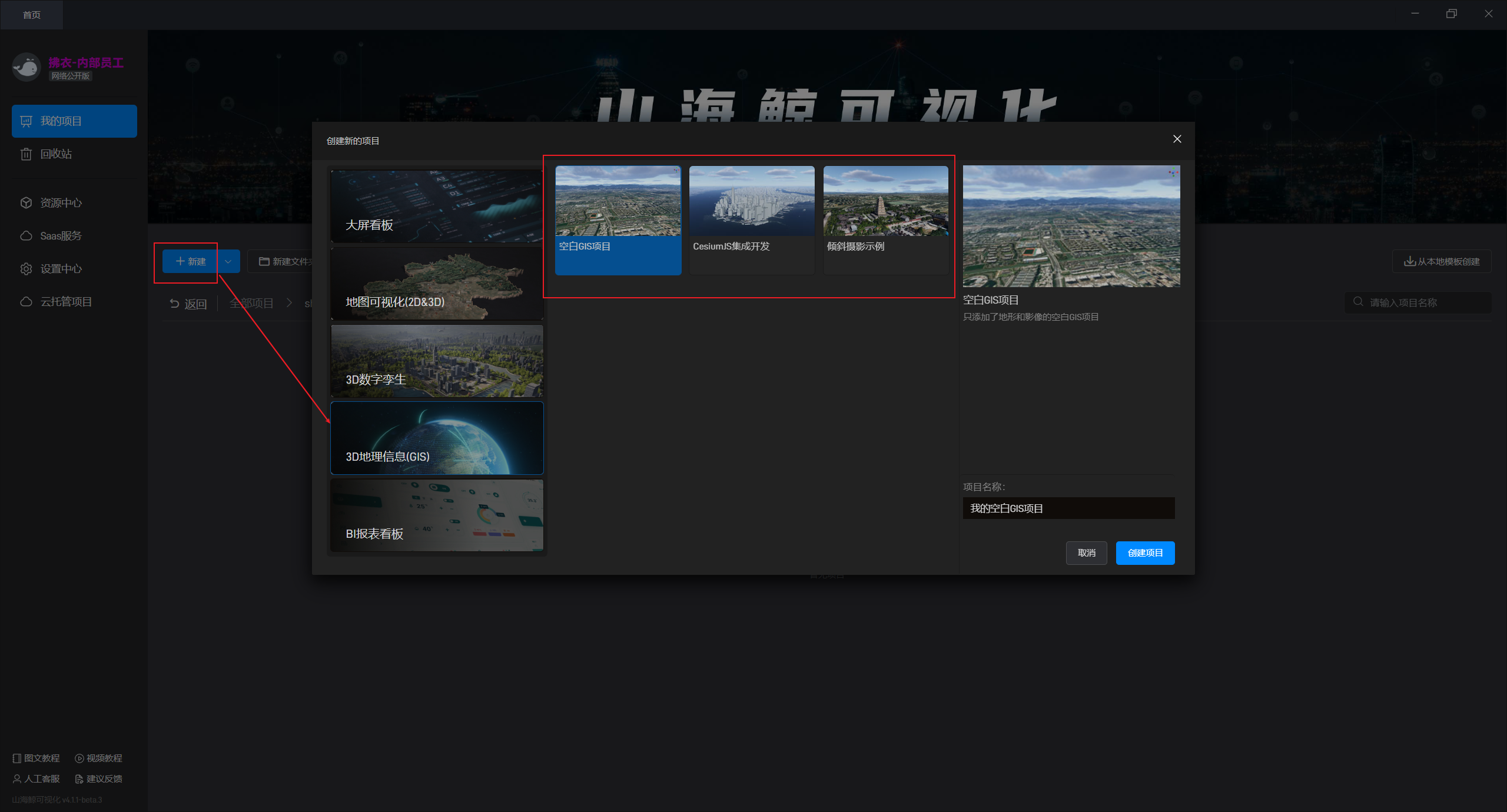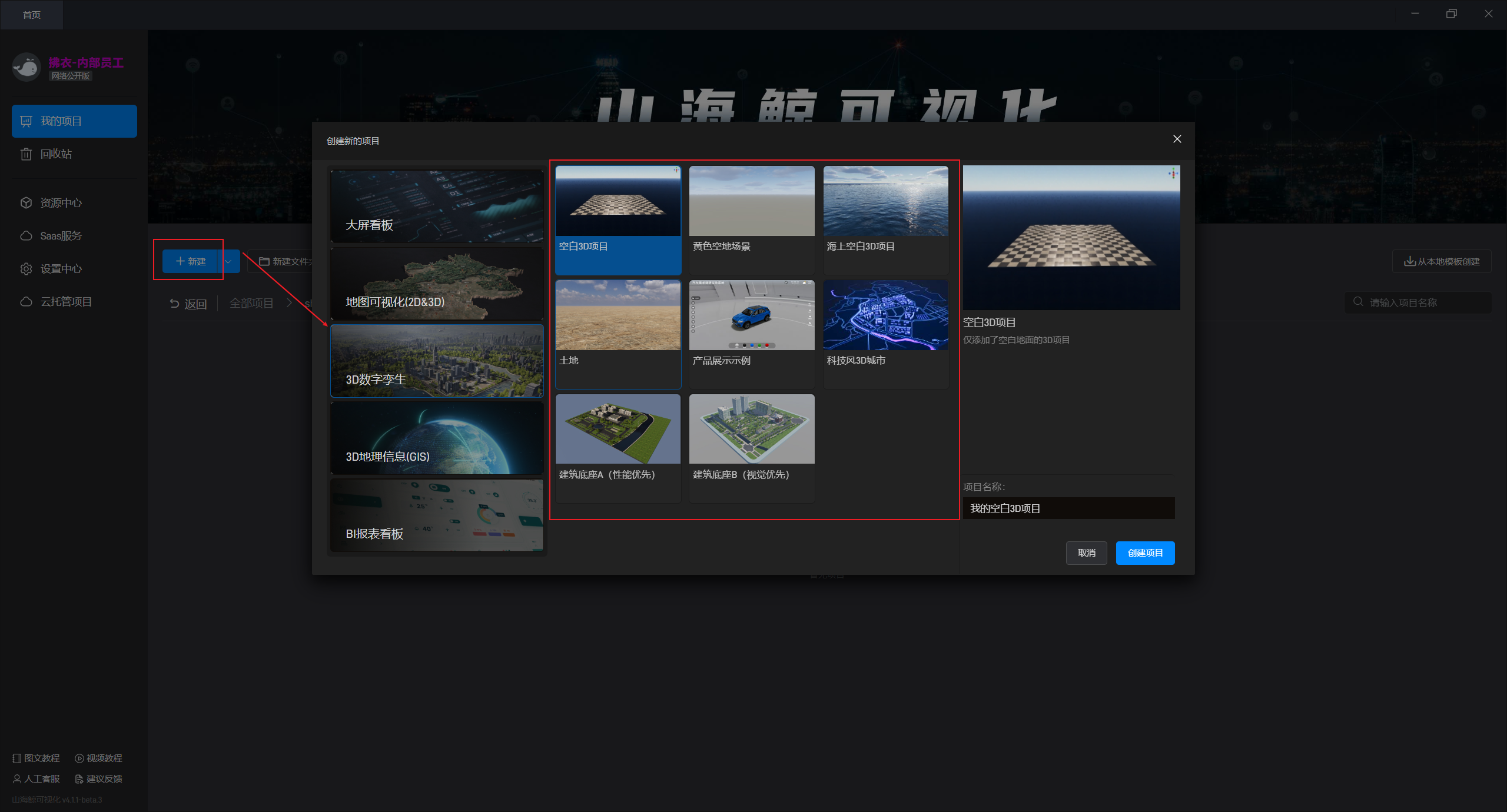 如果对于新建的 3D 项目,可以直接通过点击新建按钮后中选择数字孪生空项目或者 GIS 空项目直接创建带有鲸孪生组件的项目。如下图所示: