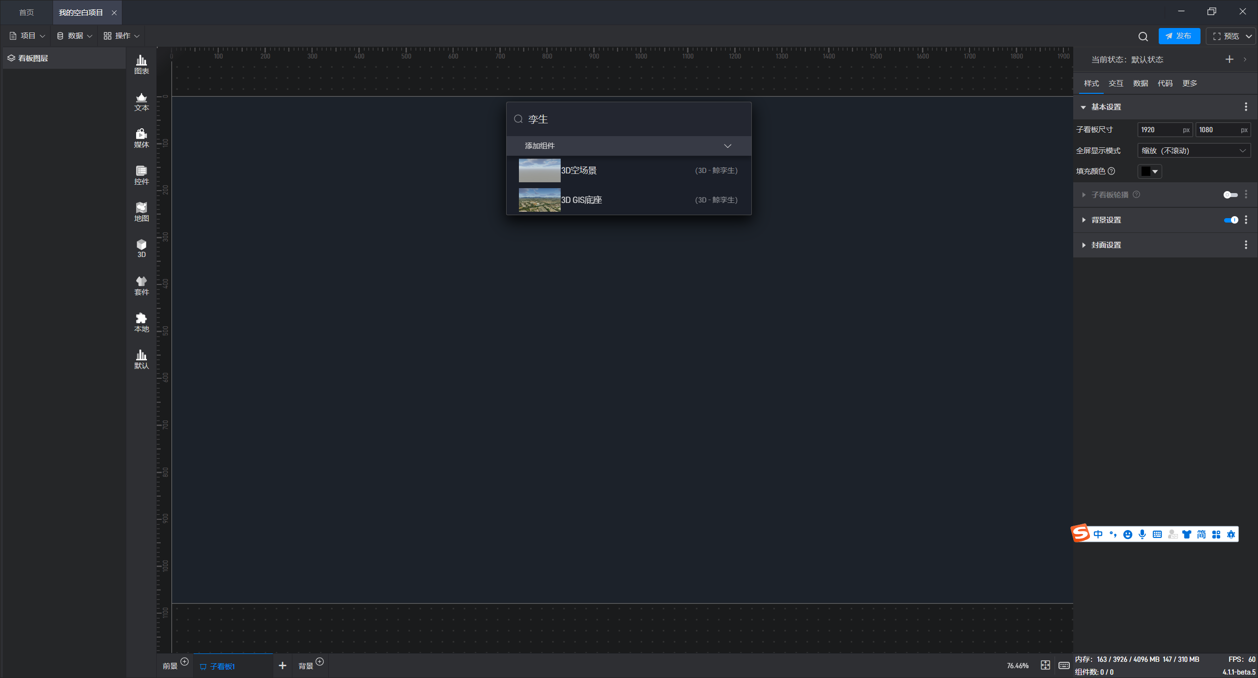 鲸孪生是山海鲸中专门负责 3D 场景搭建和渲染的组件。同其他普通组件不一样的是,鲸孪生可以双击进入编辑,进入编辑之后组件栏也会跟着变化,可以插入更多的 3D 内部的组件。同时为了降低大家的设置的难度,我们也预设了两个基本的样式,一个是完全无设置的鲸孪生组件,一个是添加了 GIS 底图的鲸孪生组件。他们除了默认设置不一样以外,功能是完全一样的。
