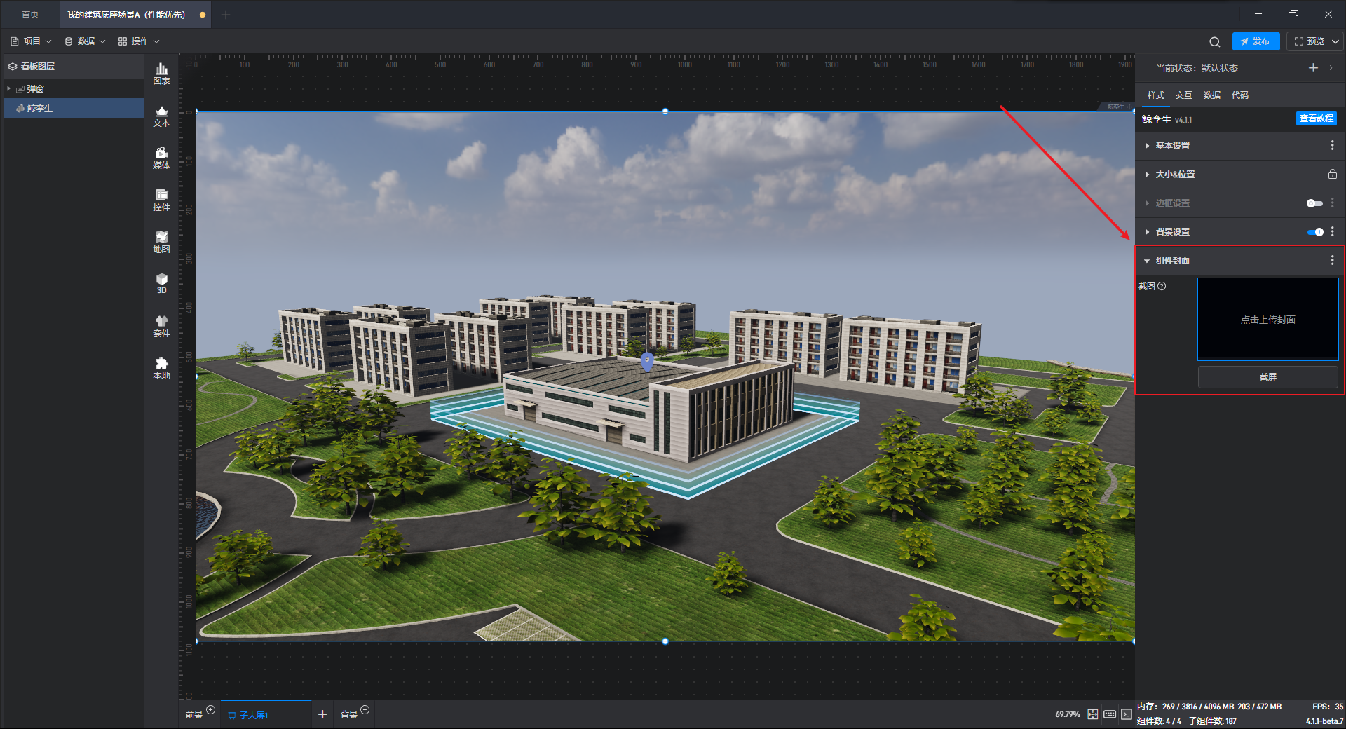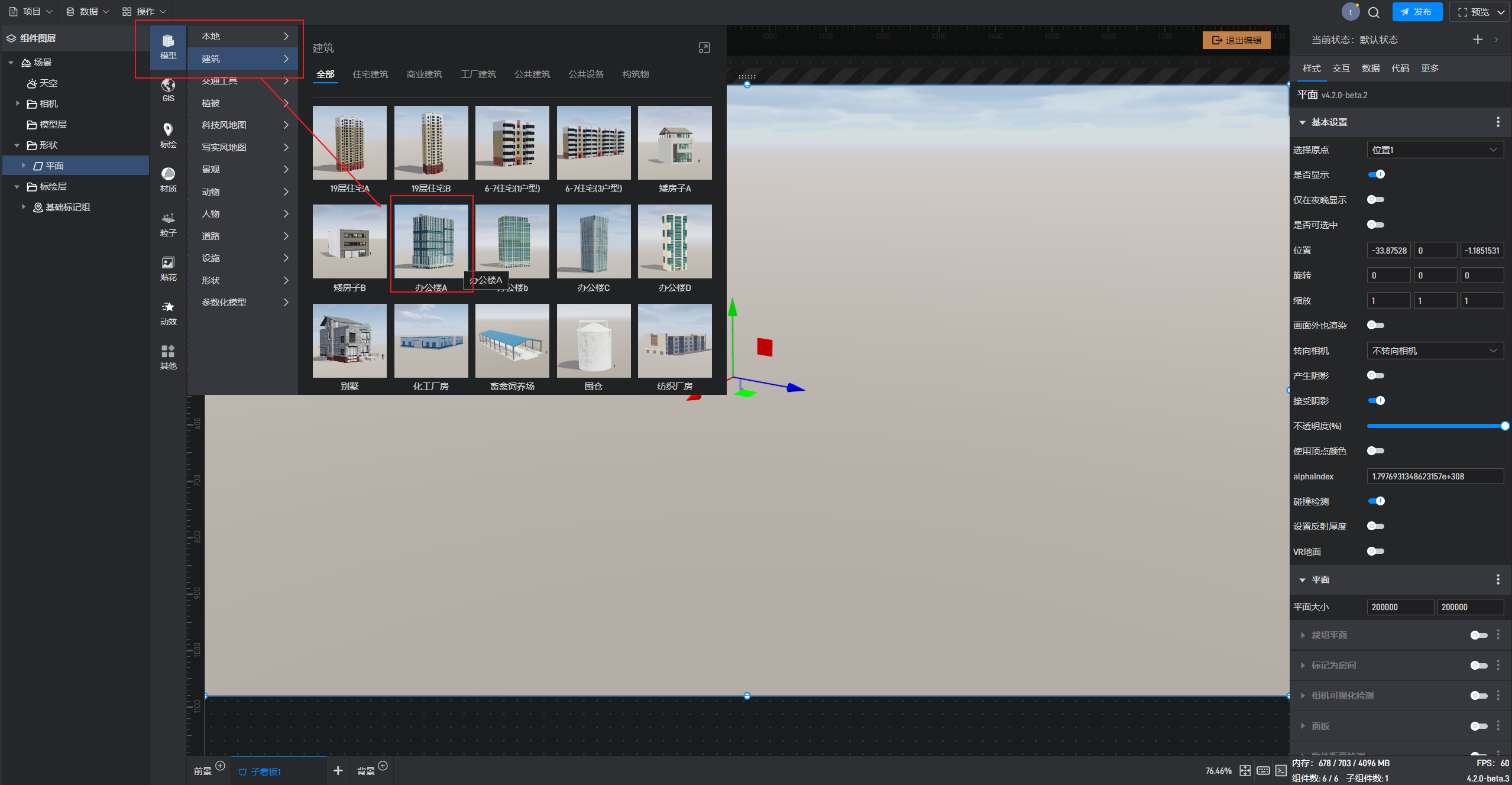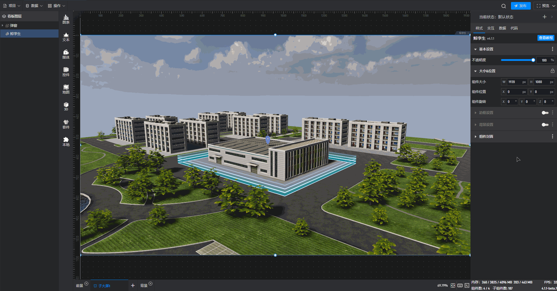 在编辑状态下,软件 3D 画面左侧的组件栏会切换成 3D 的组件栏,这个时候我们可以插入自定义模型,可以插入组件库模型,也可以插入 GIS 元素和其他各种 3D 元素,具体详情可以参考鲸孪生中其他元素的文档。插入后也可以通过托拉拽移动位置或者修改组件材质的属性: