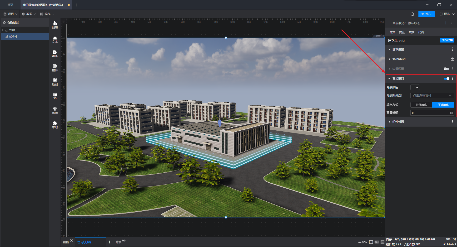 组件默认没有背景颜色,如果需要设置背景颜色,可以在此处进行设置,也可以将背景设置为一张图片或视频,可以选择填充方式和模糊程度。鲸孪生组件一般不需要进行背景设置。